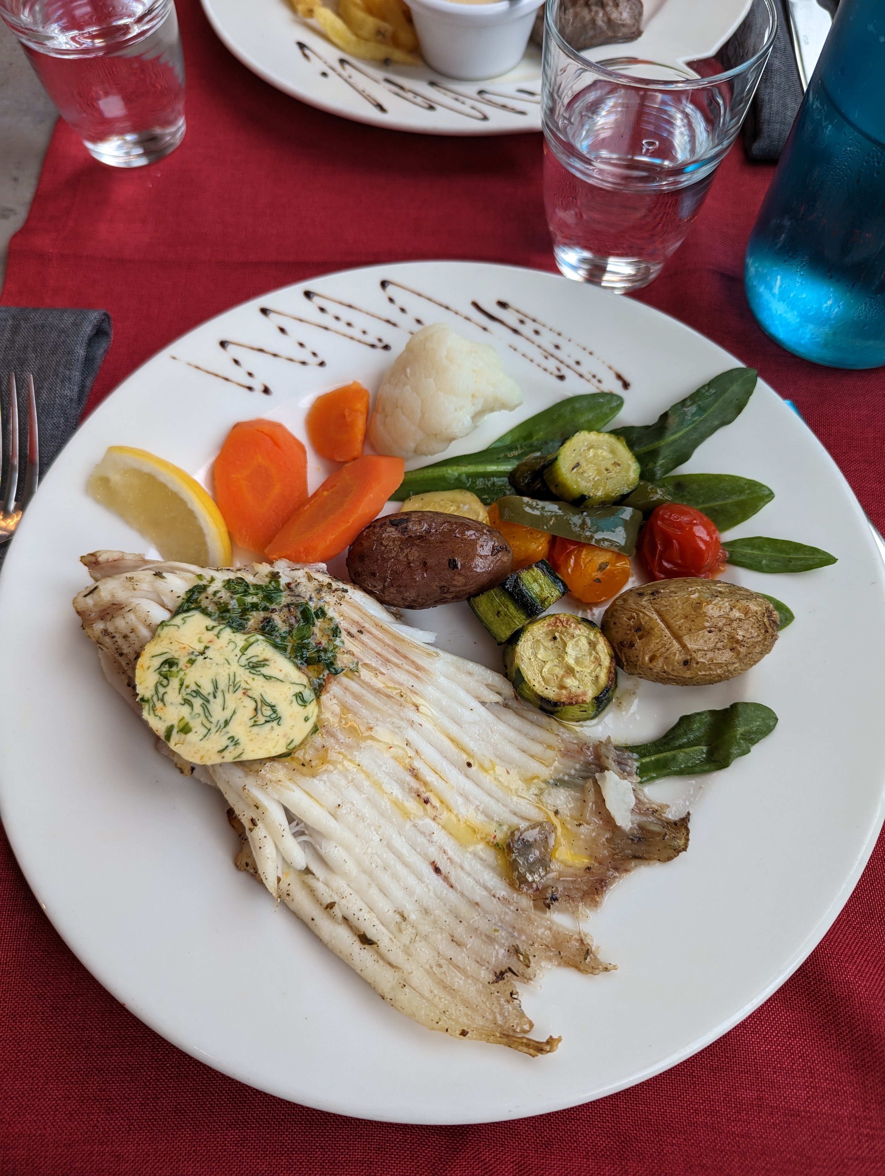 Bon restaurant. Les produits sont frais et de qualités. Dos de cabillaud cuit en papillotte et petits légumes excellents. Les aiguillettes de poulet panés dans le menu enfant sont faits maison. Personnel agréable.