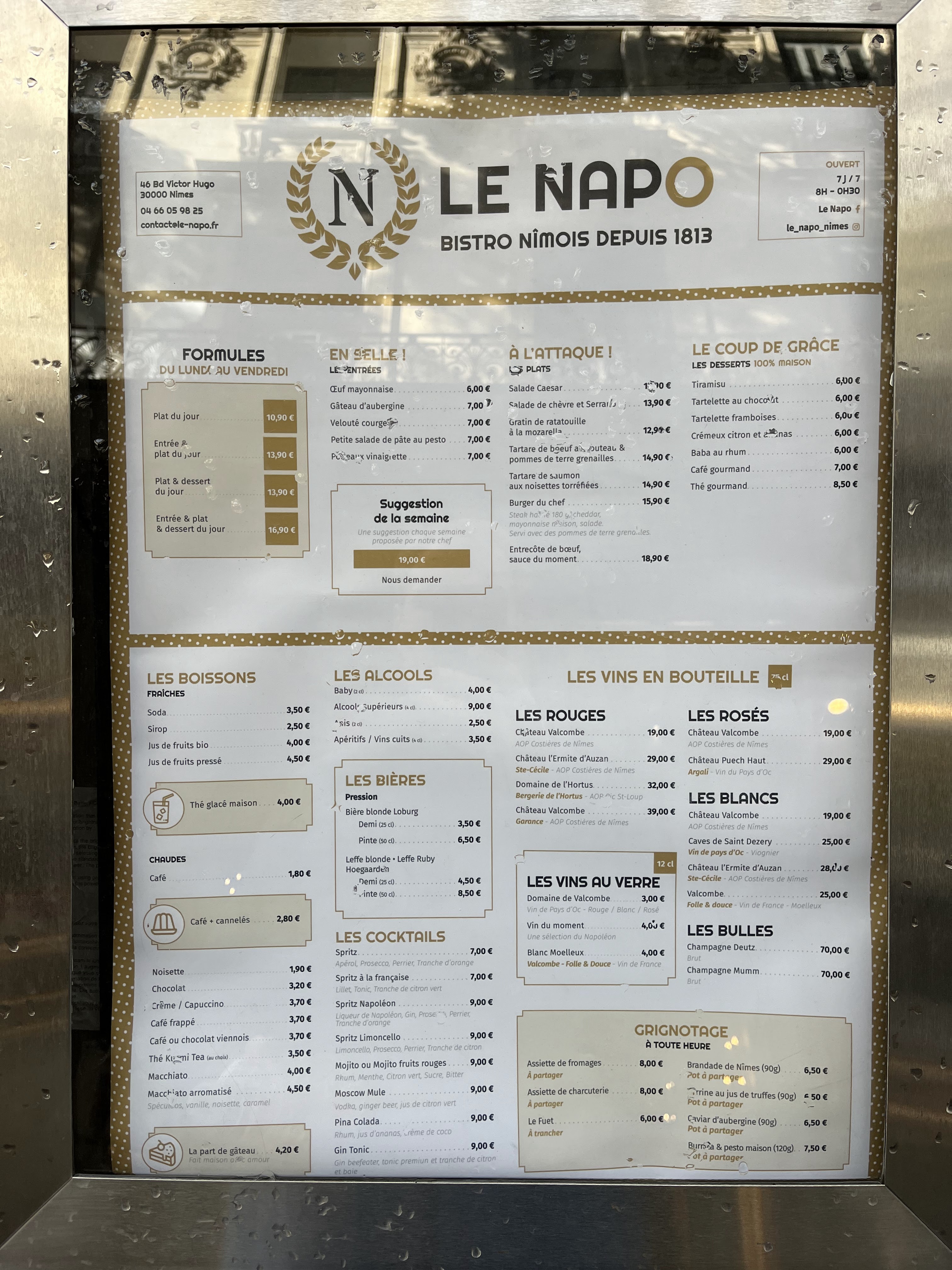 Alors, pour un nimois, le Napoléon ça signifiait quelque chose. Mais quand on y rentre avec sa mère et ses enfants, après 18h00, et qu'on se fait un plaisir de commander chocolat chaud et tisane, et qu'on s'entend dire ''on ne sert plus de boisson chaude après 18h00'', il faut changer de nom, ce n' est plus un café, mais un distributeur de canettes. L'indeniable beauté du cadre y perd tout son charme ; je vois deux anciens se faire refuser un café à côté, incrédules. Le serveur est embarrassé quand on demande pourquoi on ne peut pas avoir de boisson chaude, qui plus est aux premières fraîcheurs de l'hiver. J'entrevois bien la pratique illicite à pousser vers la consommation de ce qui est plus cher. Mais en plus de la (très) discutable pratique, il n'y a pas d'affichage pour assumer. Alors Napoléon, c'était pour avant. Renommez le Rantanplan, ce sera plus en cible pour de l'eau fraiche après 18h00.