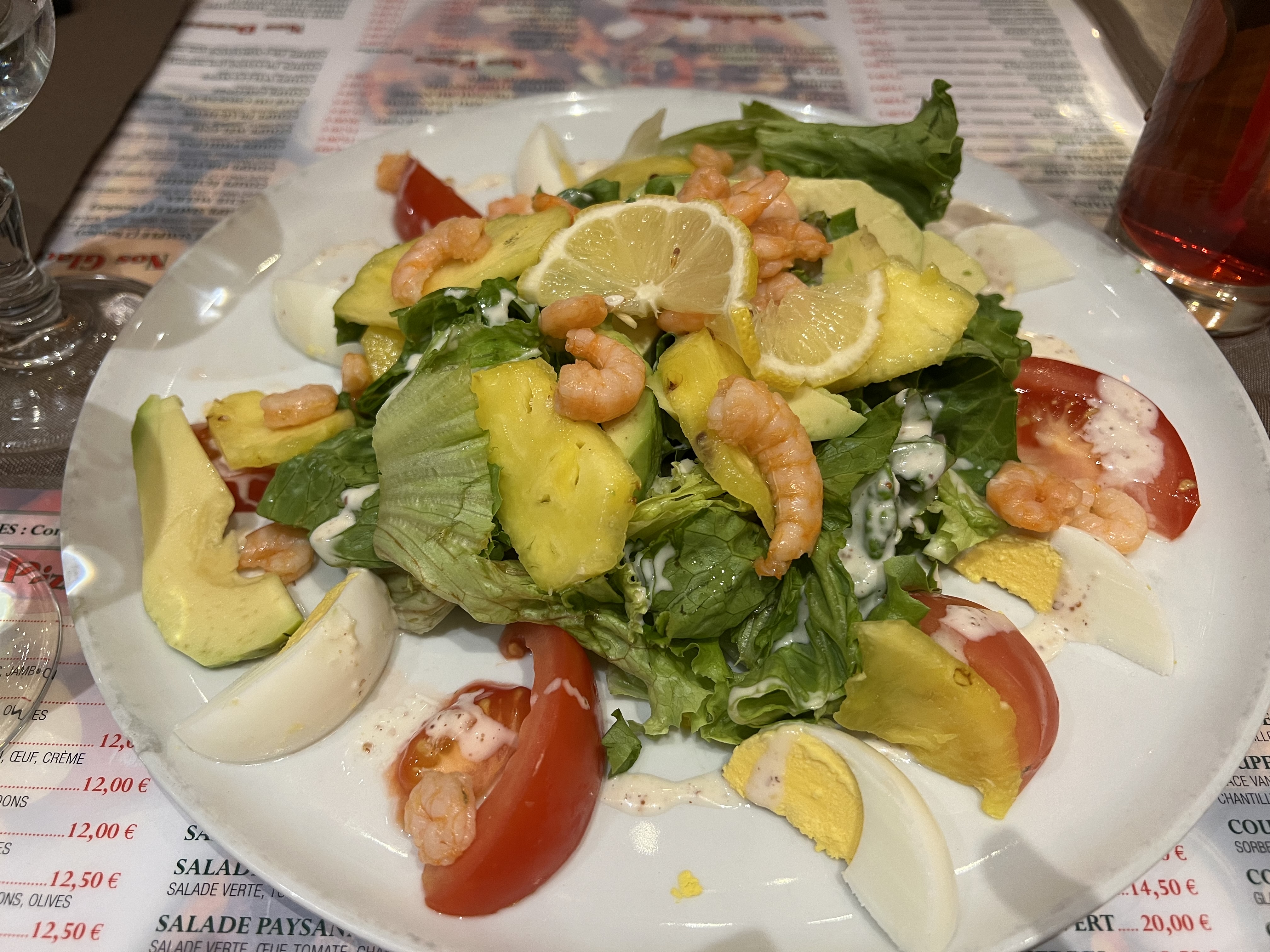 Salade haïtienne qui n’en avait que le nom 6 malheureuses petites crevettes décongelées une demi tomate un œuf 4 minuscules tranches d’avocat pas mûr 3 bouts d’ananas 😱😱😡beaucoup de salade verte 15€ la serveuse caresse le chien d’à côté et viens nous servir juste après