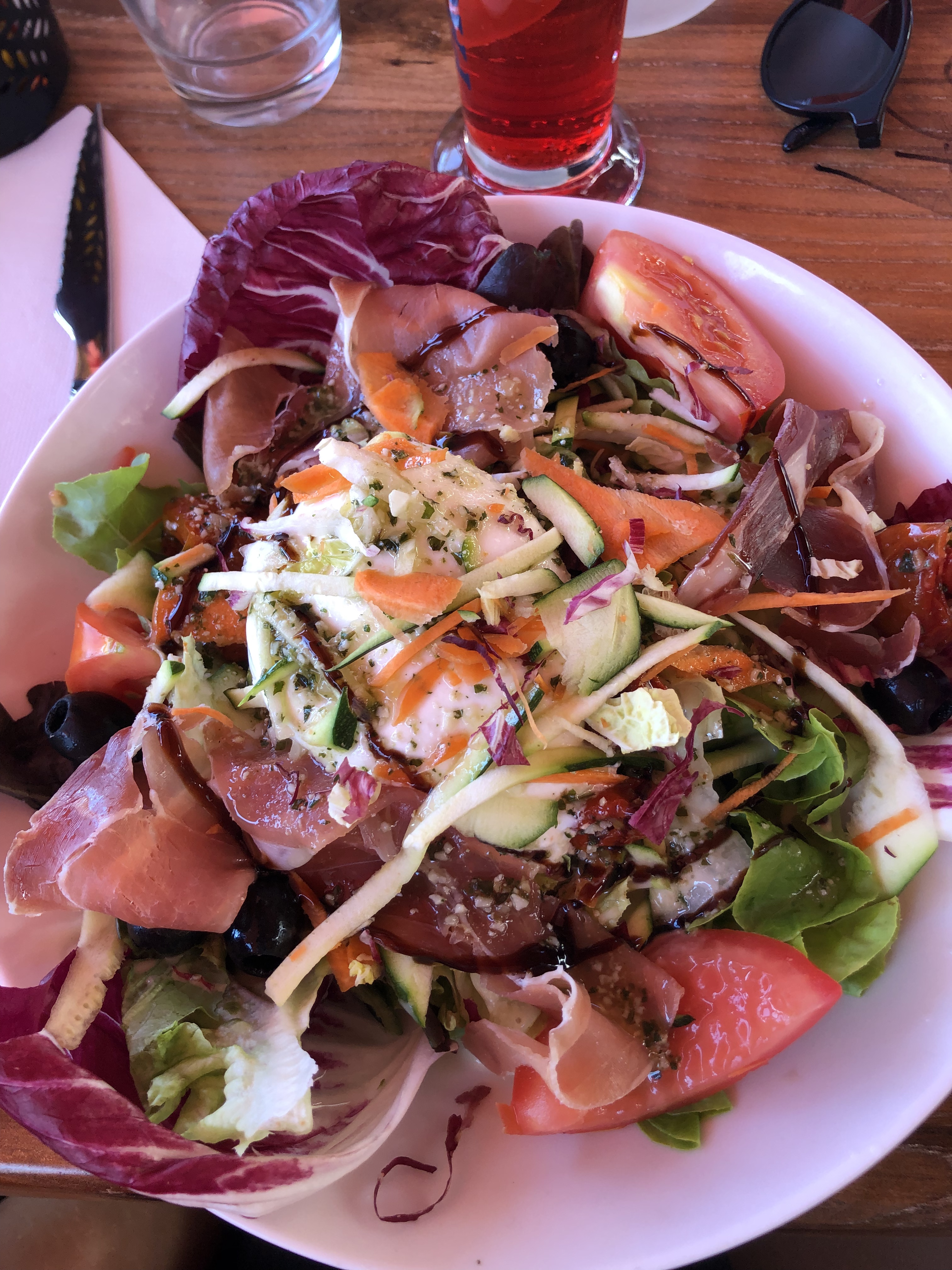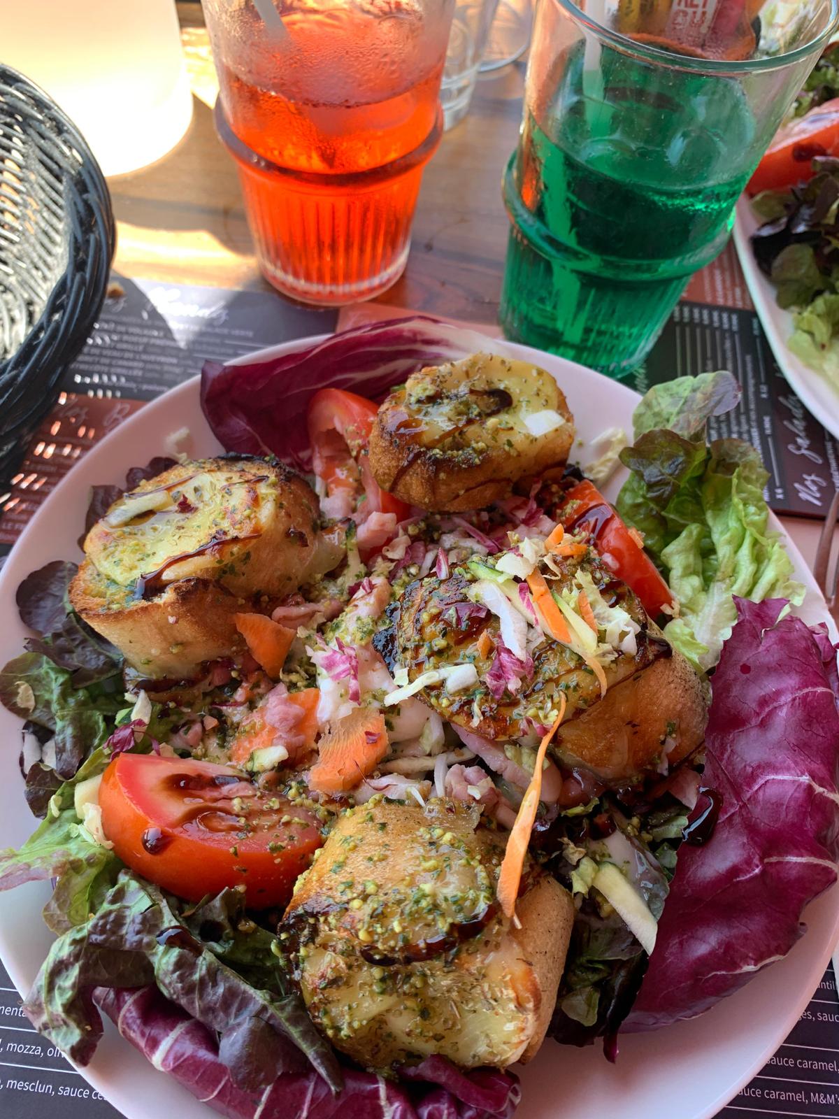 D’habitude quand on prend une salade végétarienne on s’ennuie dans son assiette, composée en général de tomates, mozzarella et salade verte non assaisonnées. Là, c’est tout le contraire, je me suis régalée, l’assiette était garnie de plein de petits légumes grillés et assaisonnés, c’était très bon !