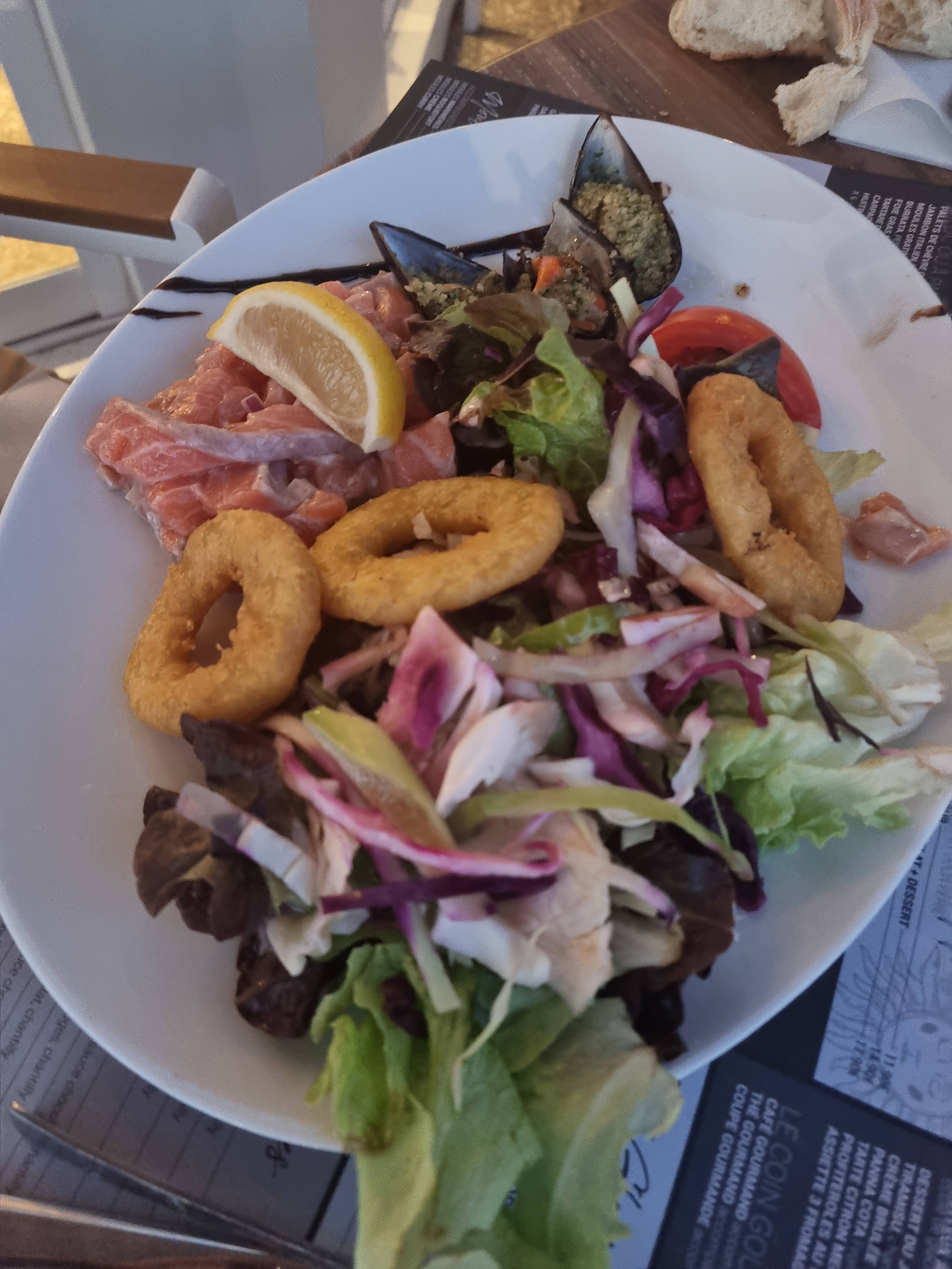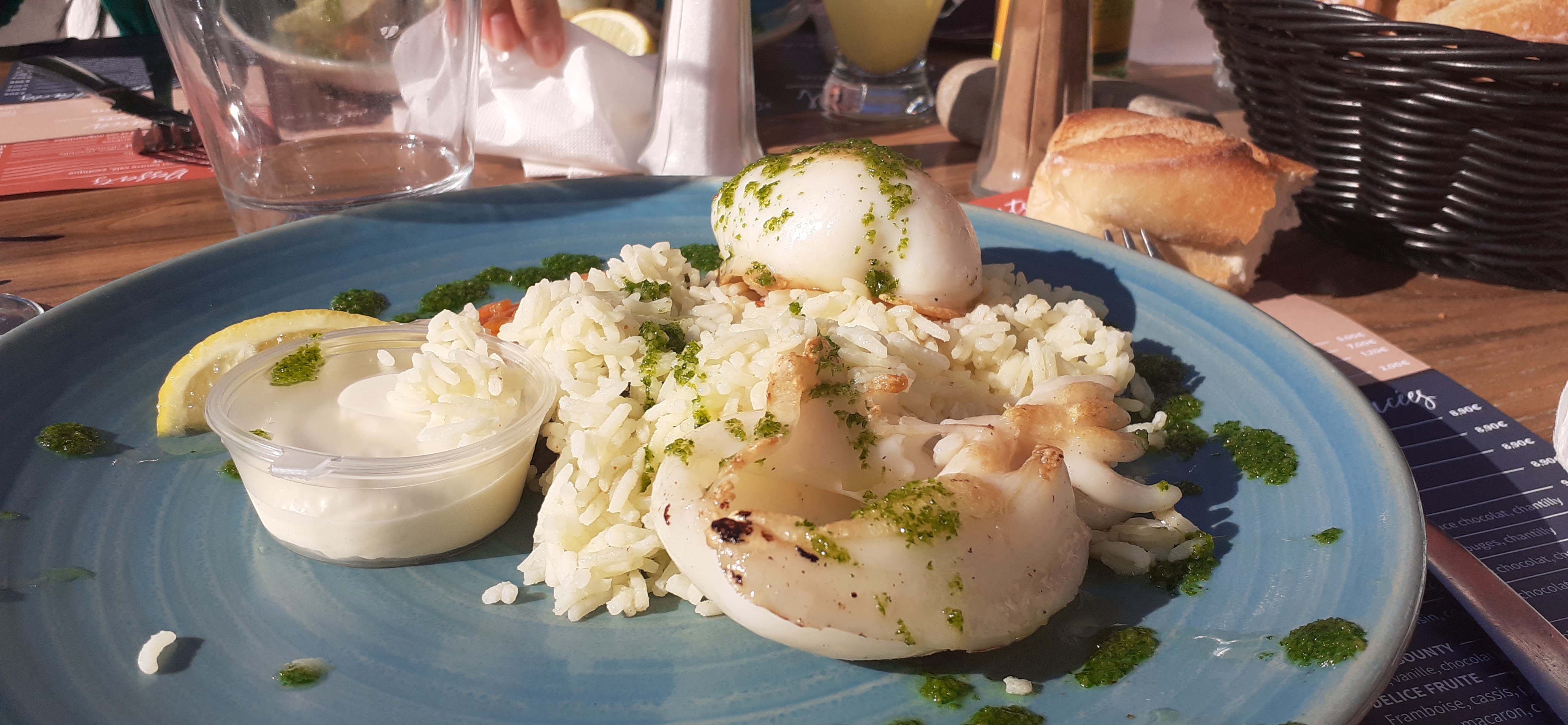 Nous ne nous sommes pas régalés... nous avons pris des moules marinières avec frites et seiche à la plancha avec riz, légumes. Les moules n'étaient pas bonnes et la sauce sans goût, c'était plus un bouillon à l'eau qu'une vraie sauce marinière. Les frites avaient un goût prononcé d'huile rance... J'ai eu mal au ventre sur la digestion... Quant à la seiche sans plus, les légumes étaient bouillis, fades et gras, le riz mal cuit (l'aïoli était servi dans un petit pot en plastique...)... Déçus....