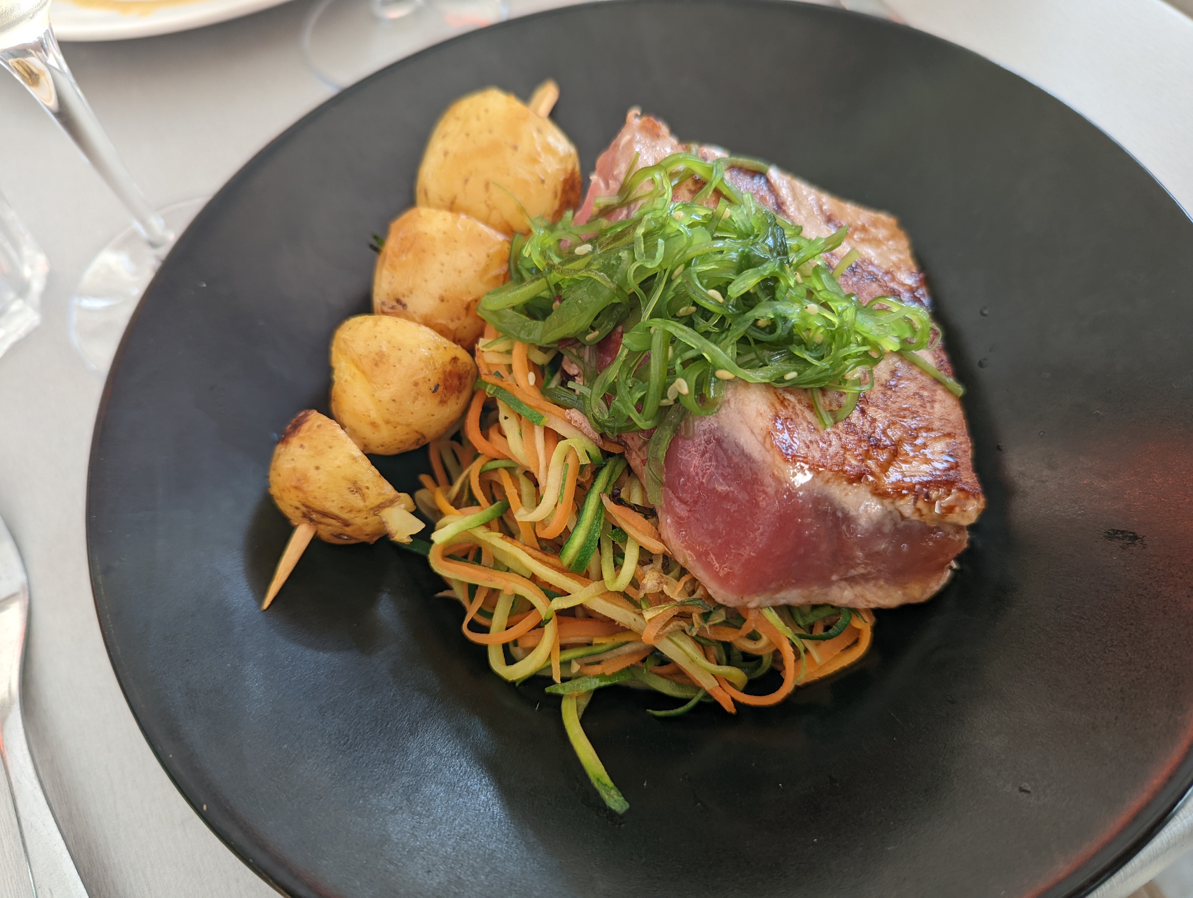 Super restaurant que je recommande fortement. Nous sommes arrivés tard, voire même à la fin du service et ils nous ont quand même dressé une table pour 4. Le mi cuit de thon était top, la brochette de saint Jacques a tomber, même pour le menu enfant ils ont proposé un burger à la place du steak haché pour le petit. Le personnel au top, souriant et très sympathique. Allez y vous ne serez pas déçu.