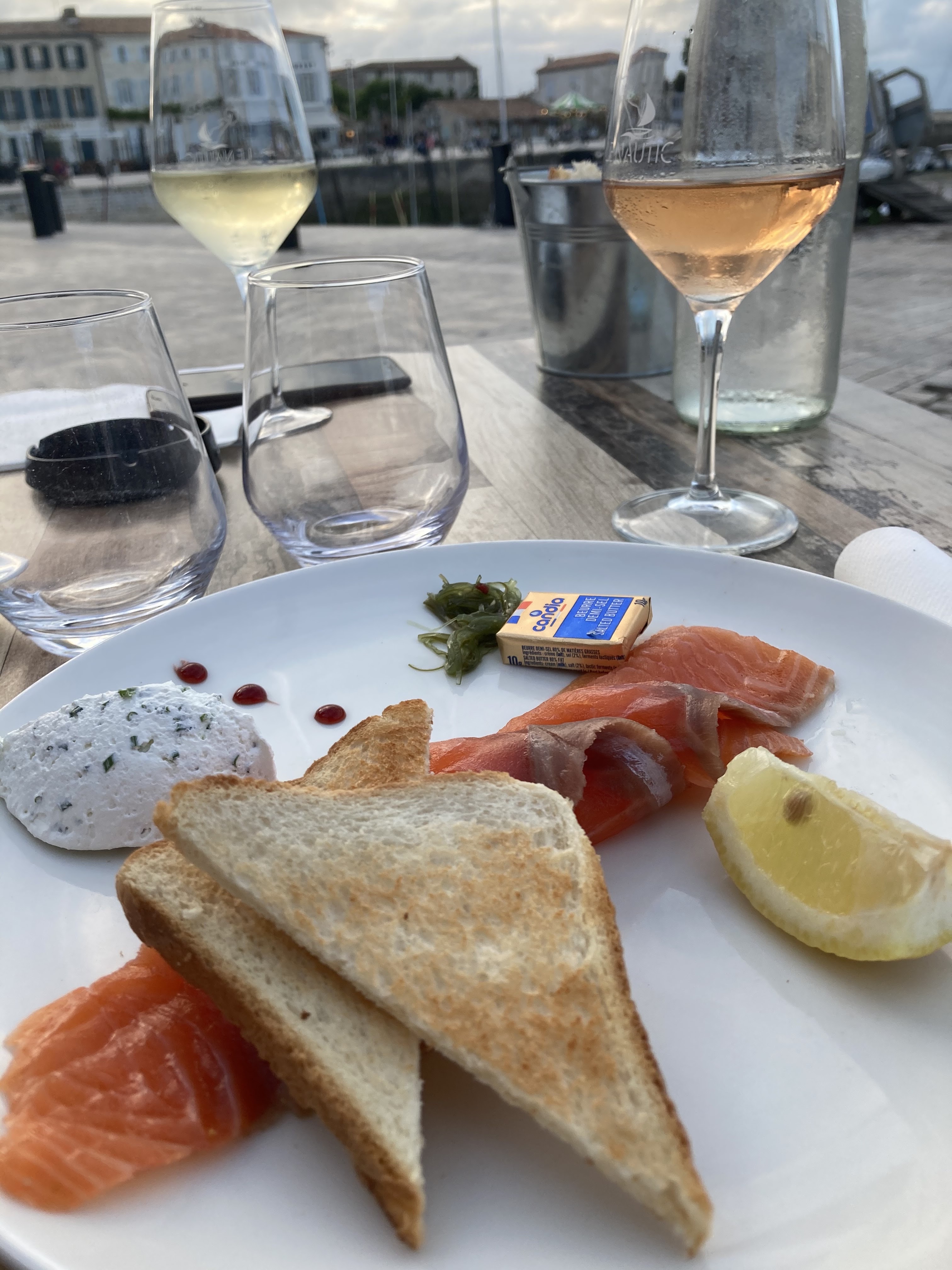 Emplacement très agréable sur le Port de la Flotte. Le personnel est très Professionnel, et très attentionné. Nous avons très bien déjeuné en terrasse, Superbe salade César, excellent Burger Végétarien et délicieuses Brochettes de St Jacques au Chorizo, même si la sauce mériterait d'être un peu plus d'assaisonnement...