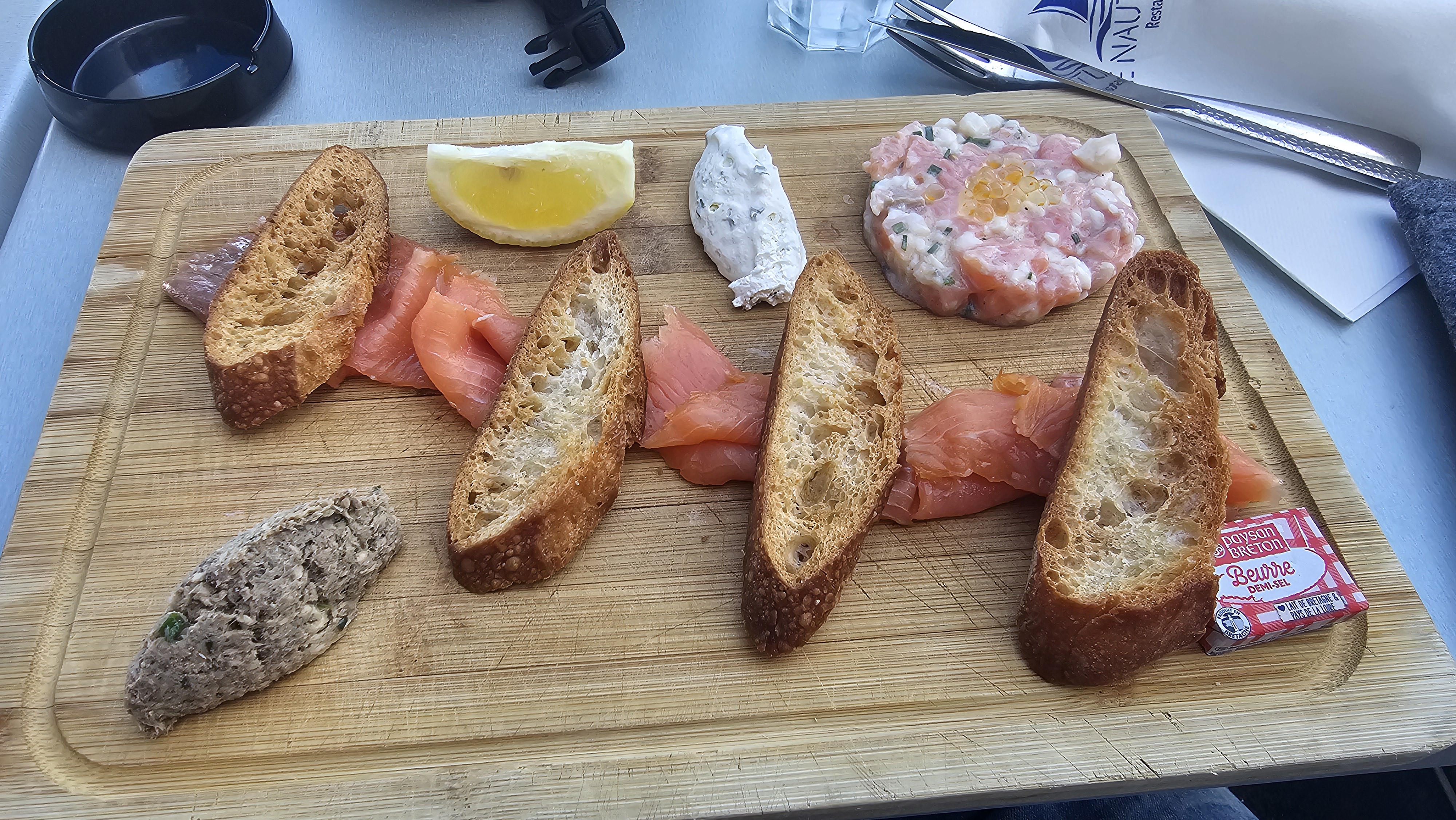 Très bon produits. Le tartare saumon Saint jacques et le saumon fumé maison sont une tuerie, offerts dans l'assiette de dégustation avec des rillettes de sardines. Belle vue sur le port. Personnel sympathique.