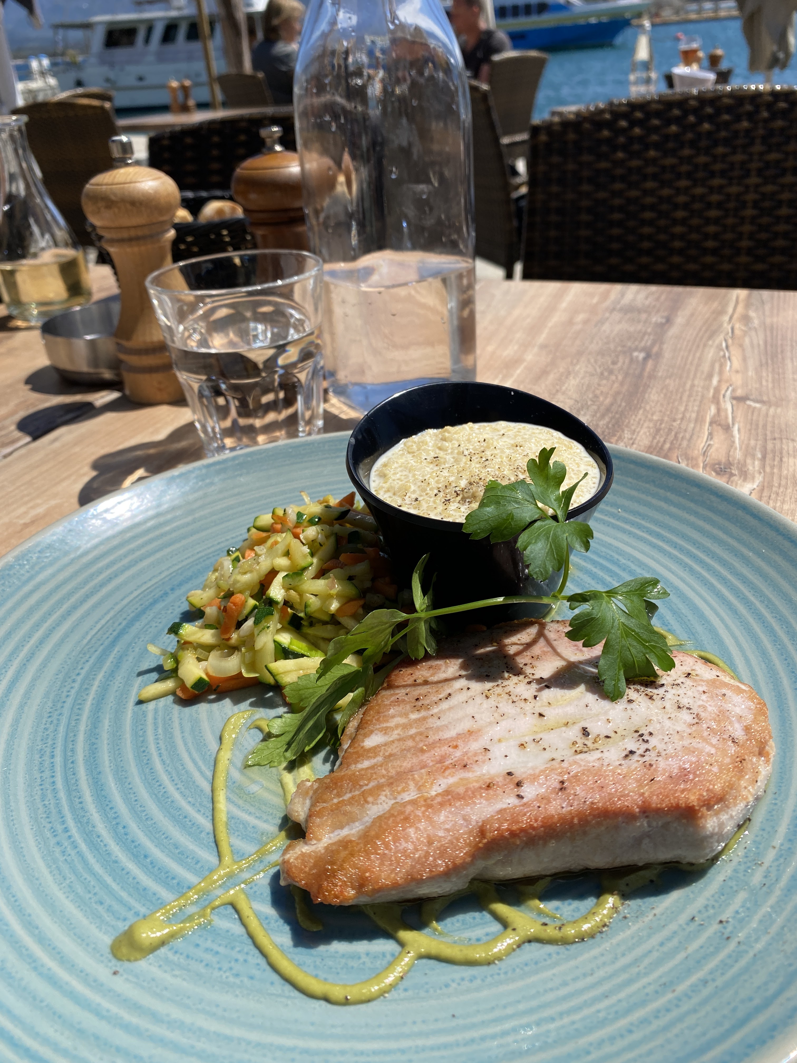 Accueil avec le sourire en terrasse pour une table à 3 m du port. Vue imprenable ! Je recommande absolument le steak de thon avec son rizoto de quinoa !!!