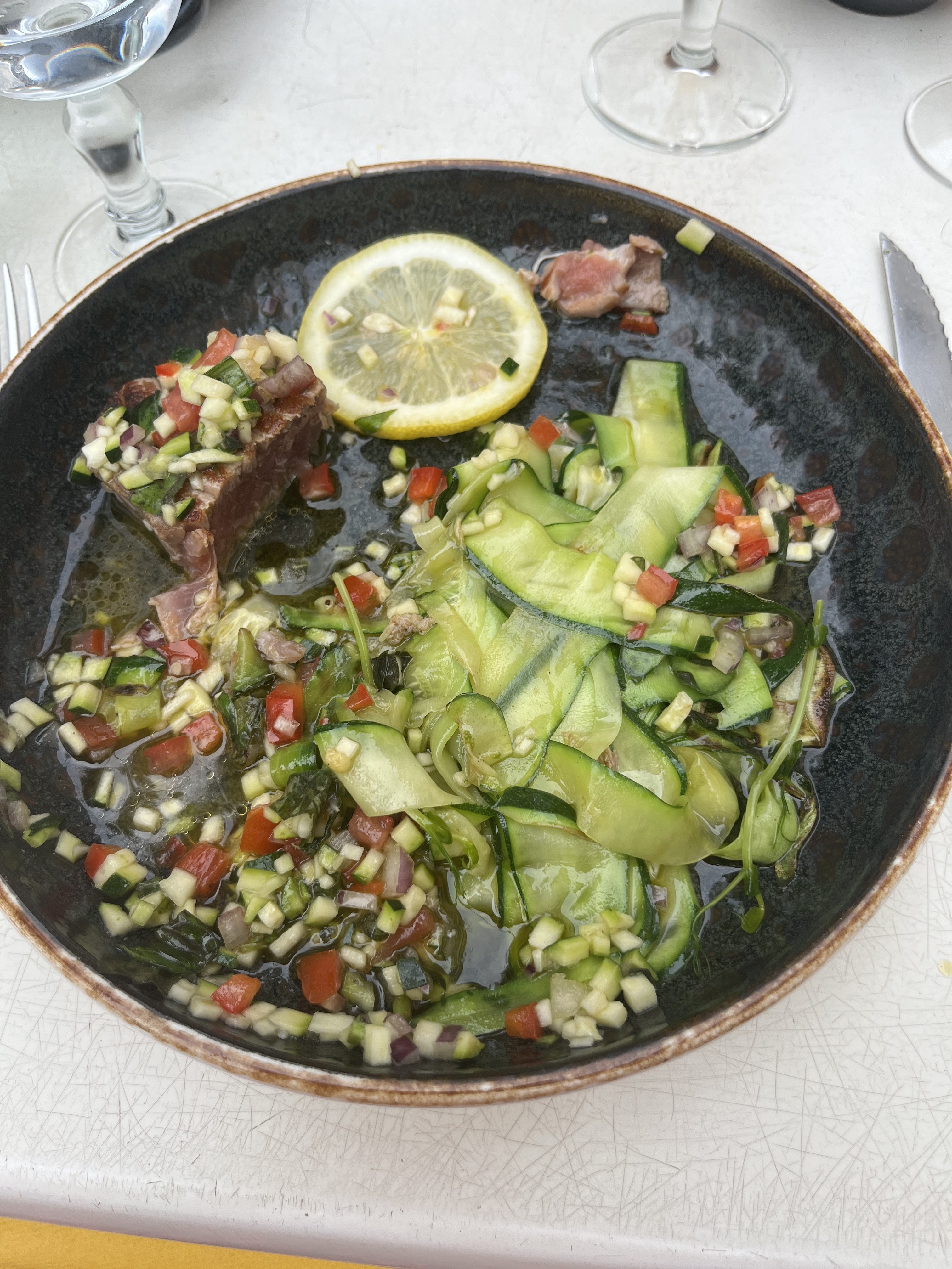 Bon accueil mais plat moyen d'un point de vue gustatif. Saumon bouillant et sec sur peau cramé avec tagliatelles certe fraîche mais 3 gouttes de sauce, rien de bien brillant et goûteux et tout ça pour 19€ l'assiette. Après je ne peux affirmer que cela est l'habitude ou un incident de fin de saison mais peu de chances que j'y retourne.