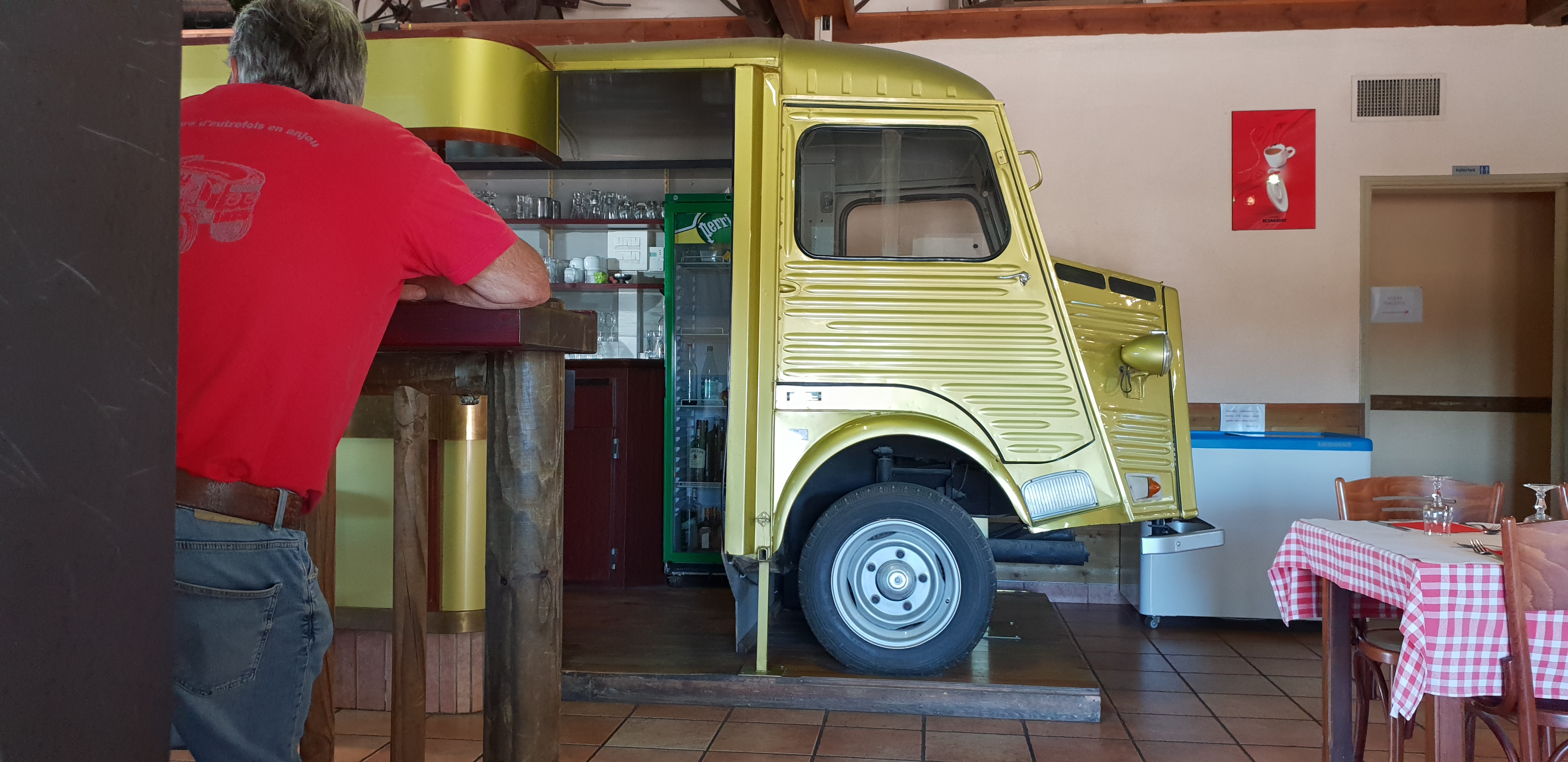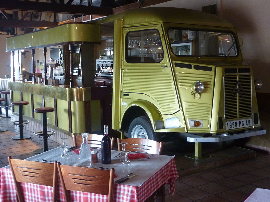 Très bien mangé, décors originales, le bar est un citroeen HY
