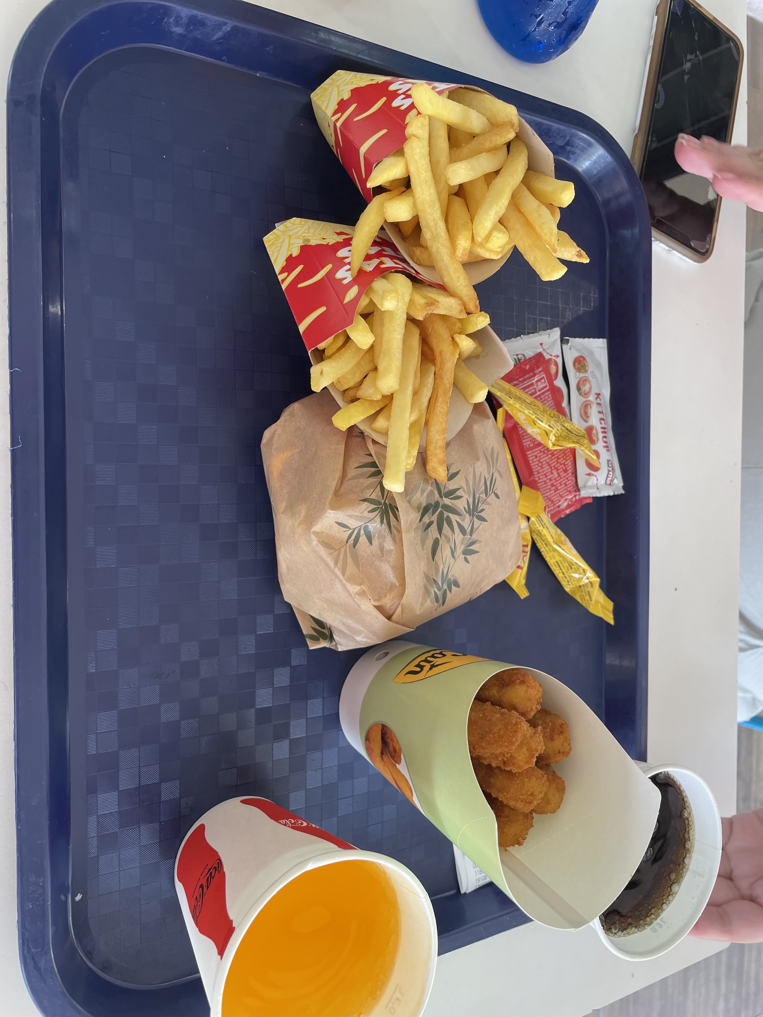 Hyper cher pour un plateau presque vide! J’ai payer 22€ pour deux petites portions de frites, deux mini boissons, un Burger et des nuggets..