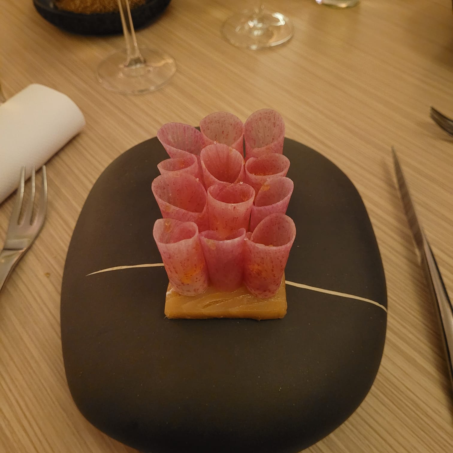 Un plaisir à l'état pur. Le mi-cuit de saumon est très original tant du point de vue gustatif (assortiments avec des radis noirs) qu'en présentation façon orgues... Je recommande.