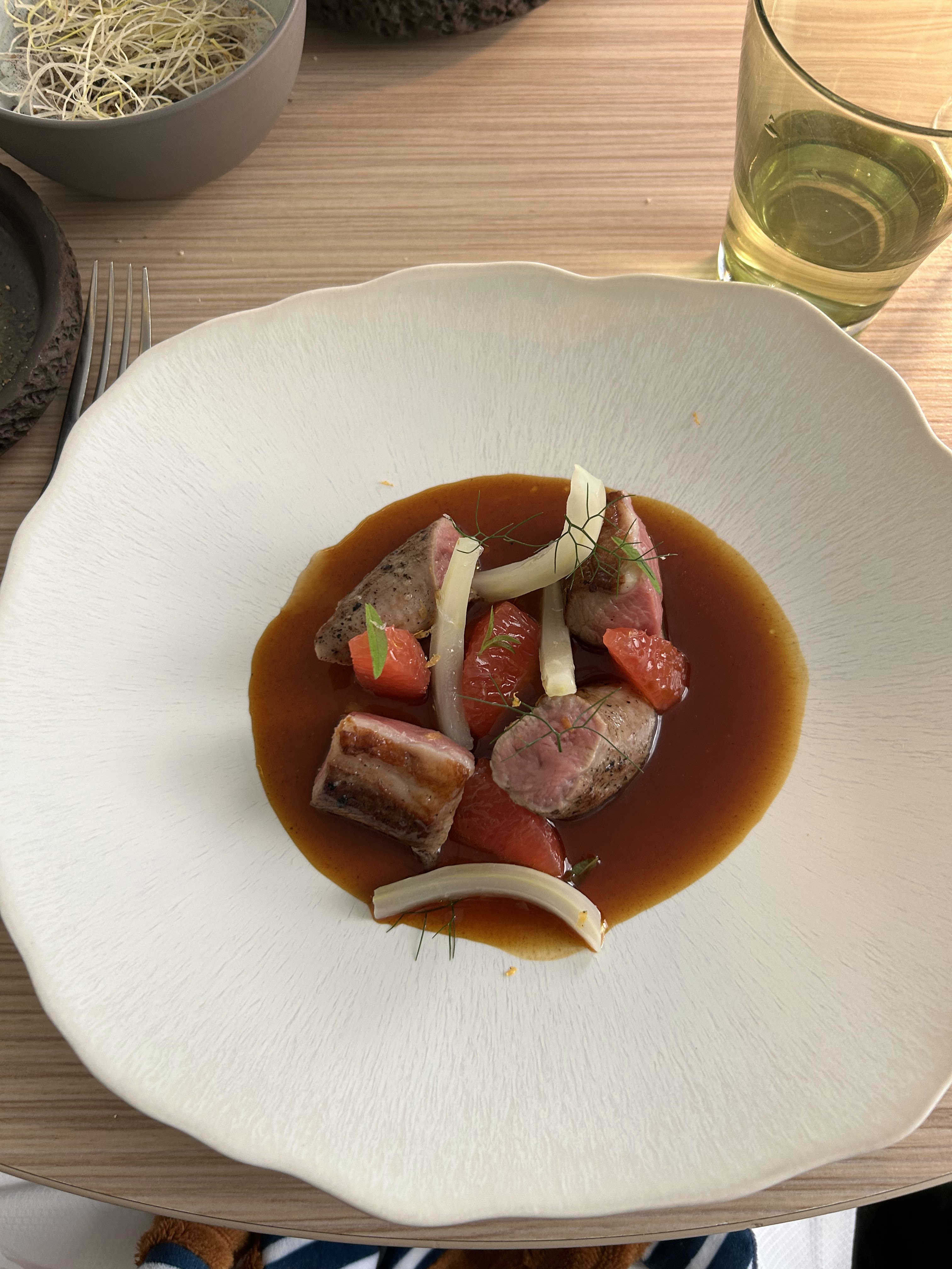 Le seul pigeon vaut mille fois la visite. Bémol pour la nage de coquillages, d'un nouveau nettement en dessous, malgré quelques saveurs asiennes inhabituelles. Personnel affable. Une cocasserie : le yaourt au yuzu commandé s'est révélé être à la pêche. L'erreur a été relevée. La serveuse a répondu avec humour, sans toutefois faire un geste pour corriger sa bévue. Dommage. Une table que nous revisiterons très certainement. Chef Roure grand voyageur impressionnant de par sa sagesse.