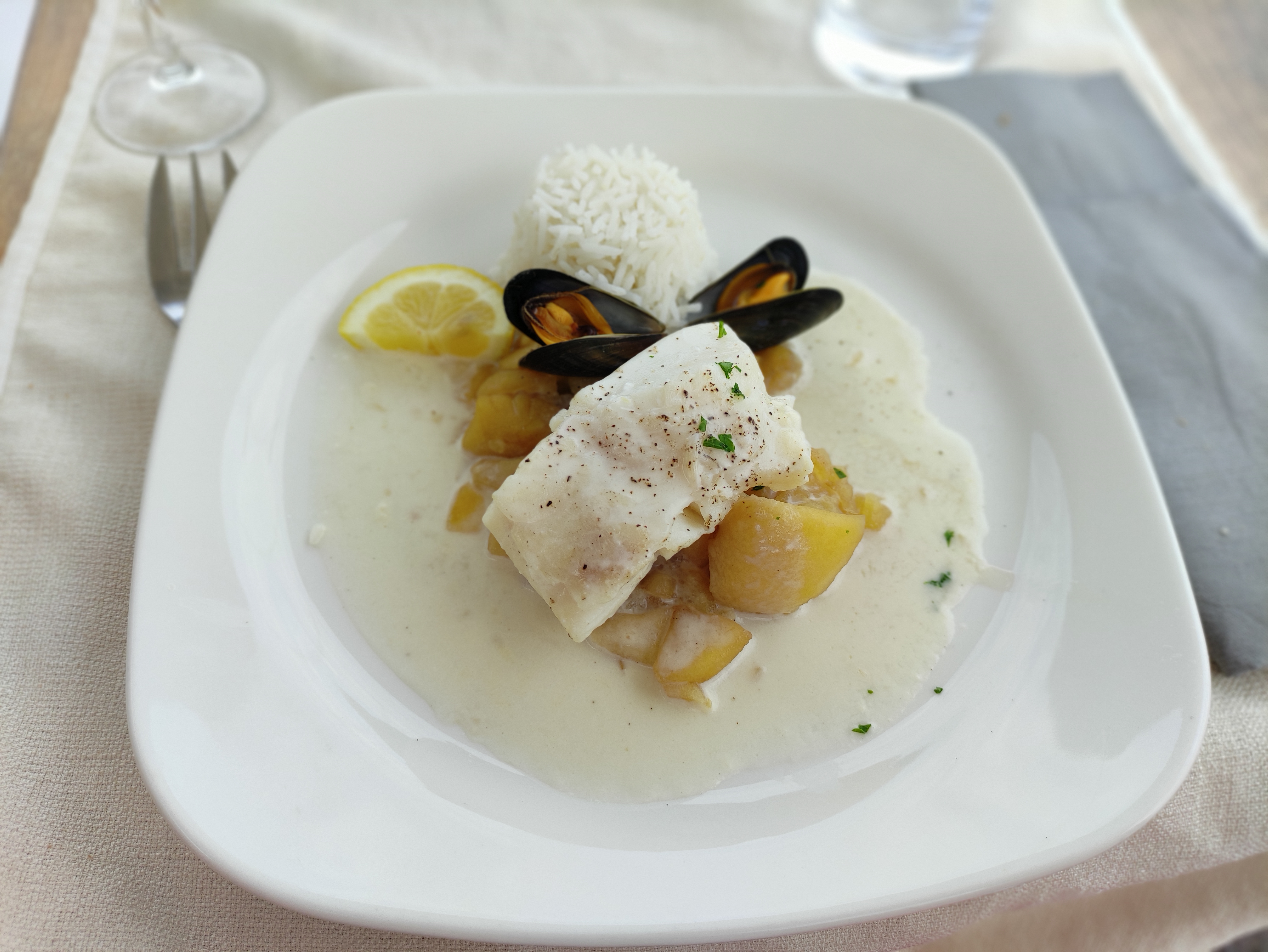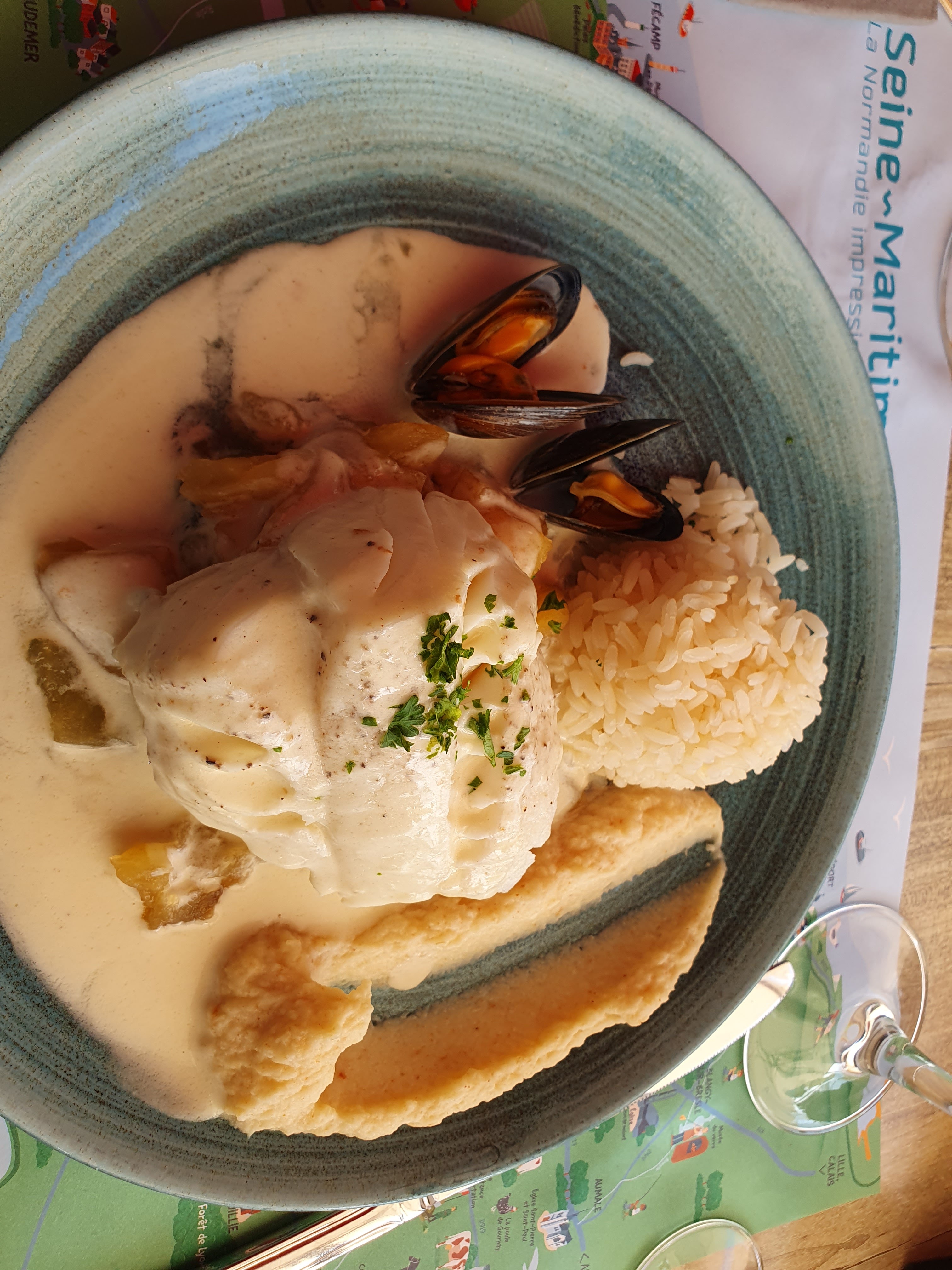 Nous avons très bien mangé.. Moules à la normande délicieuses.. Très bien servi, moules très bien cuites, bien charnues