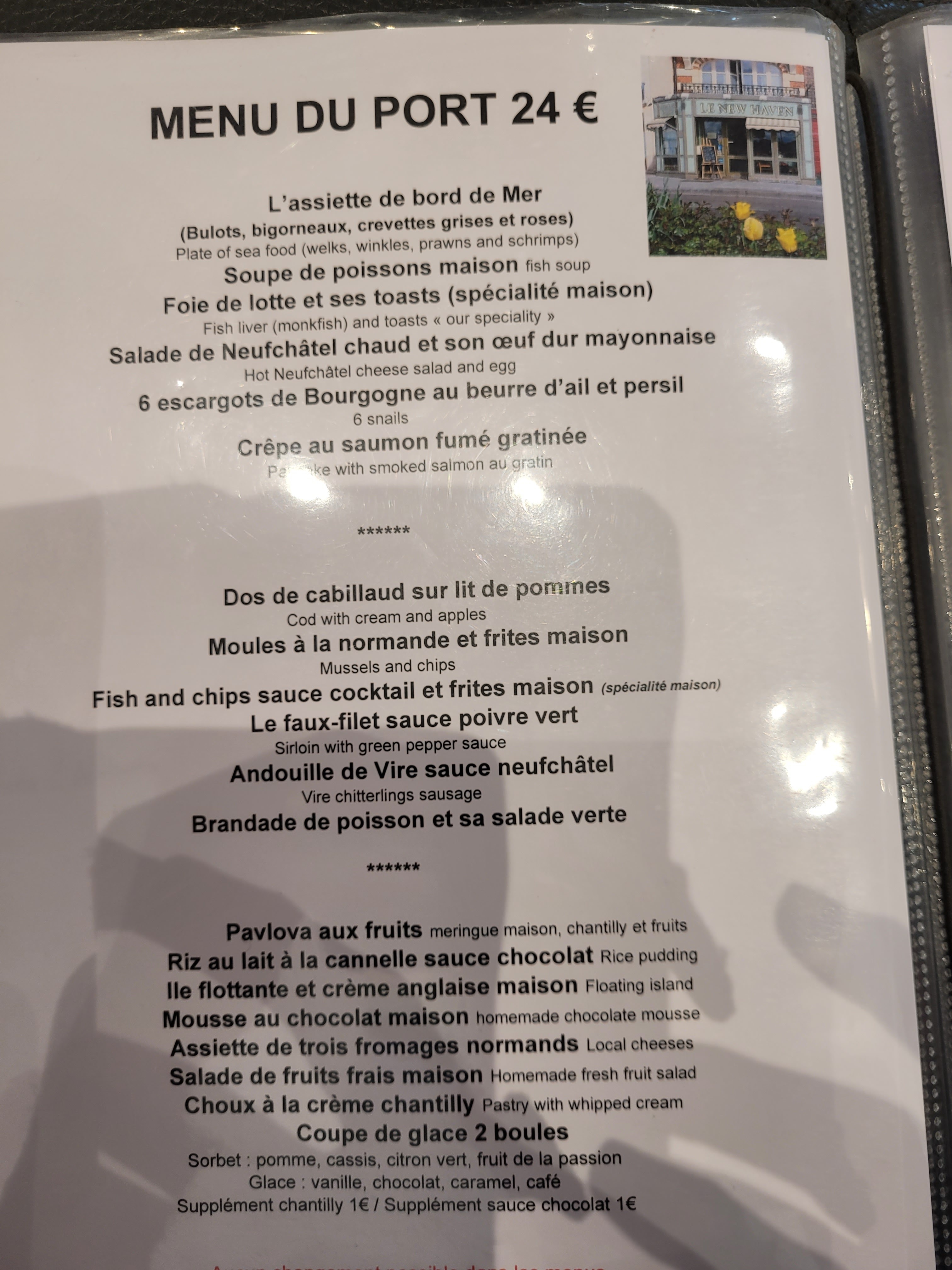 Nous regardons avec objectivité les avis sur les restaurants. Ici au restaurant *New Haven*, que de bons avis. Et bien, c'est complétement juste. Menus de 23 à 31€. Entrées : Une soupe de poissons avec les croutons, le gruyere et sa sauce. Saumon sur toasts. Plats : faux filet, frites et moules marinières, mayo maison. Fromages : 3 portions de fromages locaux. Desserts : crême brûlée et mousse au chocolat, puis café. Un bon repas, de bons produits, le service attentionné du début à la fin. Des serveurs aimables et à l'écoute. Bref, que du bonheur...... A recommander vivement si vous souhaitez bien manger. Si vous avez la possibilité, faites une réservation, car il y a du monde qui connaît ce bon restaurant.