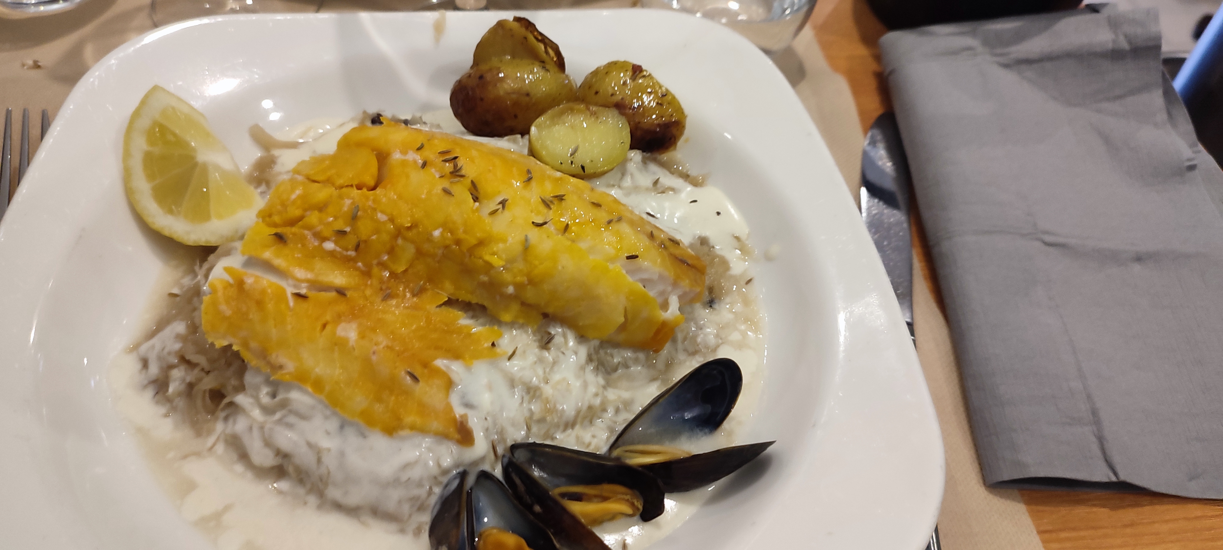 Accueil au top, ambiance agréable avec musique siège confortable. Clientèle sympathique et respectueuse. Prix correct. Service attentionné et le vin coup de cœur très bon. Nous avons été informé que le restaurant fermait à 22h j'ai trouvé ça bien de nous l'avoir dit. La carte est très bien, des plats du coin, fraicheur du poisson du menu enfant, frites maison, moules un peu petite (c'est de janvier à juillet la saison) peut être à retirer du menu en automne et la sauce Neuchâtel avec était délicieuse. Choucroute de la mer copieuse et goûteuse... Vraiment je recommande vivement, nous y sommes allés car me resto nous a été recommandé par l'hôtel ibis et aussi au vu des 1650 avis sur Google. Pas déçu ps les desserts délicieux surtout la tarte normande au Calvados maison.