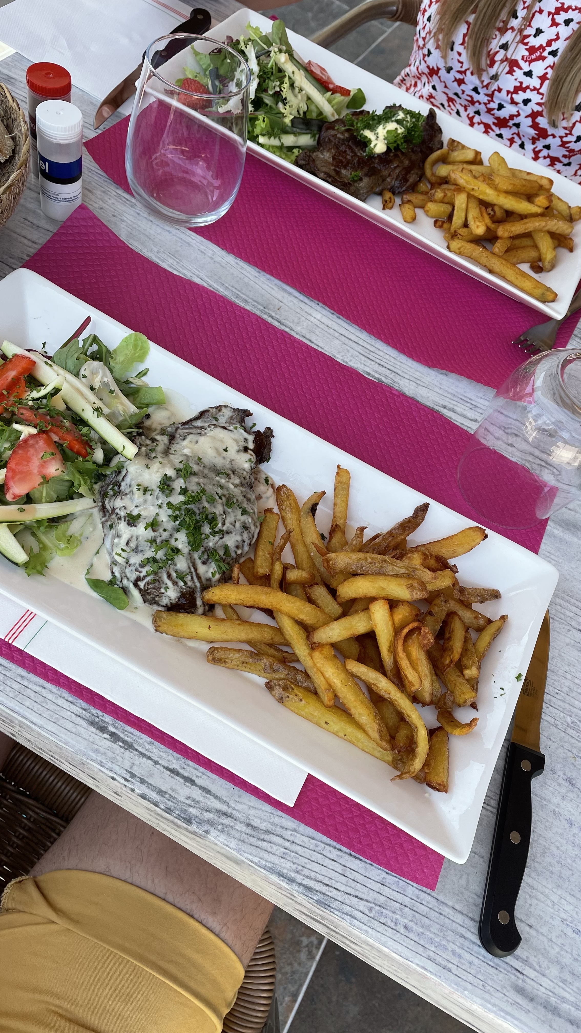 En vadrouille dans le coin, nous nous sommes arrêtées pour se rafraîchir mais finalement restées pour le repas du midi car nous nous sentions bien : tartare de bavette bœuf Angus coupé à la minute, frites fraîches faites maison avec sauce roquefort et petite salade, très bon et très bien servi. Merci d’avoir gardé nos sacs pour la journée, pour l’accueil et votre gentillesse, nous en avions besoin. À bientôt peut être, Les deux alsaciennes :-)