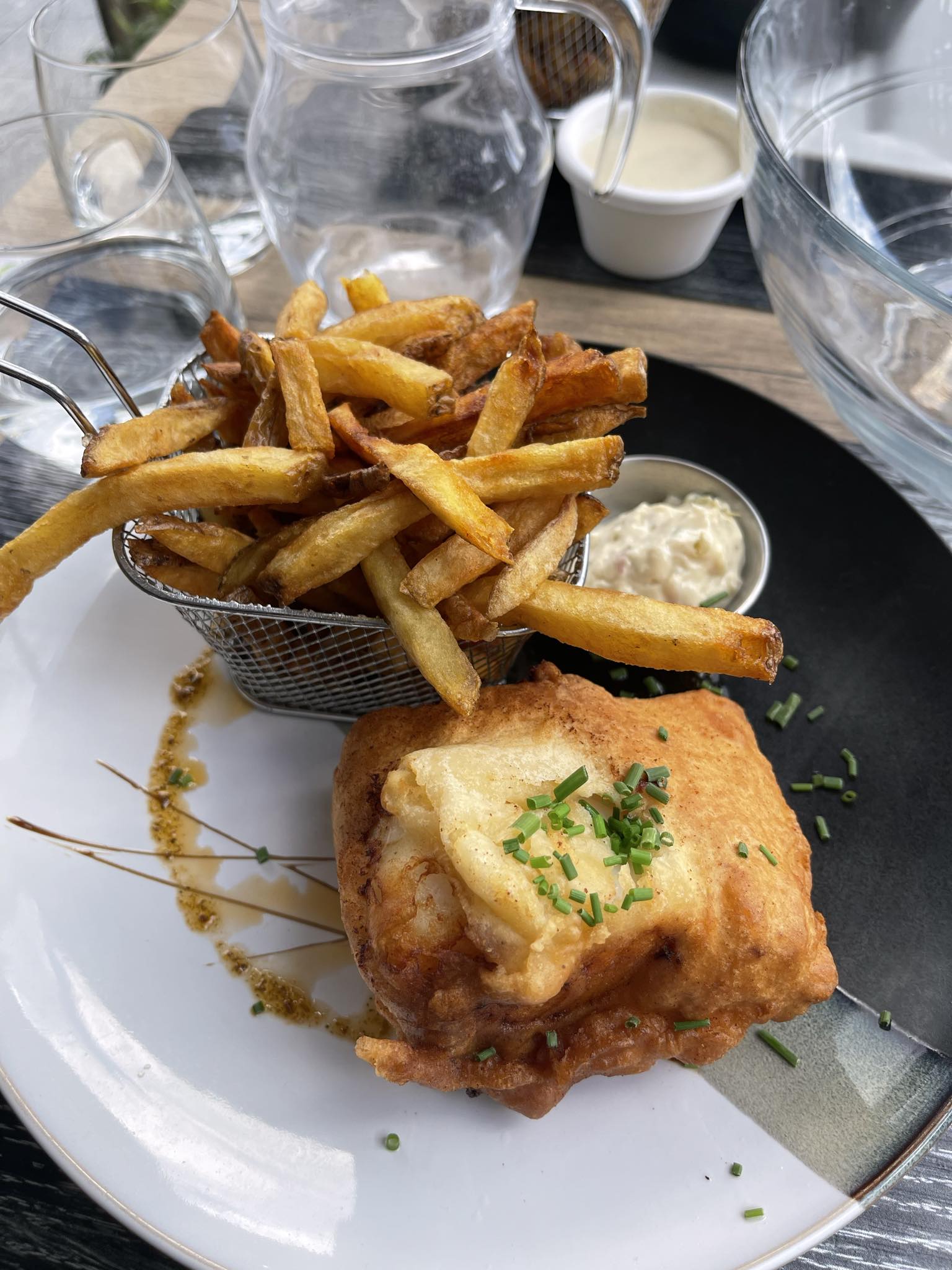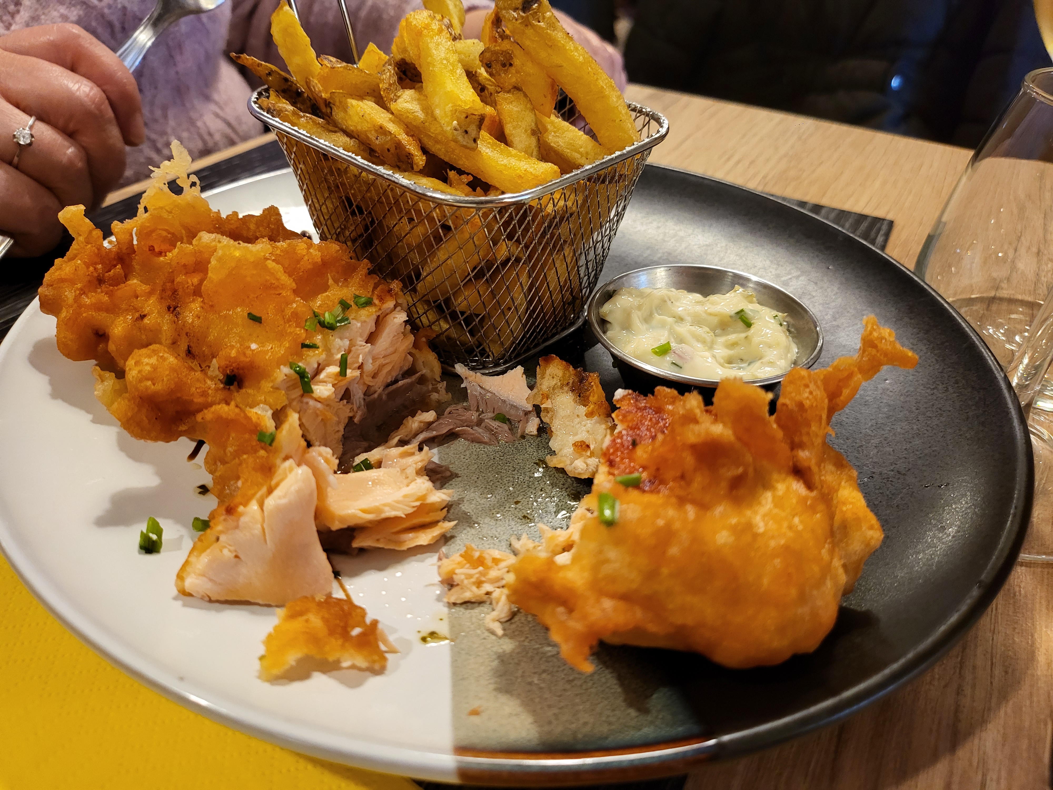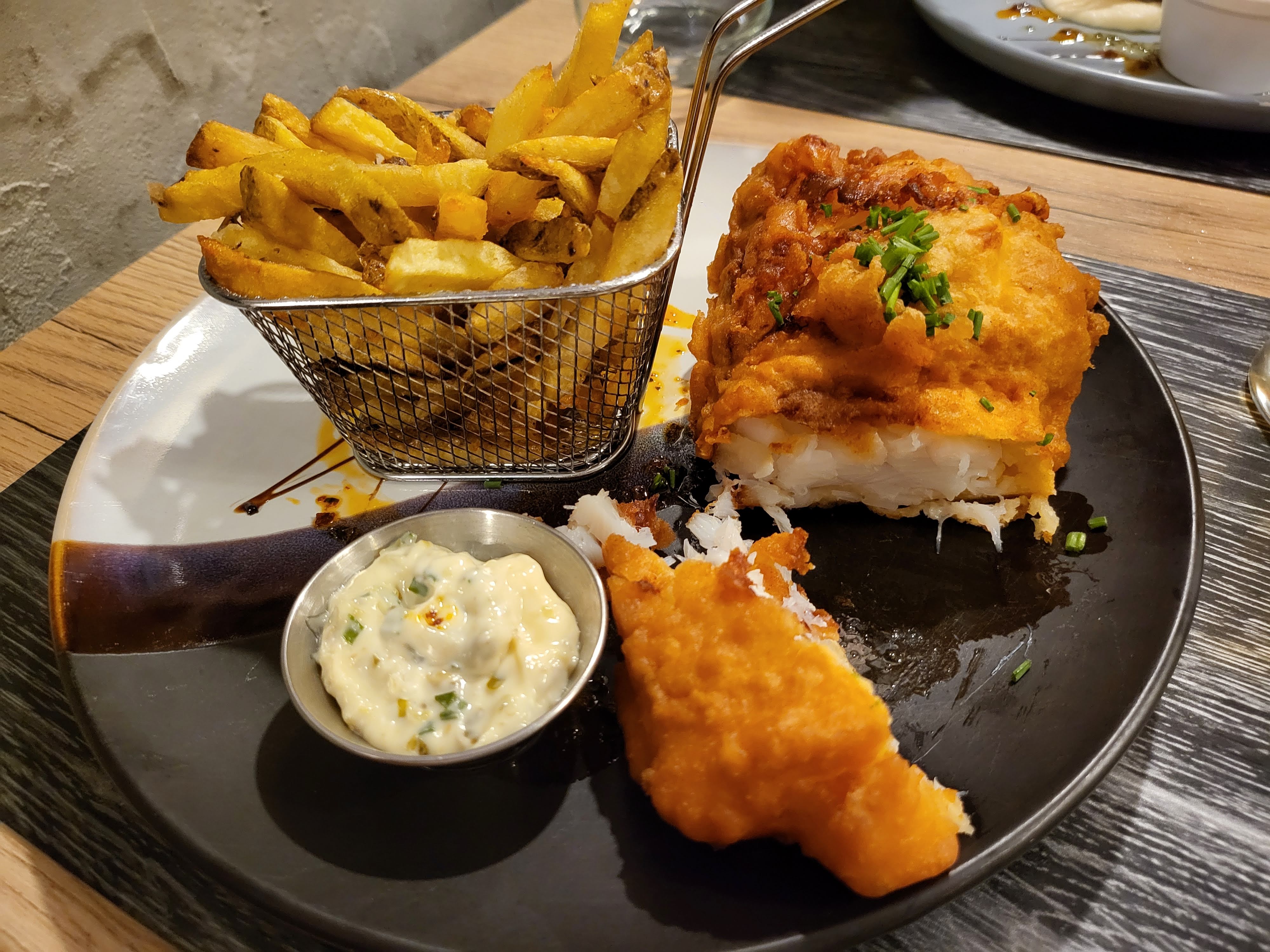 Ayant vécu 1 an en Irlande, ayant dégusté des dizaines de fish and chips, je n'ai guère été emballé par la partie fish. A 18.50€ le plat, forcément, cela crée une certaine attente. Cabillaud un peu sec lié je pense à un batter un peu trop beignet qui a trop pris la friture. Sauce peu généreuse, mais frites bonnes. Service efficace. Vue sur le port agréable.