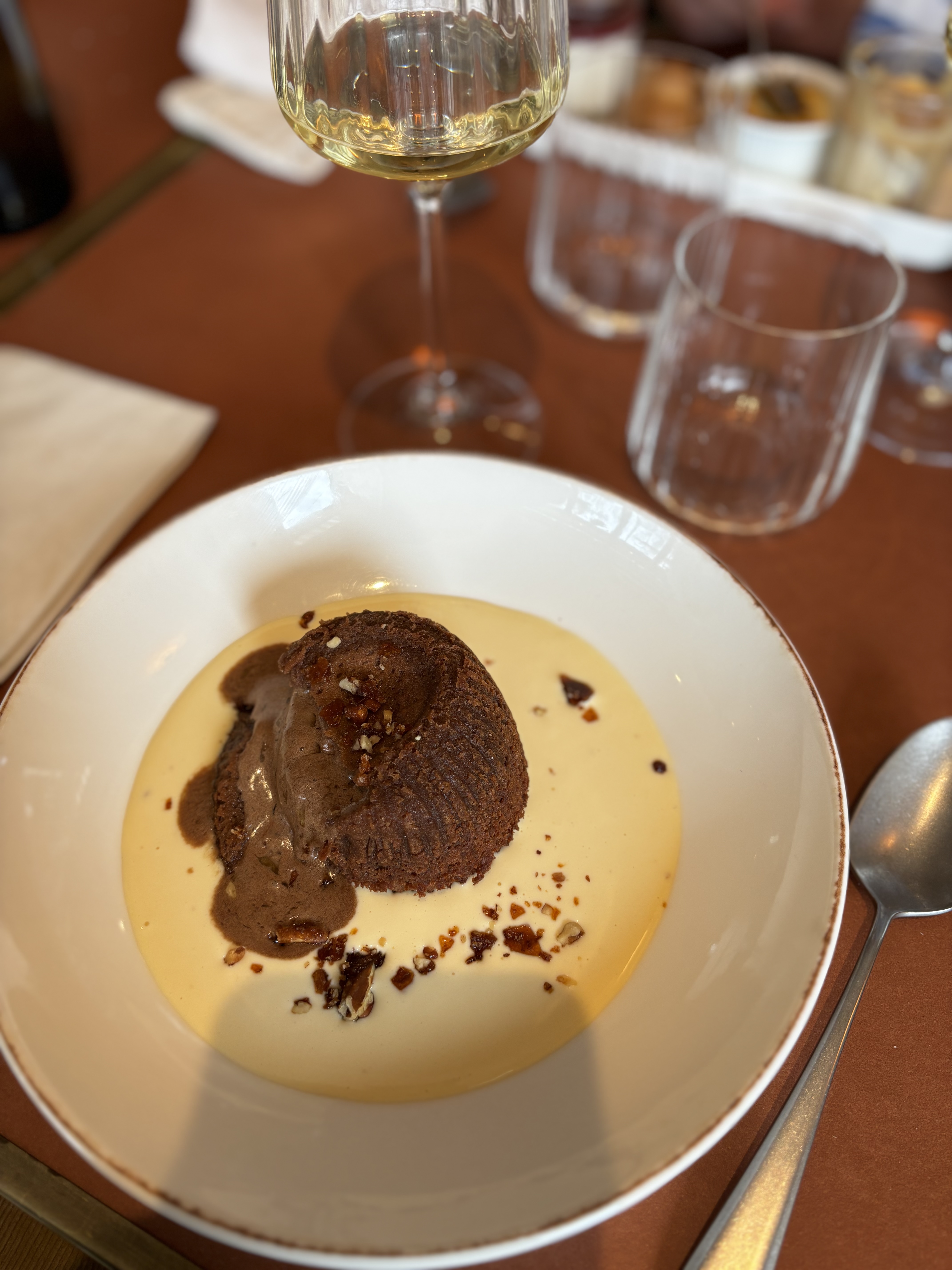 Tout était parfait. Dîner en terrasse avec vue sur le bord de l'eau. Service impeccable, et repas délicieux : mi-cuit de thon et dessert tout chocolat, rien n est resté dans l'assiette. A refaire !