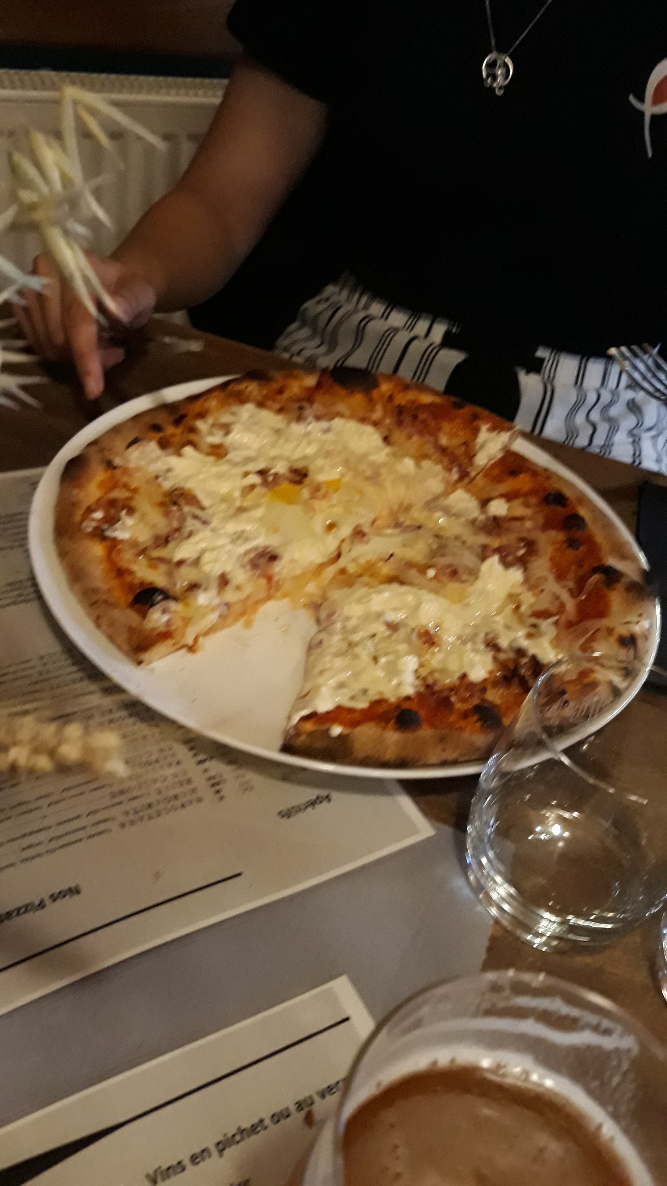 Tartes flambées très bonnes, bien garnies, la pâte cuite au feu de bois est excellente, je recommande vivement ! Accueille par Camille souriante et agréable. J’y retournerai sans hésitation pour goûter les pizzas.