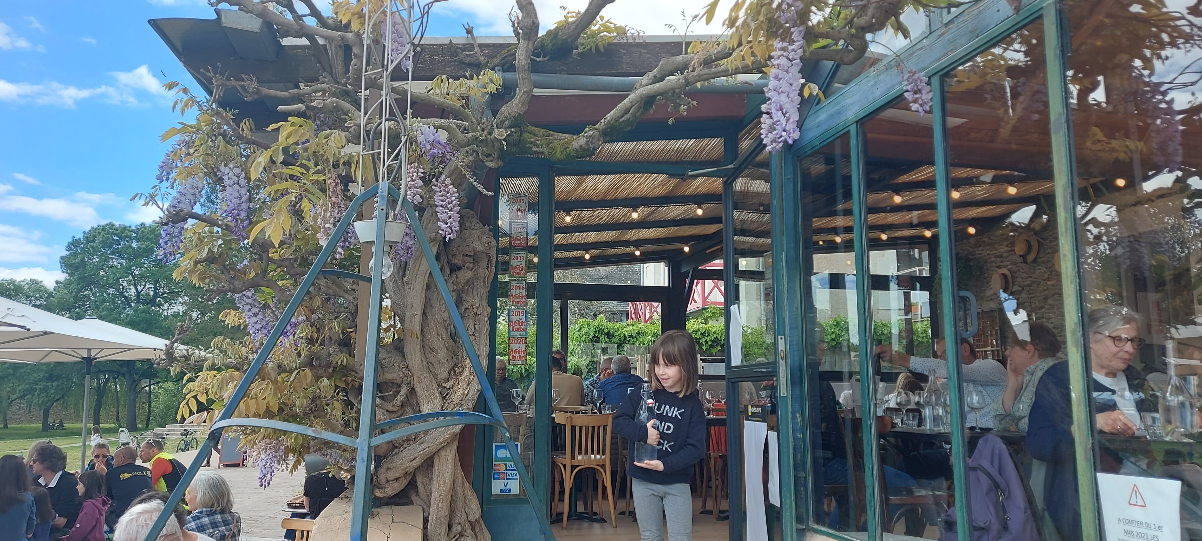Après une petite ballade, où un passage au marché du dimanche, nous sommes venus déguster un verre de vin avec des petites tartines de rillettes de poissons. La vue sur la Maine est magnifique. Nous n'avons pas encore testé le restaurant.