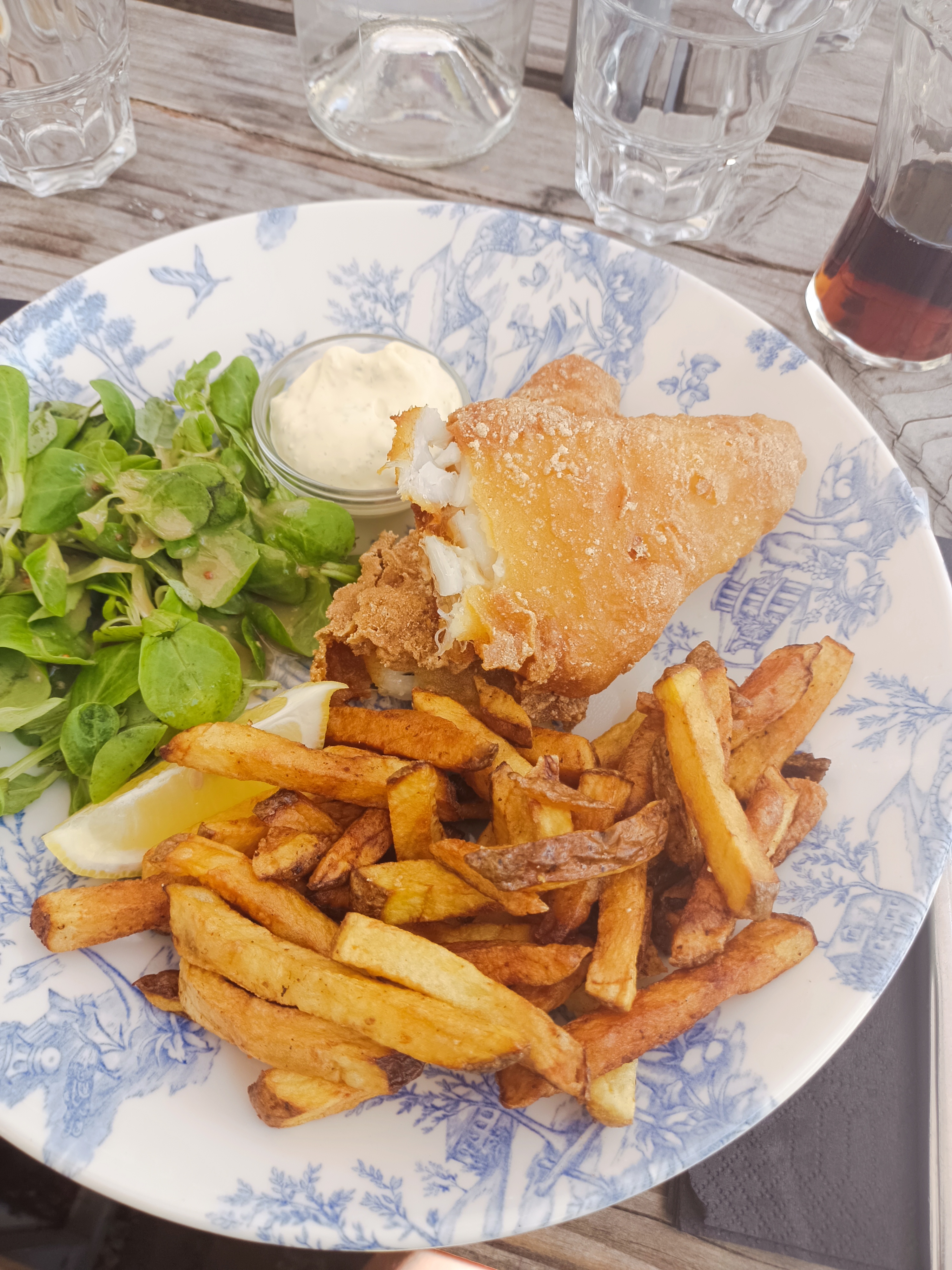 Déception.. Restaurant très bien situé, joli cadre et accueil agréable. Ceci dit, nous avons été déçu par le service très lent, attente très longue pour avoir les plats. Les plats ne sont pas particulièrement savoureux, fish and chips trop cuit, les entrées sont pauvres en goût et en quantité, les lasagnes veggie sont en faite un gratin de légumes au chèvre, dommage car en tant que végétarienne je ne pouvais choisir que ça. Je recommanderai plutôt cet établissement pour boire un verre en terrasse au soleil mais pas pour y manger.