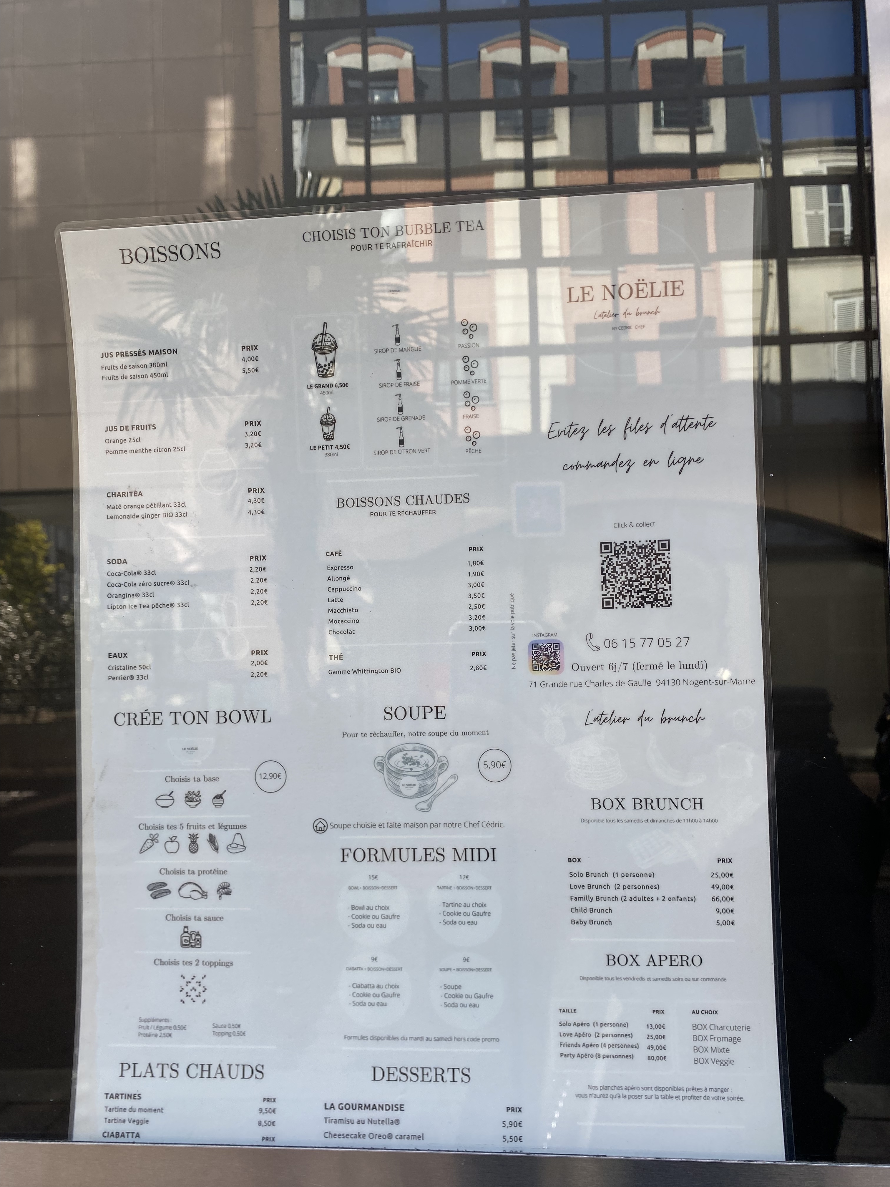 C'est nouveau à Nogent. J'aime bien le concept! Un joli cadre, des produits frais. Tout est préparé minute par le chef. C'est bon, sain et gourmand. Le menu n'est pas grand mais il varie régulièrement pour ne pas se lasser. Il y en a pour tous les goûts et pour toutes les bourses: mon fils lycéen aime beaucoup le sandwich ciabatta chaud ainsi que la gaufre ou le cookie maison. Ma fille et moi apprécions les bowls minute base au choix, garniture au choix. Les tartelettes du jour sont divines. Pour ceux qui préfèrent un plat chaud, les soupes et les pennes à la truffes sont délicieuses (sur place, mon mari et mon fils auraient apprécié des portions un peu plus généreuses du coup ;) Dimanche, nous avons testé le brunch à la maison et on a adoré! C'est bien préparé, varié et copieux. Si Besoin, le chef s'adapte à votre demande. C'est appréciable. Bienvenue Le Noëlie!