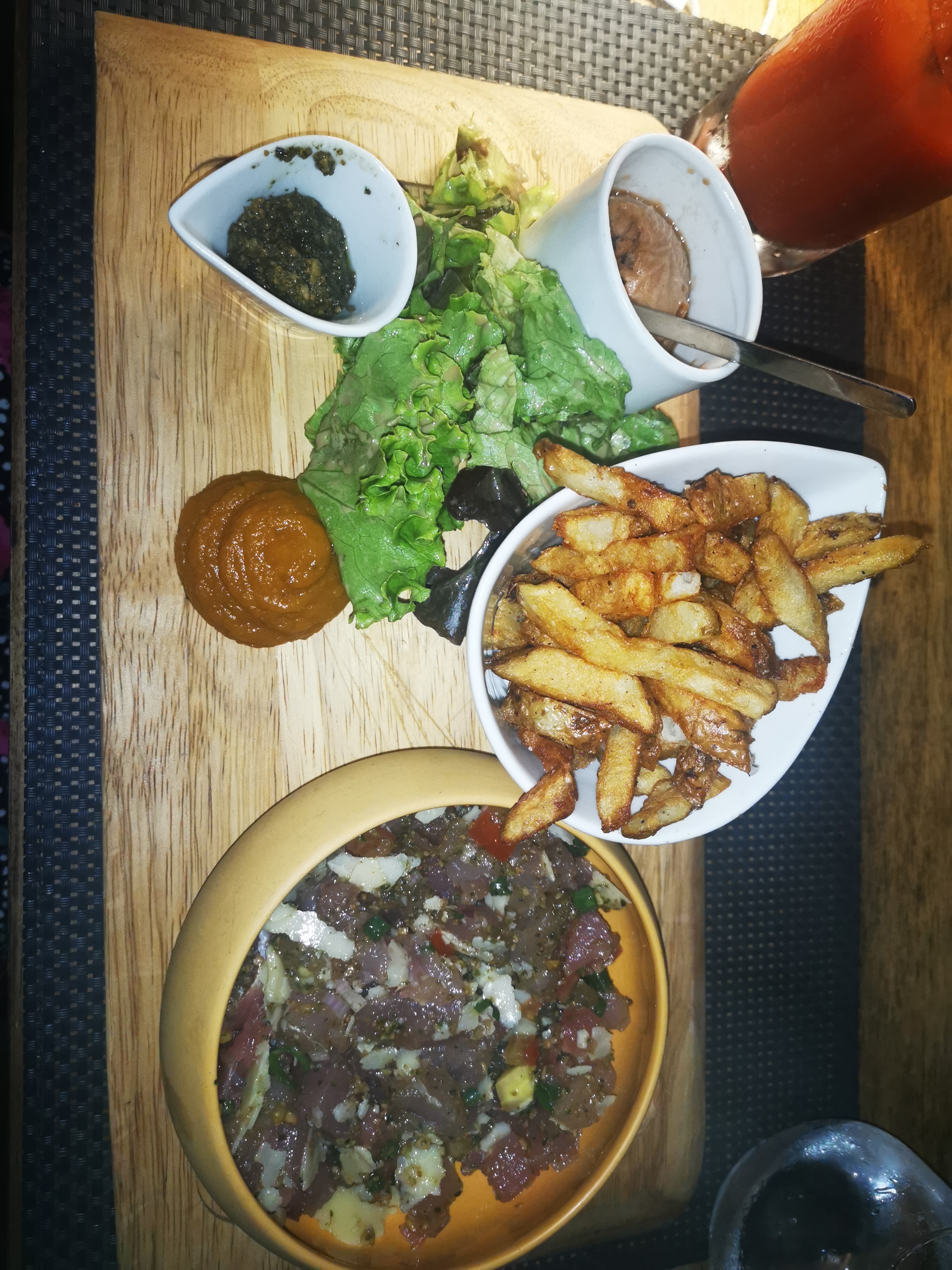 Large choix sur le menu , cependant ce jour là beaucoup de produits n’était pas disponible donc dommage … néanmoins service et personnel au top Cadre magnifique et dépaysant 🤩🌴