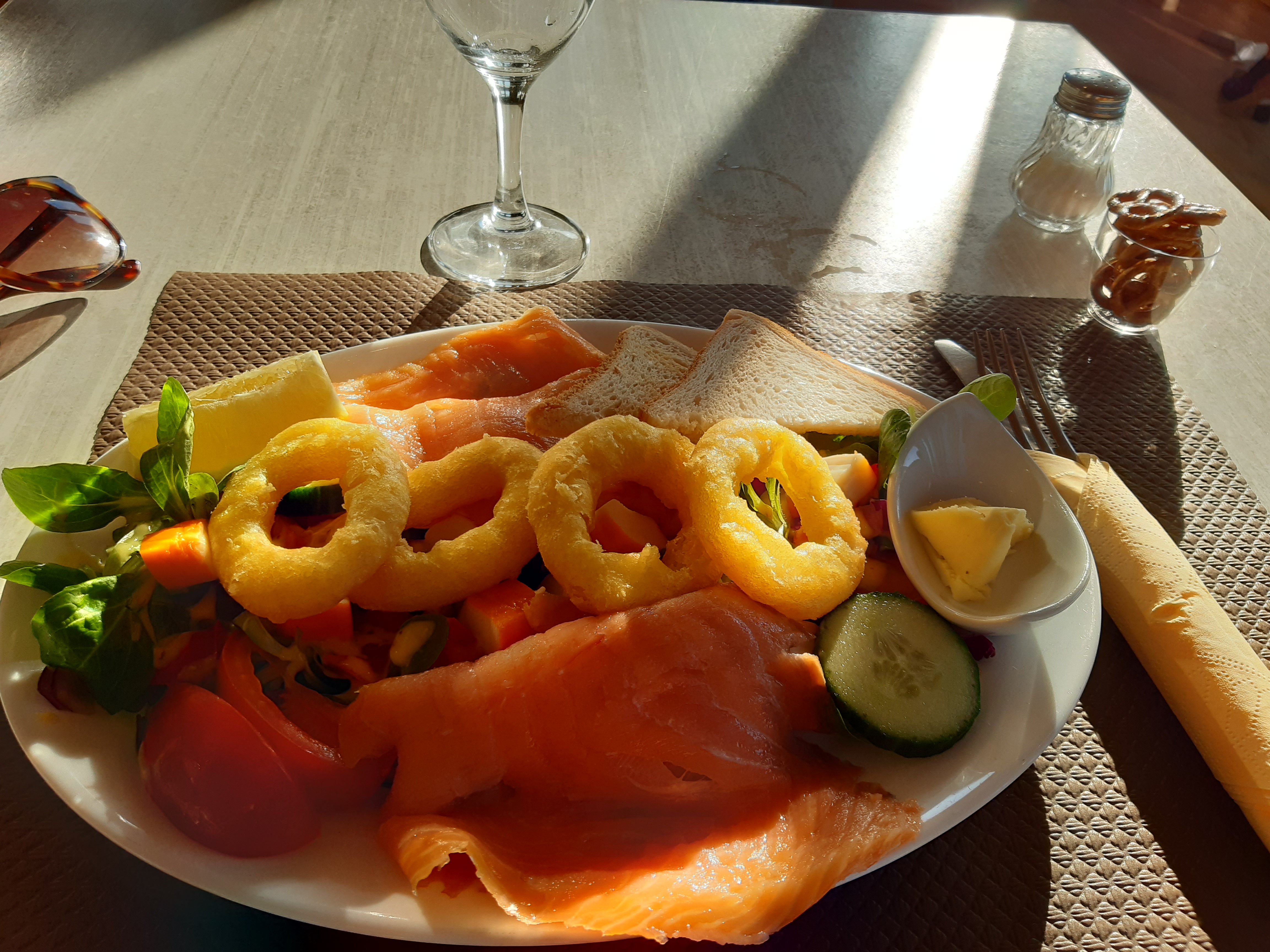 J'ai commandé une salade nordique rt j'ai eu la très mauvaise surprise de recevoir une assiette avec des poivrons cru, 2 rondelles de tomates, 1 rondelle de concombre, de la salade, de la sauce (en pot comme les supermarchés) et des calamars surgelés frits !!! Le surimi pas top forcément et le saumon fumé était la seule chose que j'ai apprécié sur 2 petits toasts avec du beurre salé et du citron. Inacceptable de servir ça, aucune cuisine juste posé dans l'assiette tel quel !!