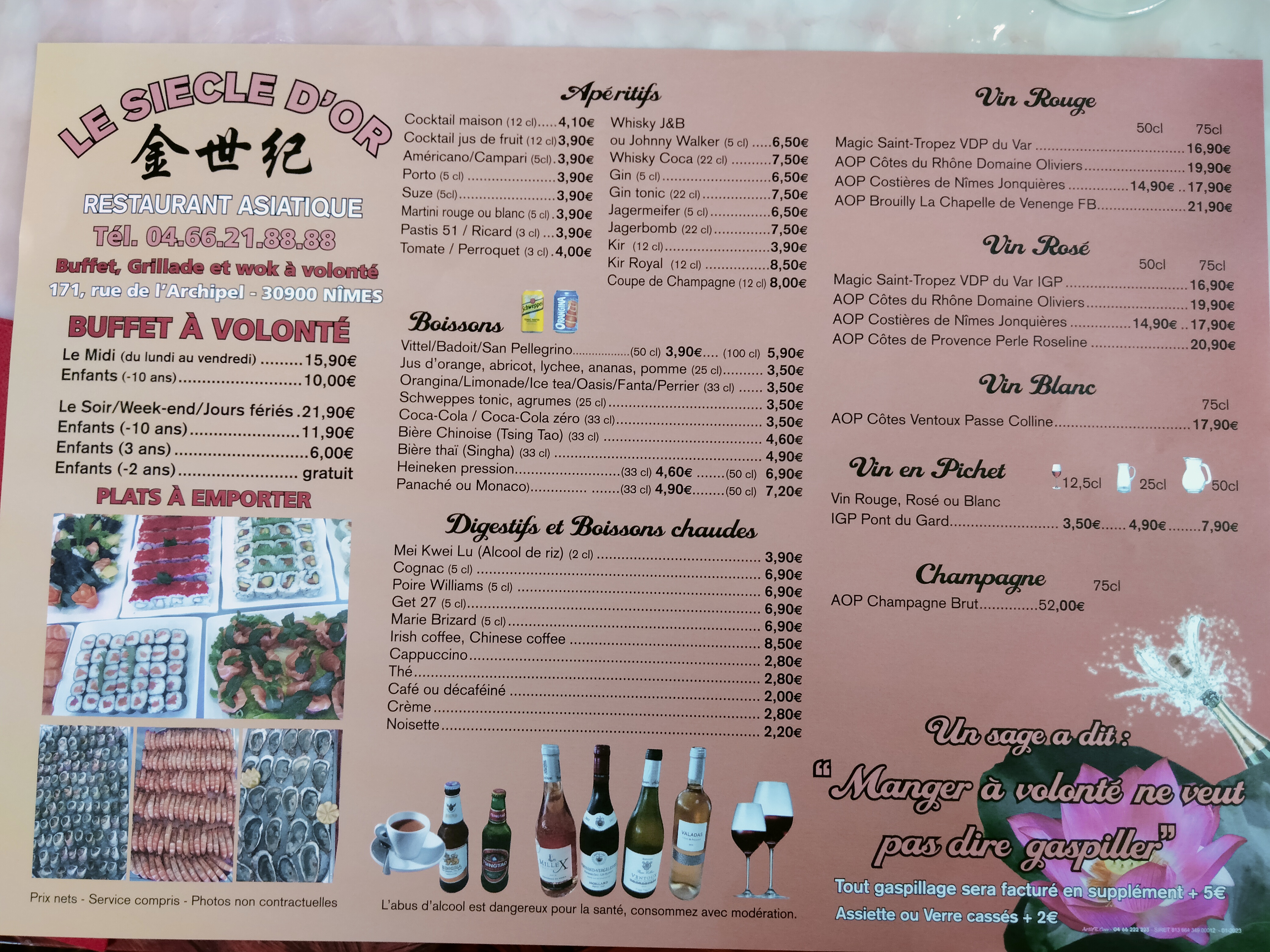 J'ai récemment visité le restaurant chinois Le Nouveau Siècle d'Or à Nîmes et je dois dire que j'ai été agréablement surpris. Bien que j'y sois allé un lundi, le buffet était un peu réduit en comparaison aux weekends, sans huîtres ni saumon cuit, mais cela n'a pas gâché mon expérience. Pour seulement 16,90€, le prix était très abordable. Les plats proposés étaient délicieux et de grande qualité. Je recommande vivement ce restaurant pour ceux qui cherchent un bon repas chinois à Nîmes. Si vous avez l'occasion, essayez-le un weekend pour profiter d'un choix beaucoup plus large de plats.