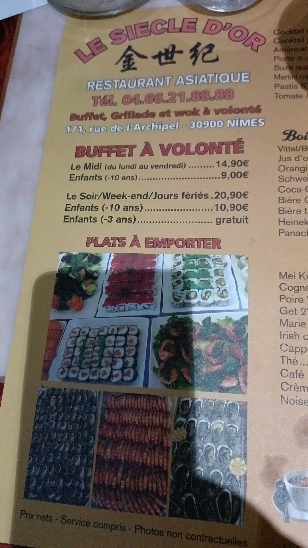 Sincèrement j’y suis allée aujourd’hui je déconseille la nourriture vraiment pas top il manquait des desserts le repas a 21,90 sans boisson et l accueil pas terrible