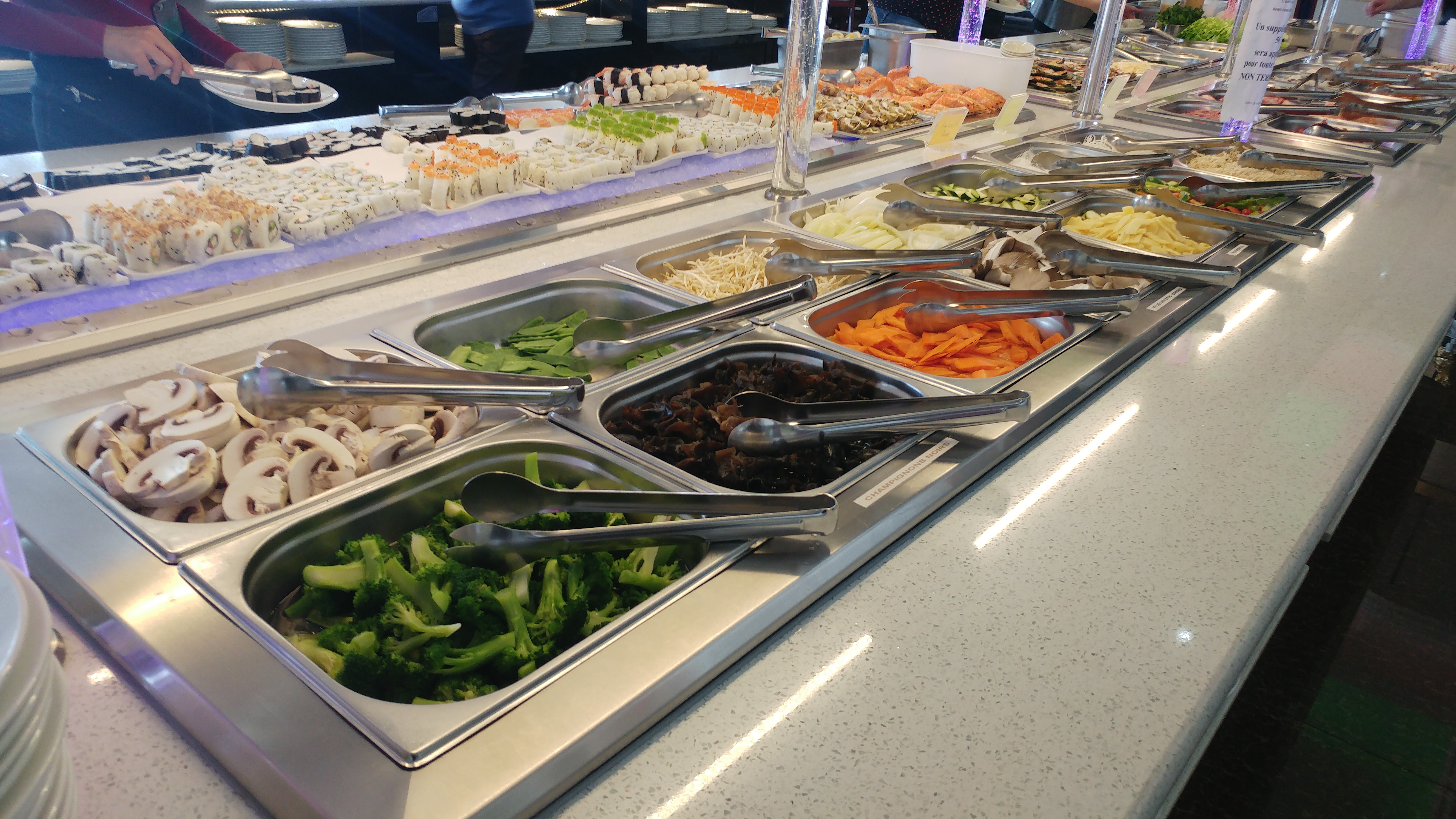 Pour les entrées: Les sushis sont simplement une boule compact de riz avec une tranche transparente de saumon, fritures surgelées et 3 salades toute prêtes… Pour les plats: 4 plats qui donnent pas trop envie et la viande “fraîche” qui est limite pas appétissante Les desserts: des glaces et des mini viennoiseries surgelées L’accueil digne d’une cantine militaire où même pas un bonjour par du personnel qui parle a peines le français. Je m’attendez pas à grand chose mais c’est catastrophique, même à 16€ je préfère aller ailleurs. Plus jamais.