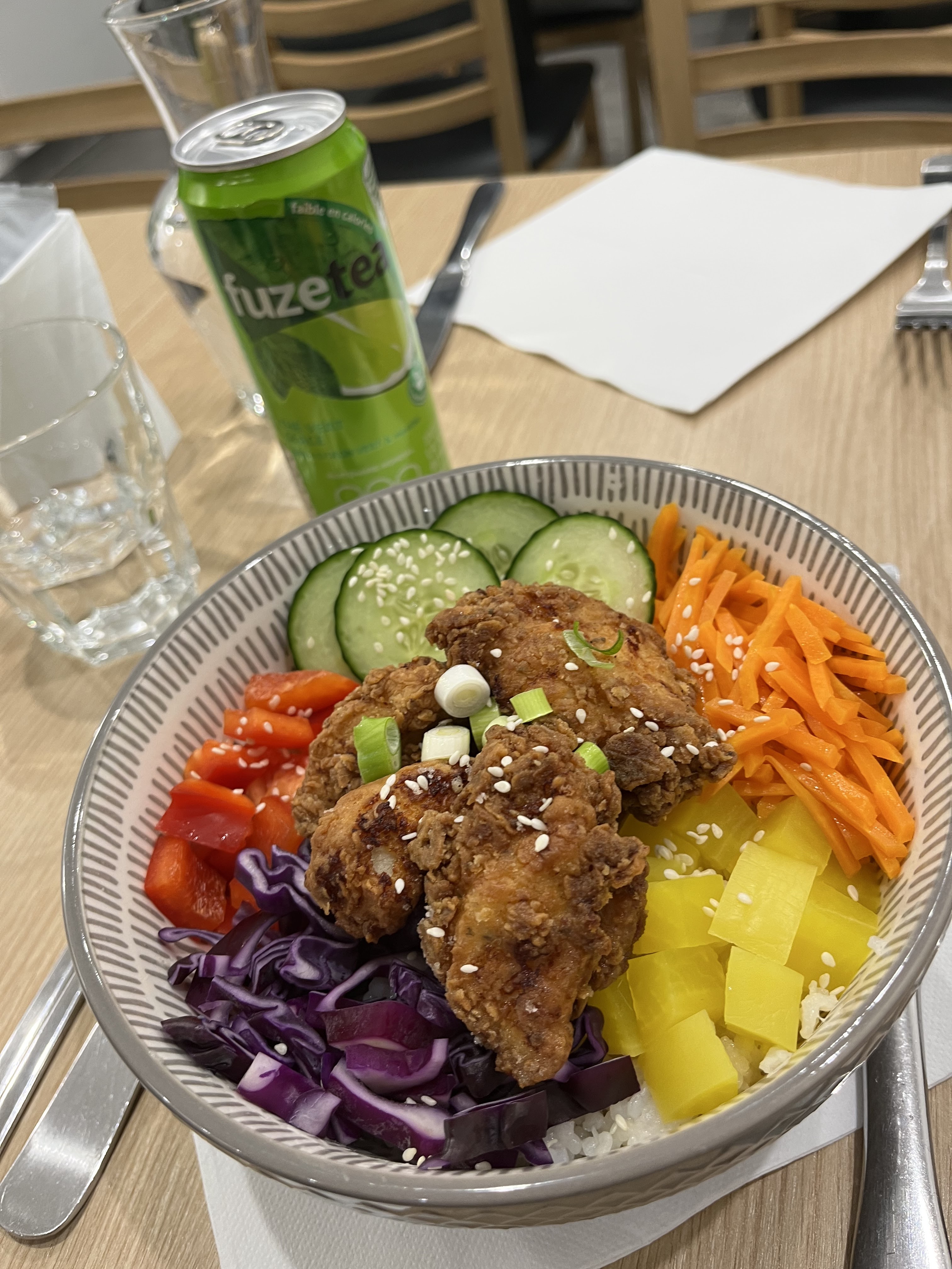 Je suis pas du genre à donner des avis mais pour le coup je me devais de saluer ce super restaurant d’inspiration asiatique qui vient s’ouvrir sur Angers. Le poulet frit « honey butter » était un délice (une des meilleure saveur que j’ai pu connaître, et le poulet est halal!) les « kimbap au saumon » incroyables. Je recommande les yeux fermés, avec un rapport qualité prix incroyable, des quantités généreuses et -15% pour les étudiants ! Merci encore pour l’accueil et ce super repas dans un ambiance sobre et agréable