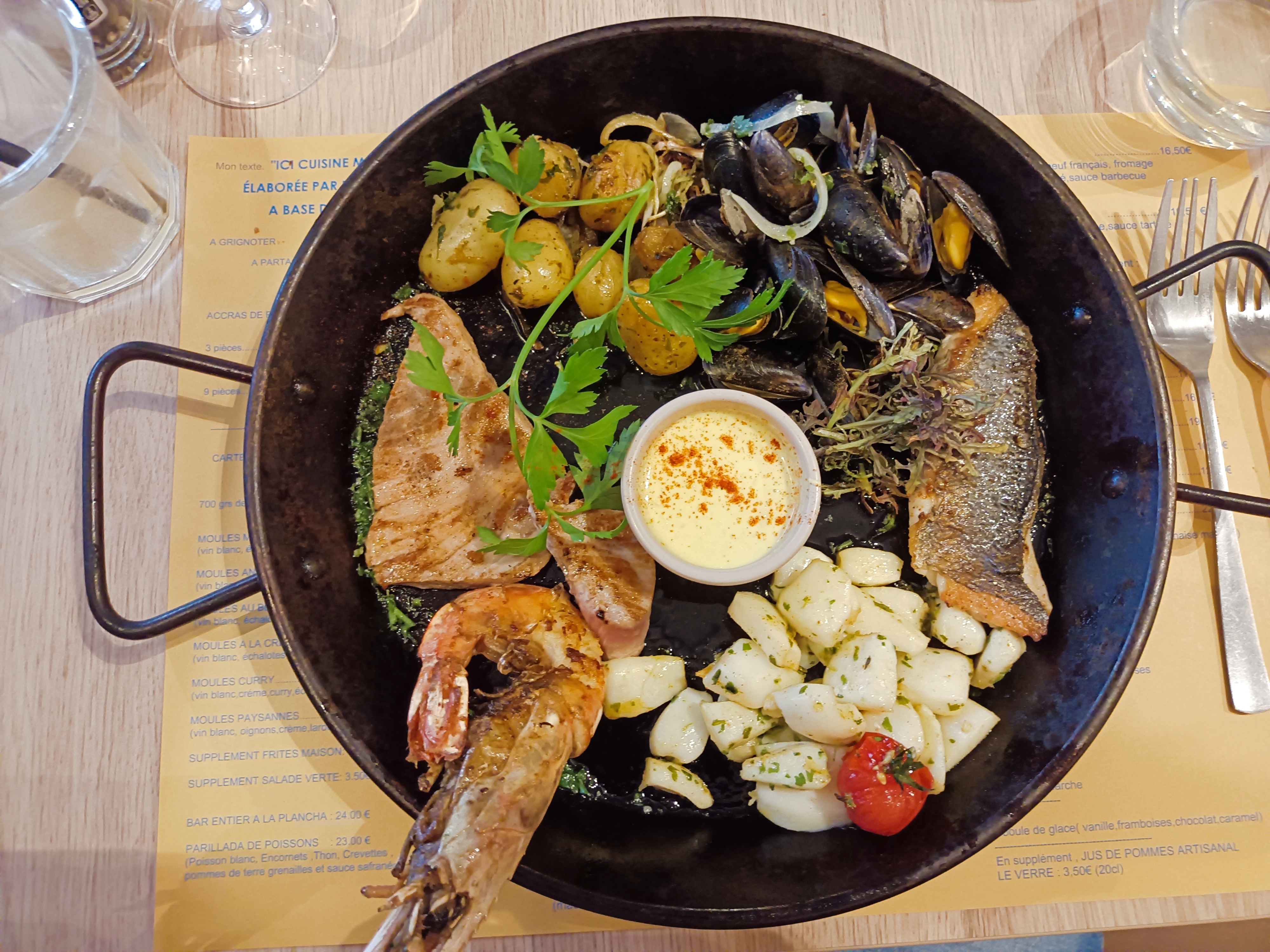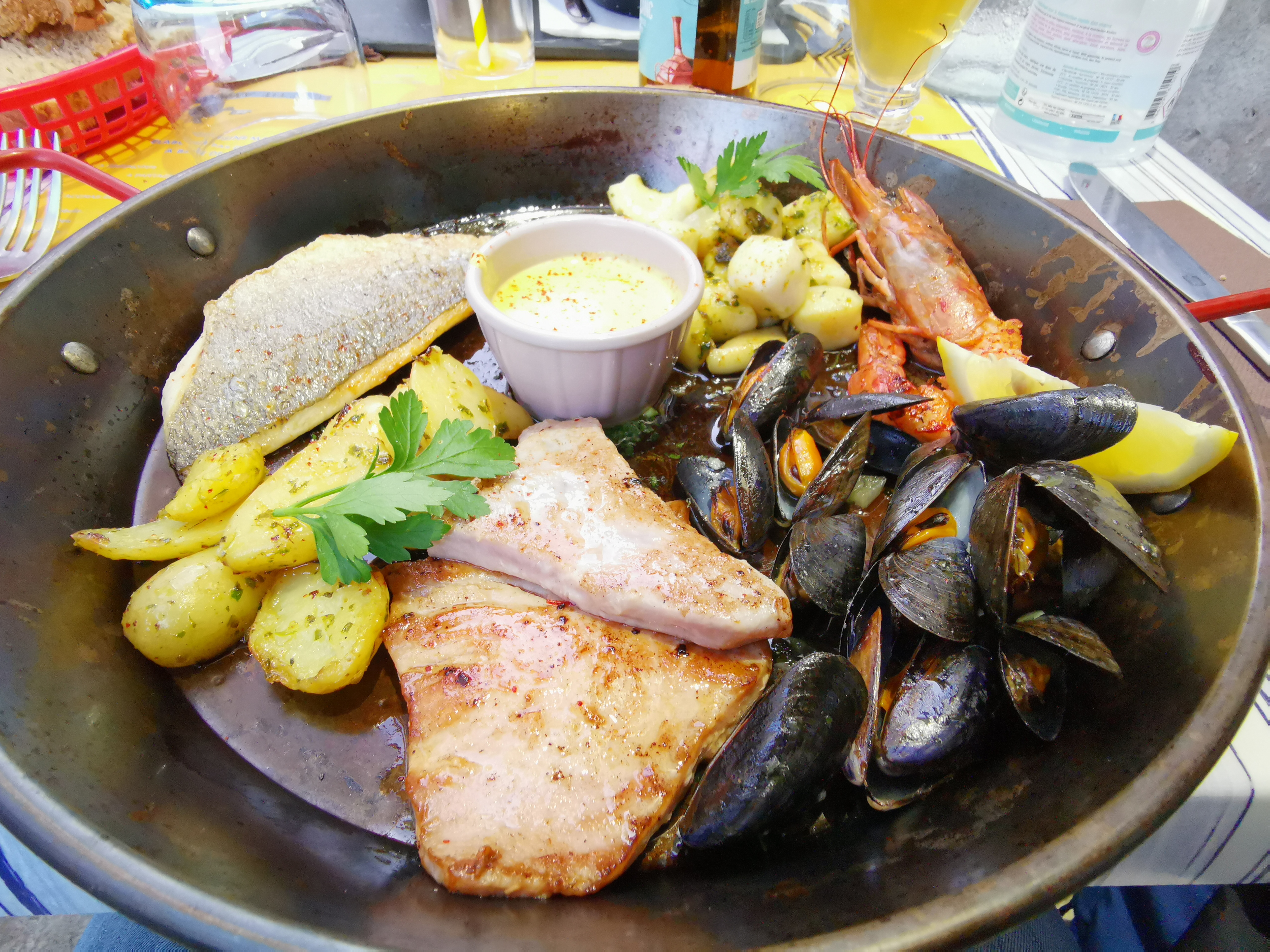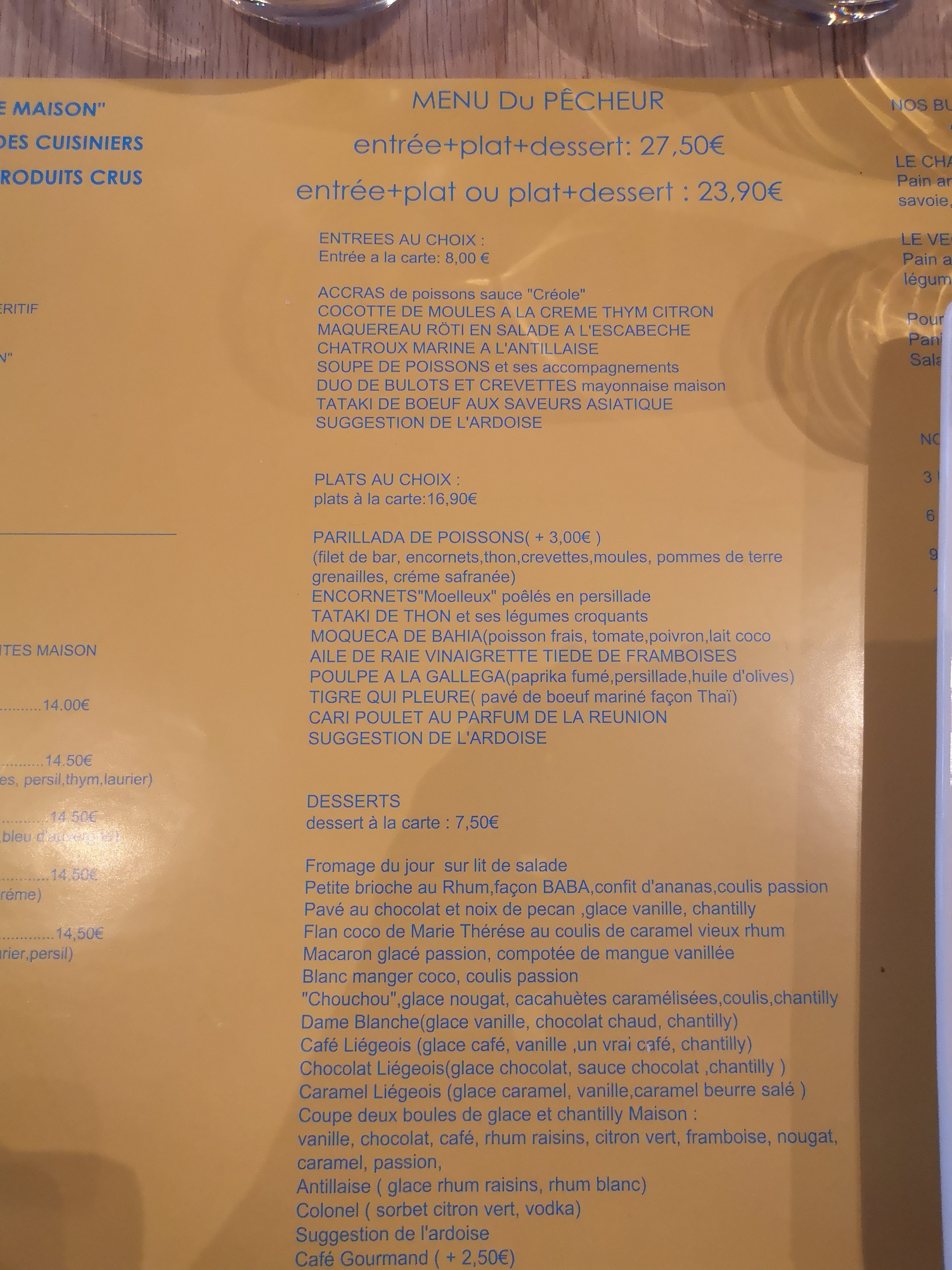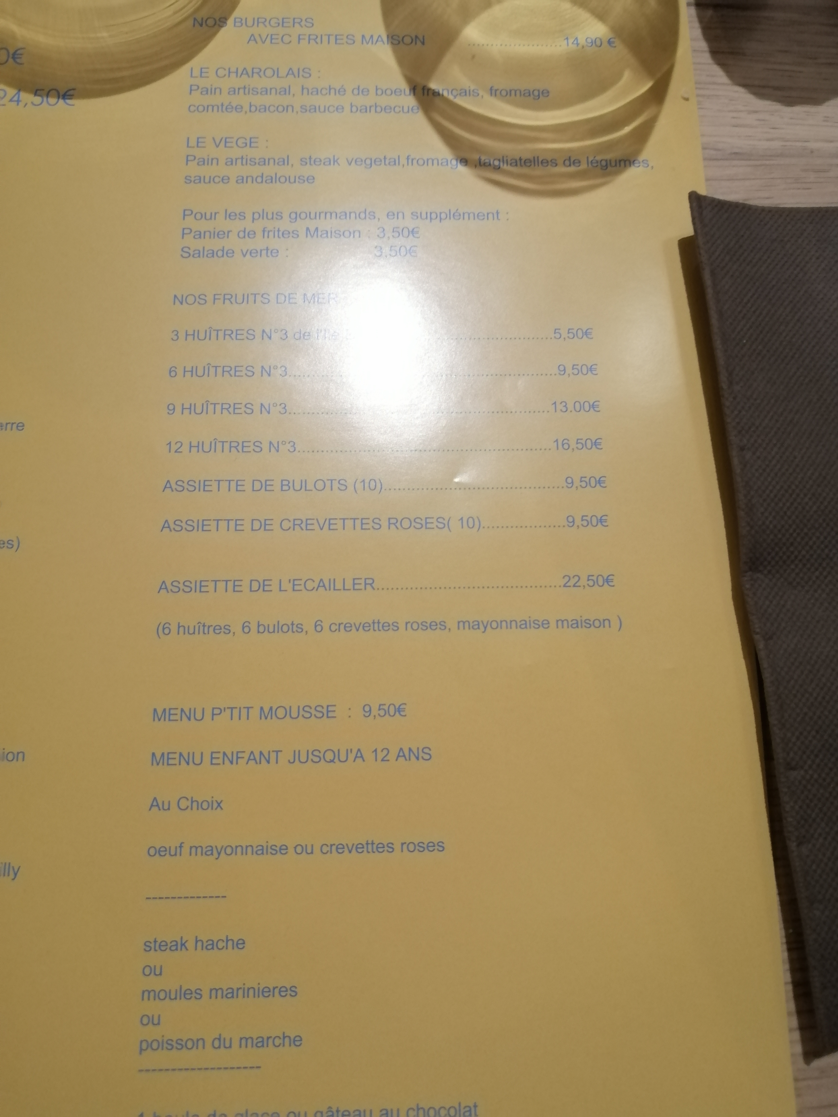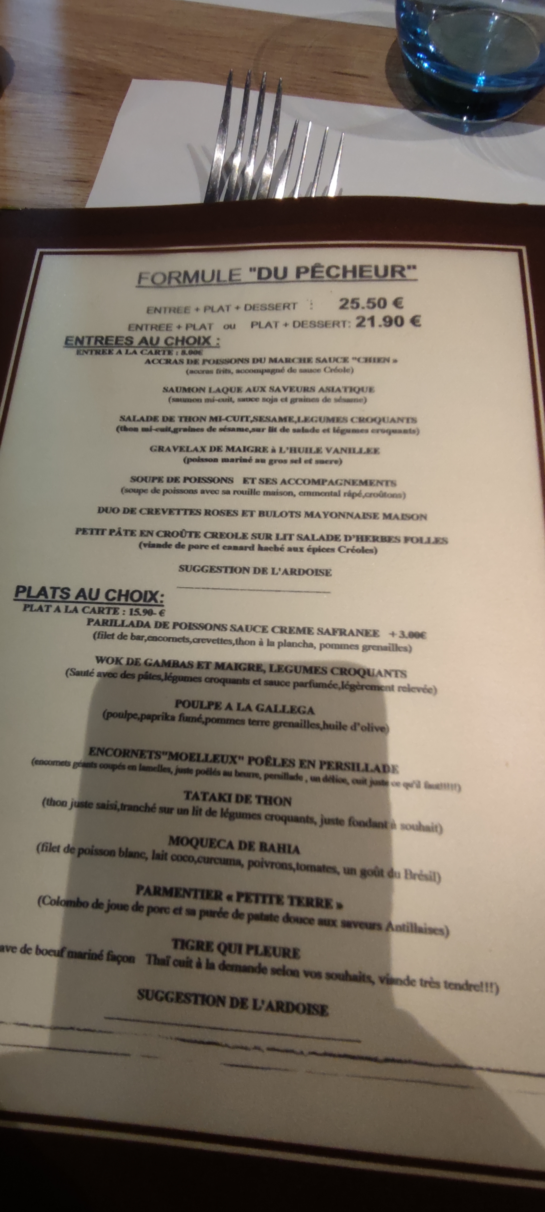 Un menu pêcheur à 19€90 : entrée+plat ou plat+dessert. La salade au poulet est très bonne (une excellente sauce) et les moules en plat est aussi bon ! À essayer ! P.s : réservez à l'avance !
