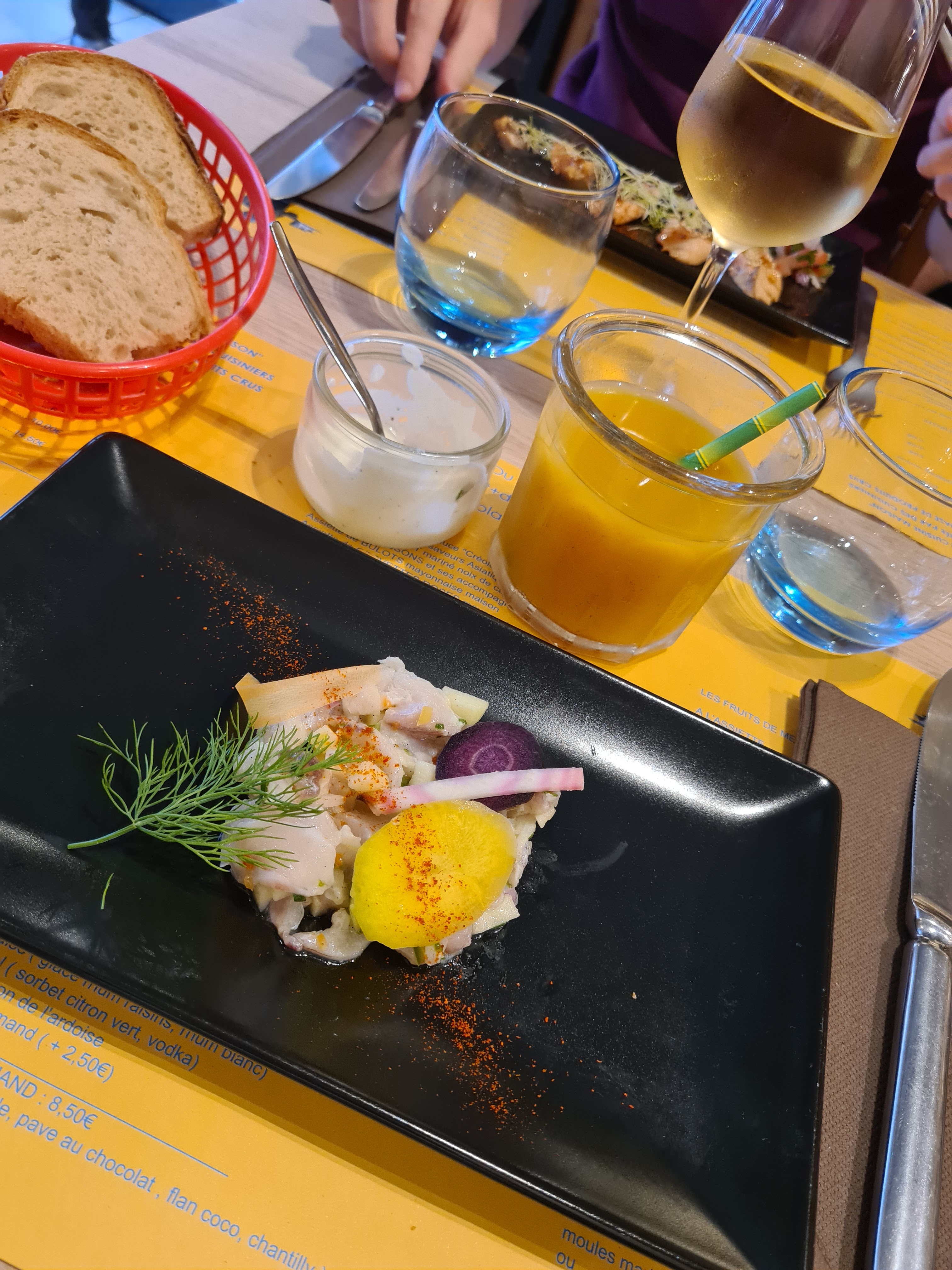 Nous sommes venues à La Rochelle. Premier soir, petit restaurant. Petit sauce avec du pain offert pour l’apéro : cela commence bien. Cocktail à 6€ (bcp moins chers qu’à certains endroits). Mojito trop fort et sans sucre (6€ de perdu…). Le spritz est correct. Les moules arrivent. Le service est vraiment rapide. 14€50 moules + frites maison. Frites : top Moules curry : déçues… moules ok mais sauce est vraiment trop liquide.. Pour autant, le personnel est agréable. Ce n’est pas un mauvais restaurant mais nous ni retourneront pas.