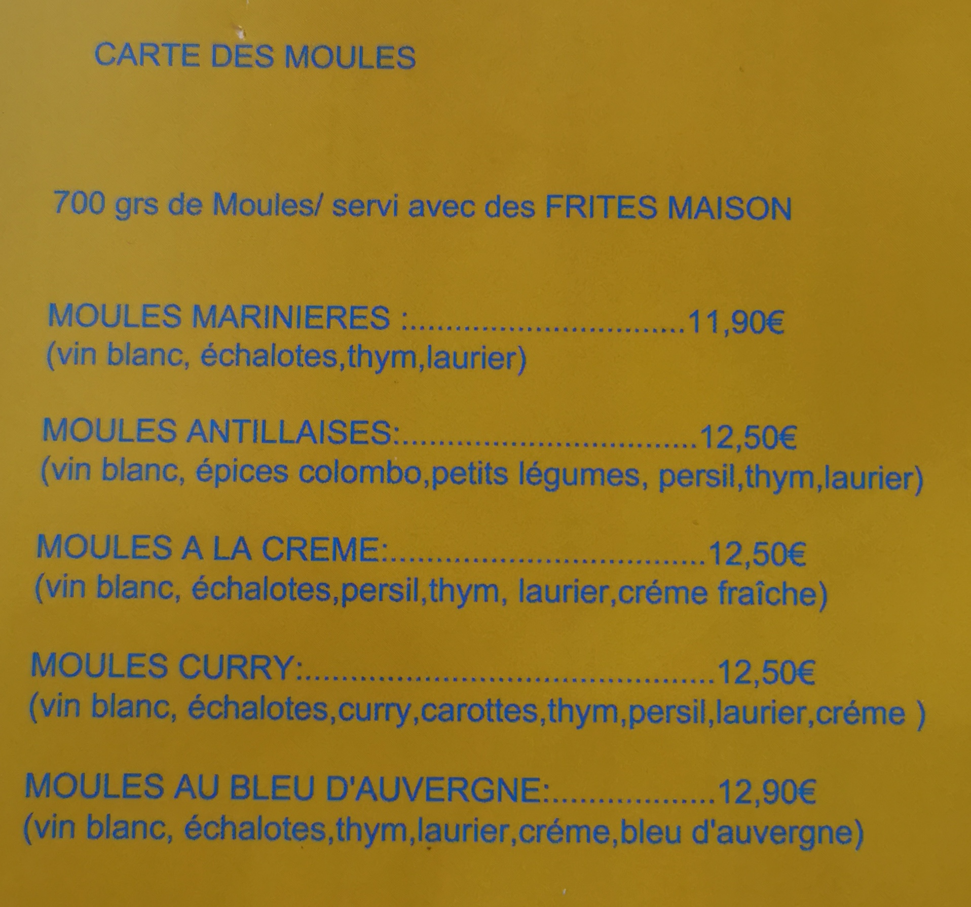 Un petit restaurant qui vaut le détour. Une patronne sympa, pleine d'humour et serviable avec chaque client. Le service, en général, est très bien. Quant aux moules ... Elles sont très très bonnes et à des prix vraiment corrects (12€50) pour des recettes originales. Le flan coco est à tomber ! Je recommande 🙂