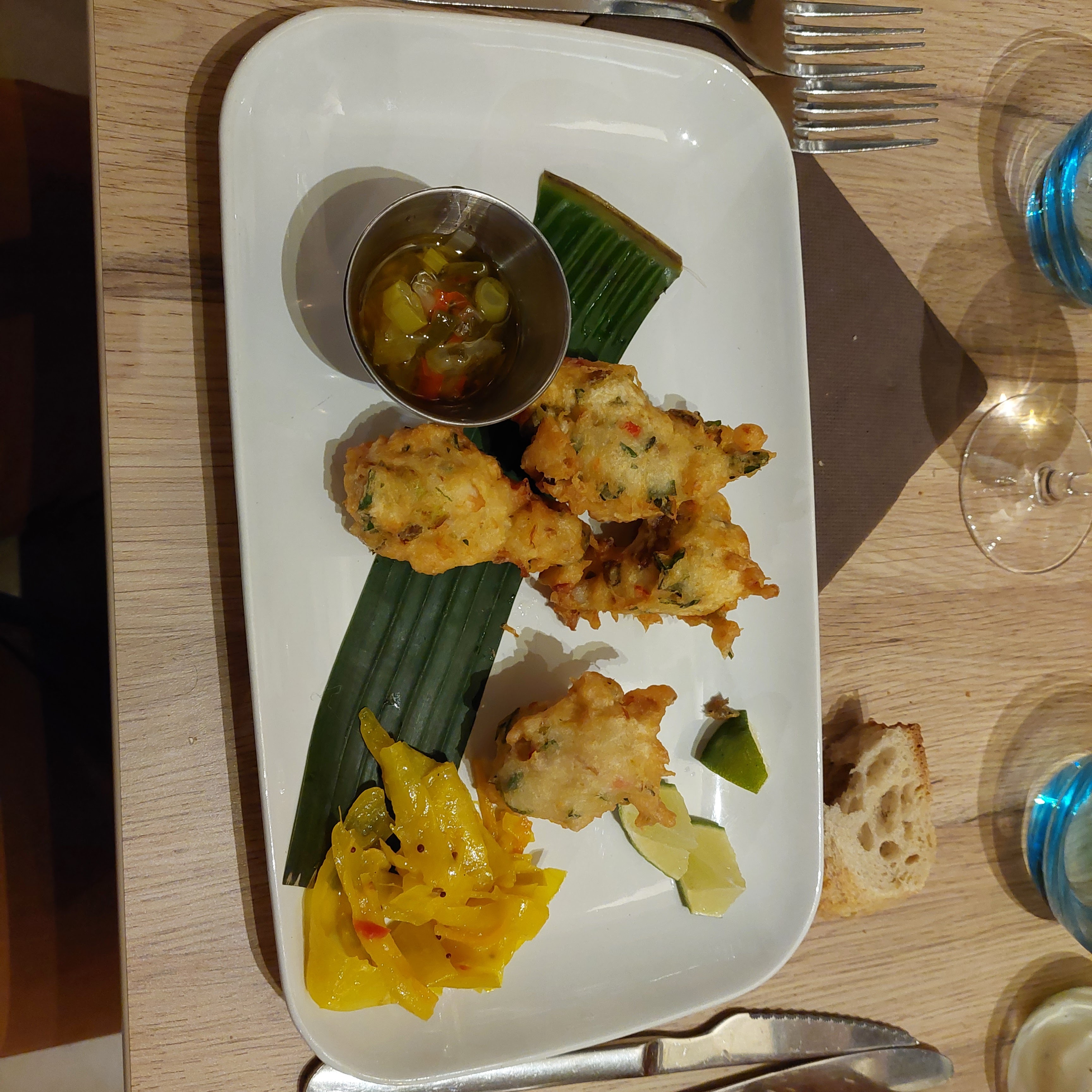 Restaurant de produits de la mer, de saveurs créoles et asiatiques. Les serveurs sont gentils et chaleureux. On nous a offert du fromage frais aux herbes et à l'ail en attendant les plats. Le plat d'accras avec la sauce était hyper bon. Les moules et les frites aussi : très bon et frais. J'ai trouvé les portions de moules et de frites très, voire trop copieuses. Le plat de Moqueca de Bahia (lotte, lait de coco, tomate, sauce brésilienne) servi avec du riz était bon et mari bien les saveurs exotiques et celles de la mer. La présentation des plats est jolie. Le restaurant se trouve au vieux port. Le prix très abordable : 50€ pour 3 pers donc ~17€/pers !