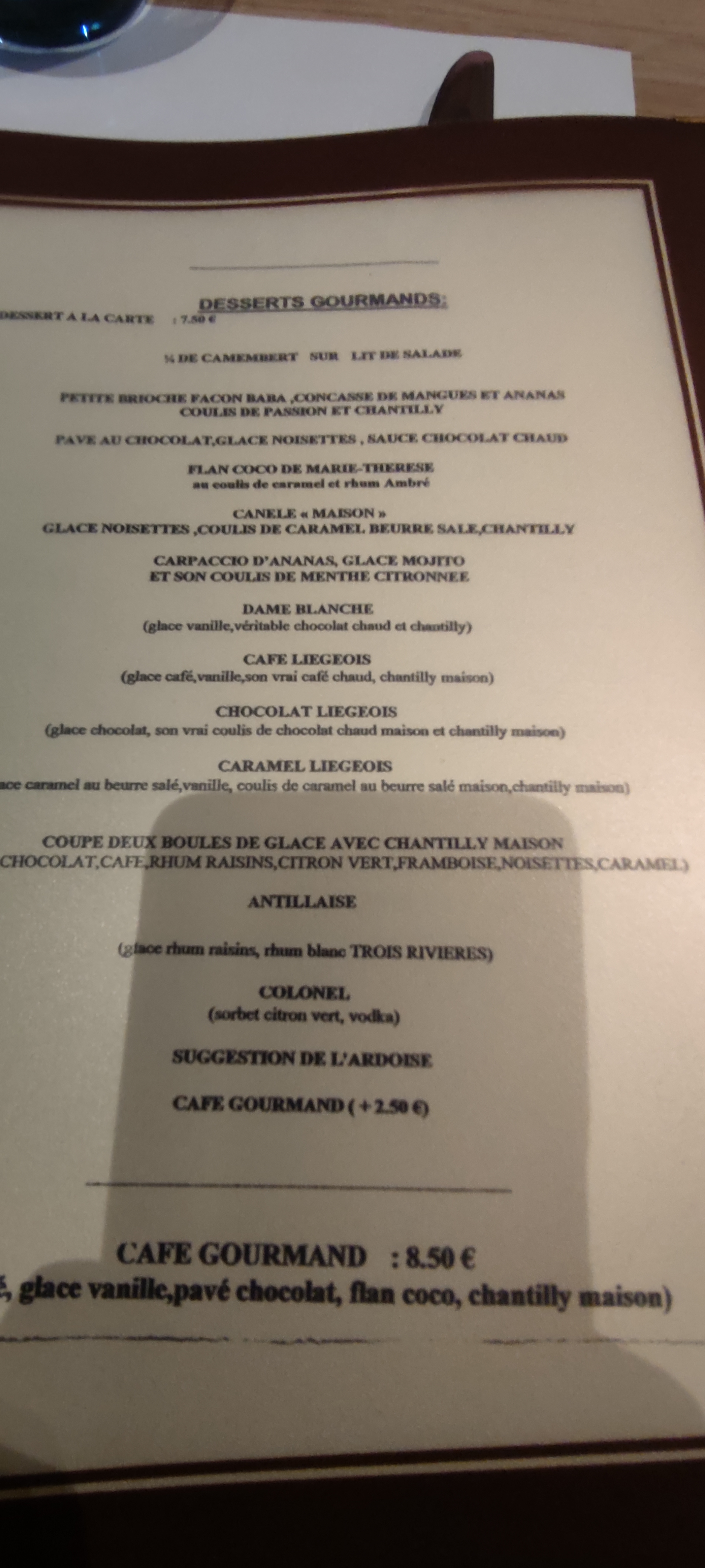 Et bien franchement il se moque du client. il y a le sourire mais c'est tout la cuisine est insipide, alors qu'il y a des jolis nom sur la carte. En quantité, qualité ce n'est pas au rendez vous. - Salade de poulpe, nulle - Carpaccio de maigre, zéro -Papillote de maigre tahitienne en feuille de banane il y a que la feuille de banane qui est vrai et on cherche le maigre entre 4 rondelles de tomates crues - filet de Bar au youzou, très insipide et froid Franchement ils ont de la chance de travailler par obligation car les autres restaurants refuse tellement qu'il y a du monde le samedi soir au port de la Rochelle. Je vous déconseille de rentrer dans ce restaurant si vous voulez pas vous faire avoir. Je vous joint une photo d'un café gourmand avec deux pointe de Chantilly, un choux infect avec du chocolat acide, une soit disant crème brûlée virée et un quart de fondant chocolat pour 8,50€ et assiette ébréché pour terminé la petite touche de leur incompétence et bien ils ont franchement pas honte. J'appel cela du foutage de gueule Avis aux amateurs