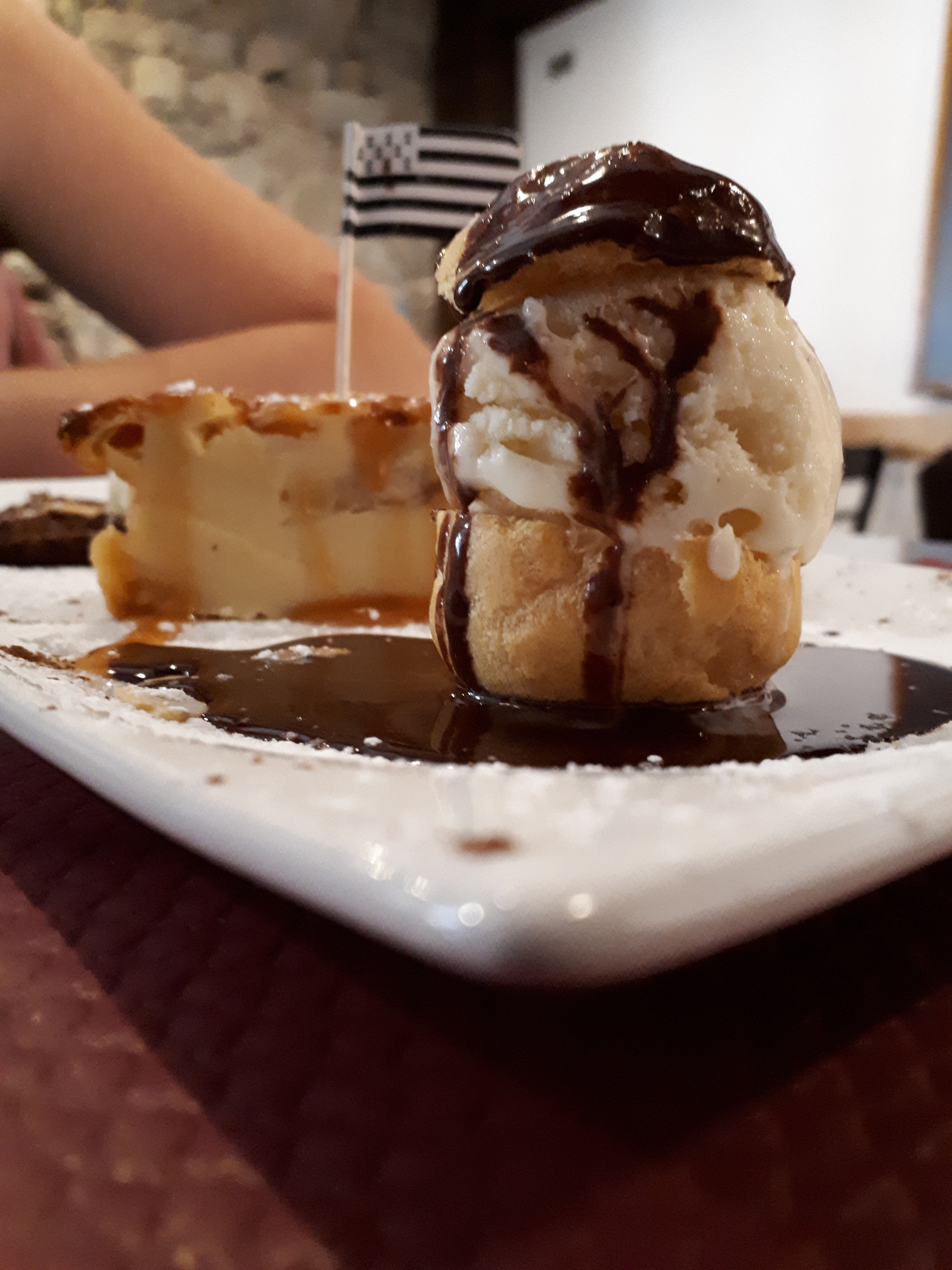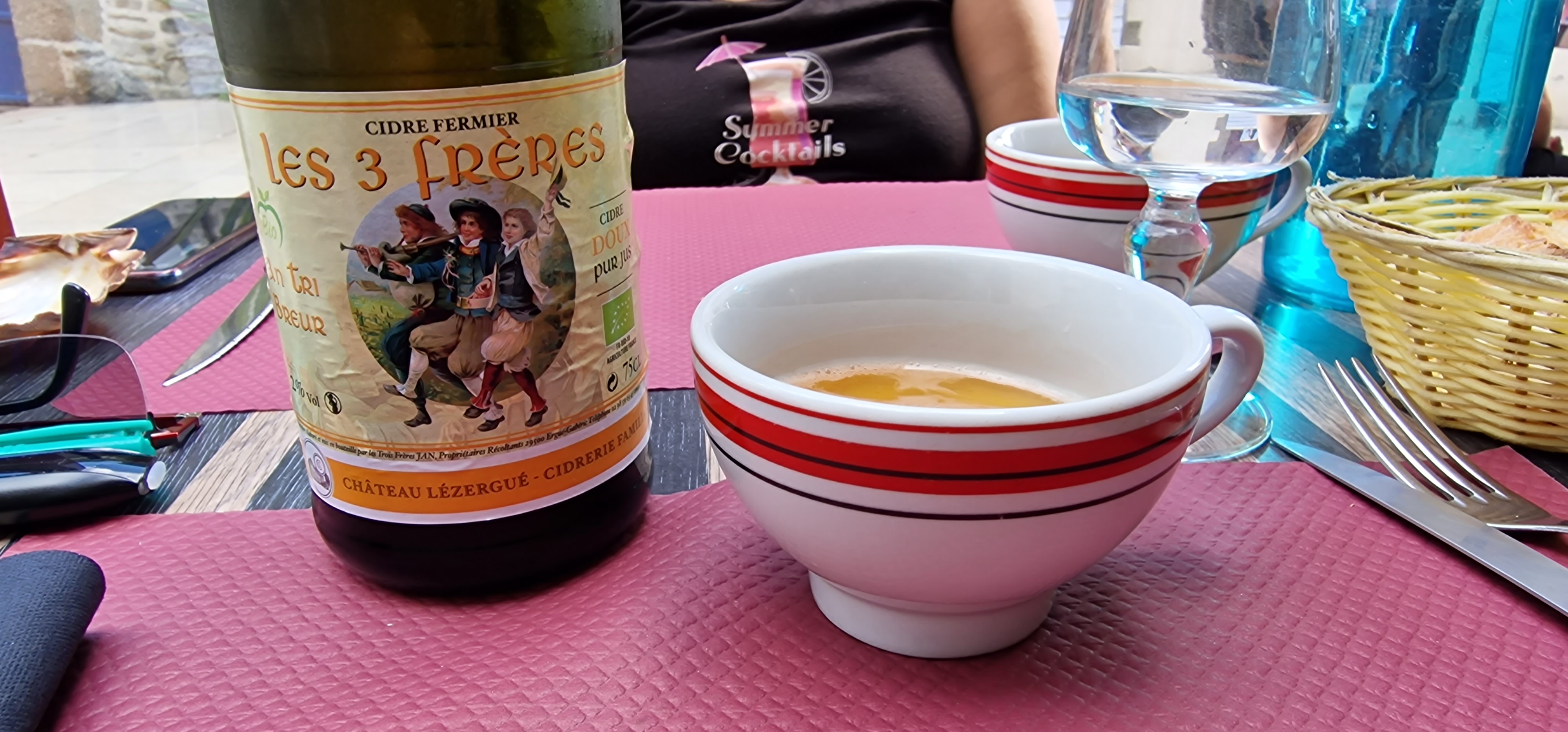 Une belle promenade dans la ville close nous ouvre l'appétit. Nous avons trouvé cette crêperie fort sympathique avec une charmante serveuse qui nous a fait déguster de très bonnes crêpes avec le cidre qui va avec. J'en ai prise une au miel et citron avec amandes grillées...avec en supplément une boule de glace au blé noir..... PARFAIT.