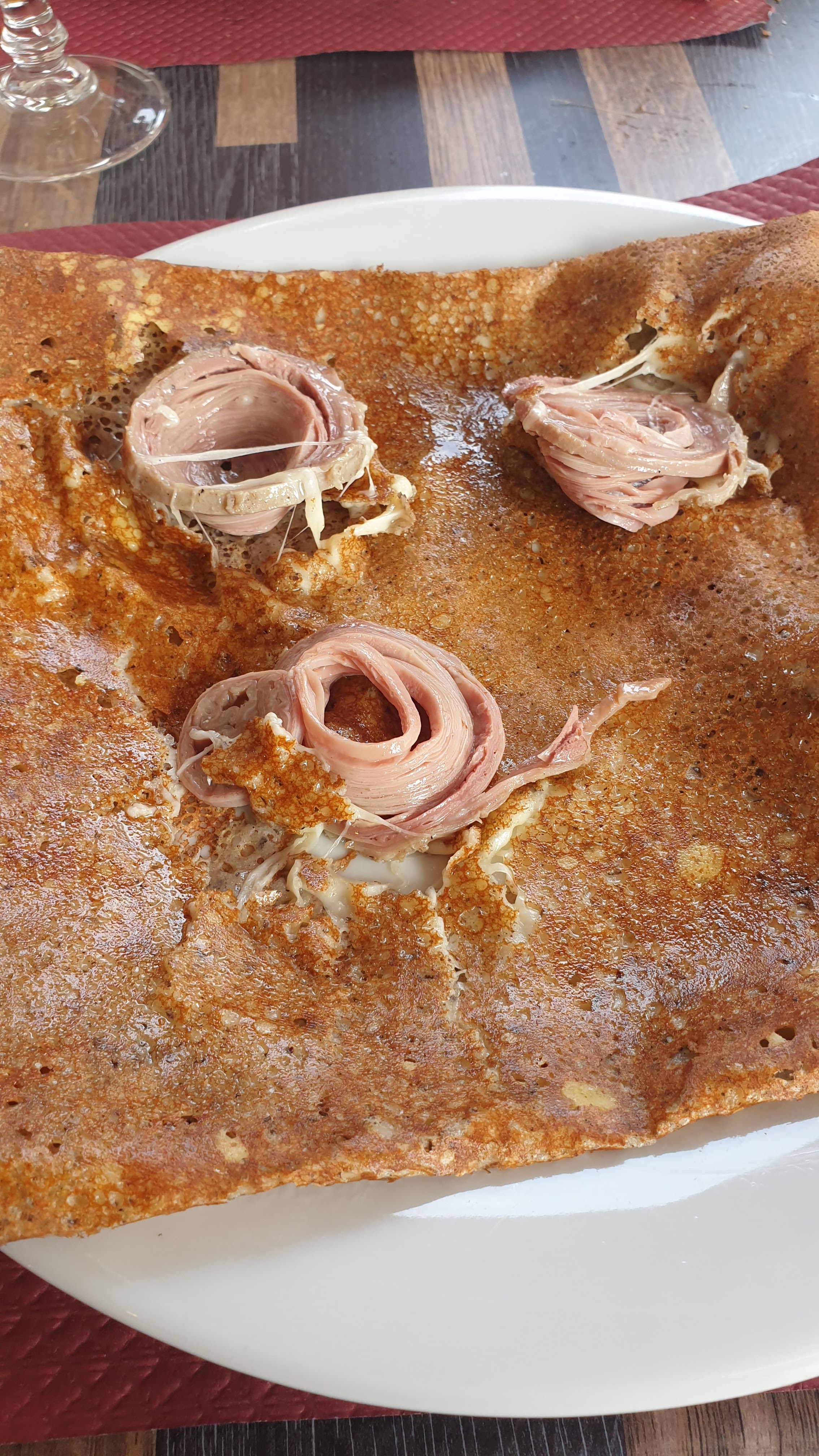 Ca fait toujours plaisir de manger des galettes mais malheureusement la pâte est très sèche, on dirait qu'elle est précuite. Le cidre menez brug est très bon et notre serveuse principale était accueillante. Cependant nous n'avons pas apprécié de surprendre d'autres membres du personnel se plaindre de nous pendant que nous étions encore là. Elles se pensaient sûrement hors de portée car nous étions à l'étage, malheureusement les toilettes sont au rez-de-chaussée... je n'enlève aucune étoile pour cet incident pour ne pas faire tomber la note à 2 étoiles.