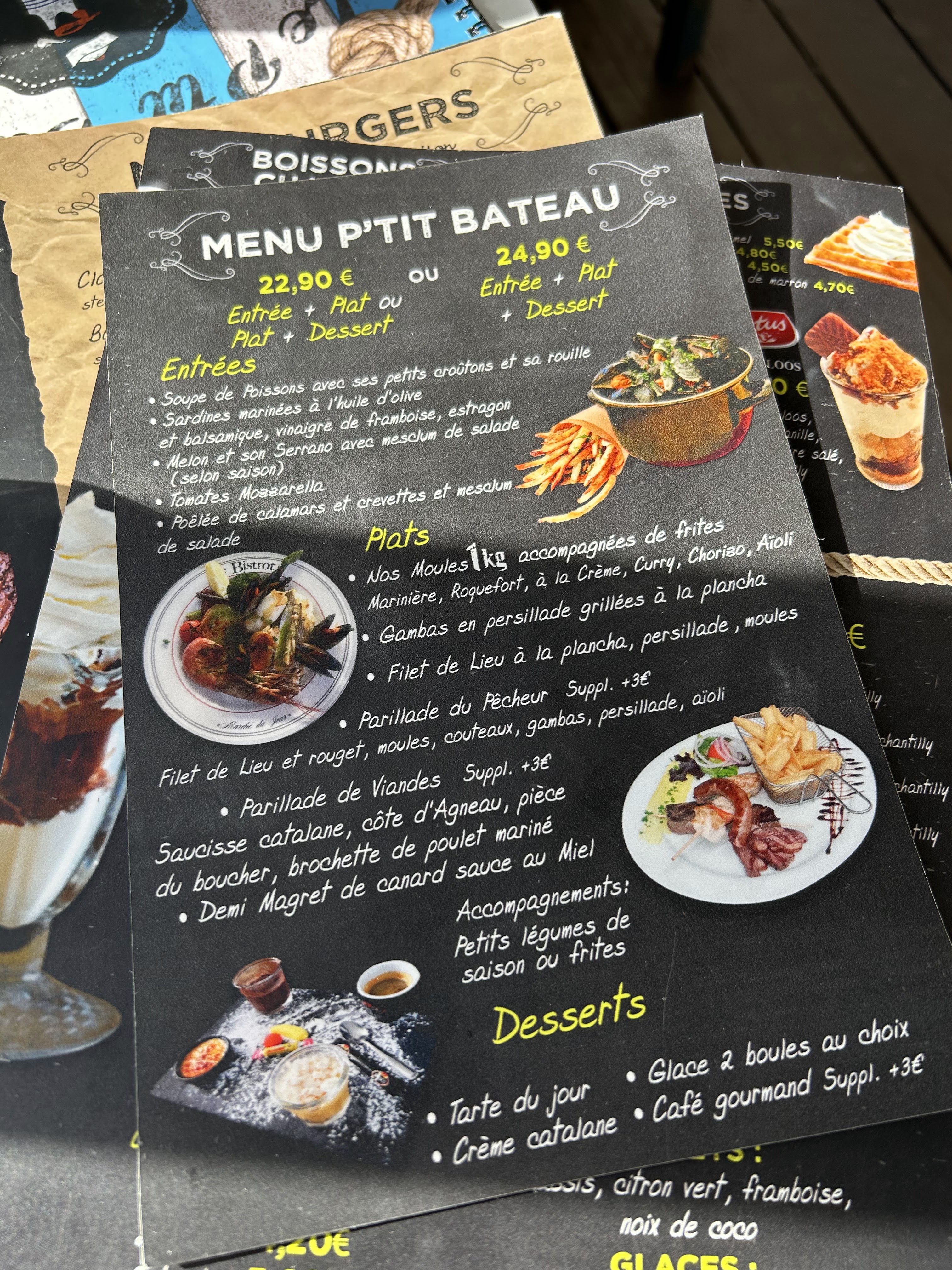 Très bon rapport qualité prix, avec plusieurs menus proposés ou plats à la carte. Personnellement, nous avons choisi le menu à 29€, verre de vin ( différent selon l'envie ) à chaque service, petit mousseux au dessert. Petite terrasse avec vue sur le port, très agréable ou salle climatisée en intérieur. Personnel au petit soin, très souriant et à l'écoute. Je vous le recommande.