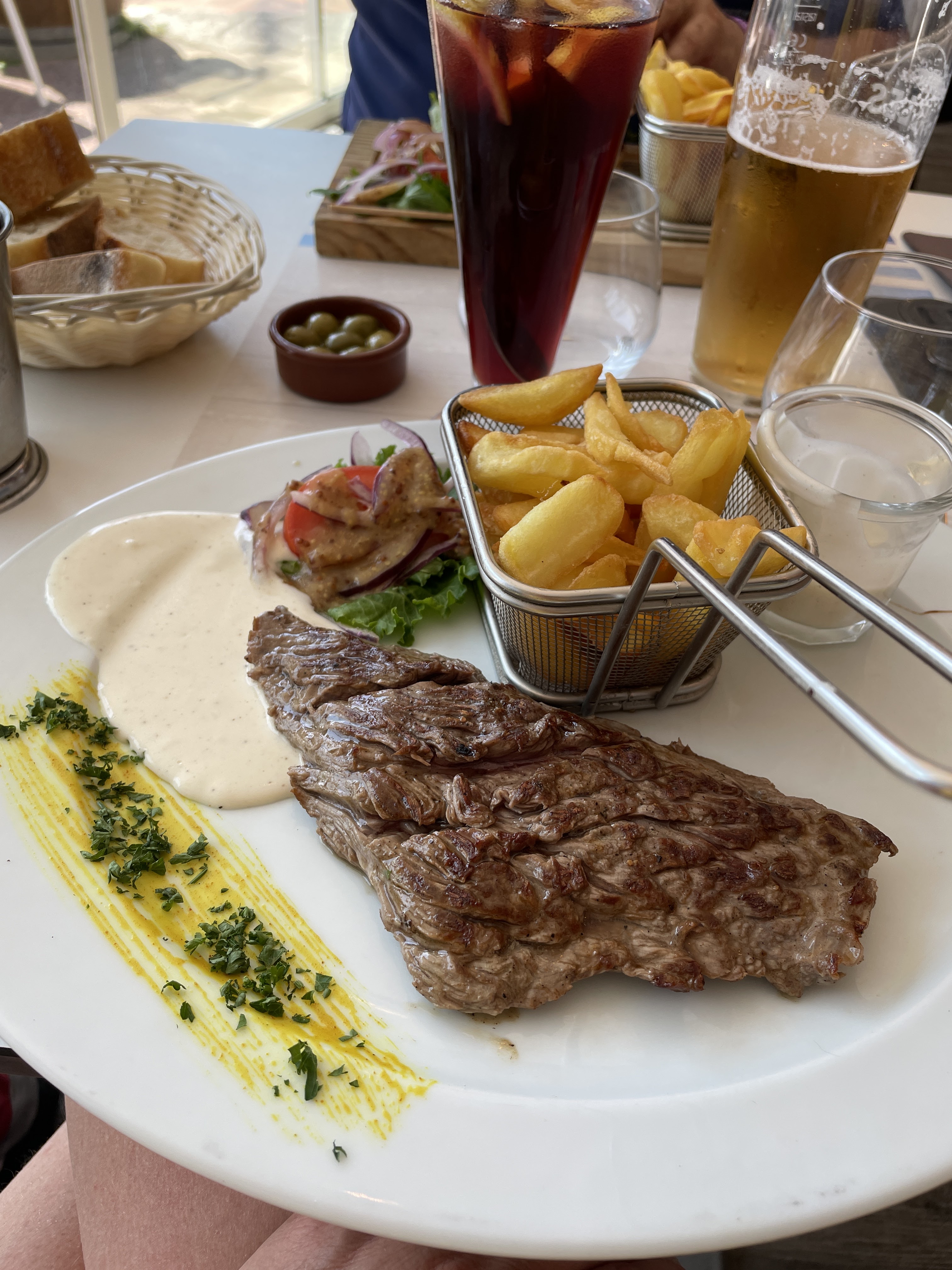 Un peu déçu de ce resto, on est venu à 3 en famille, cocktails en apéro, formule entrée/plat/dessert, résultat plus de 100€ ! Les cocktails sans être mauvais sont pas terribles, je me demande même si c'est fait maison, servi dans des verts opaques, ça ressemble à du jus préparé. Je cherche toujours la vodka dans mon cocktail. Les sardines marinées en entrées sont mal écaillées et avec les nageoires, les gambases correctes sans plus, l’entrecôte maturée bof, j’en ai mangé des meilleurs. Le personnel est gentil et sympathique mais le service trop long ! 2h un midi, c'est beaucoup trop. Un resto pour touristes comme les autres au rapport qualité/prix pas terrible.