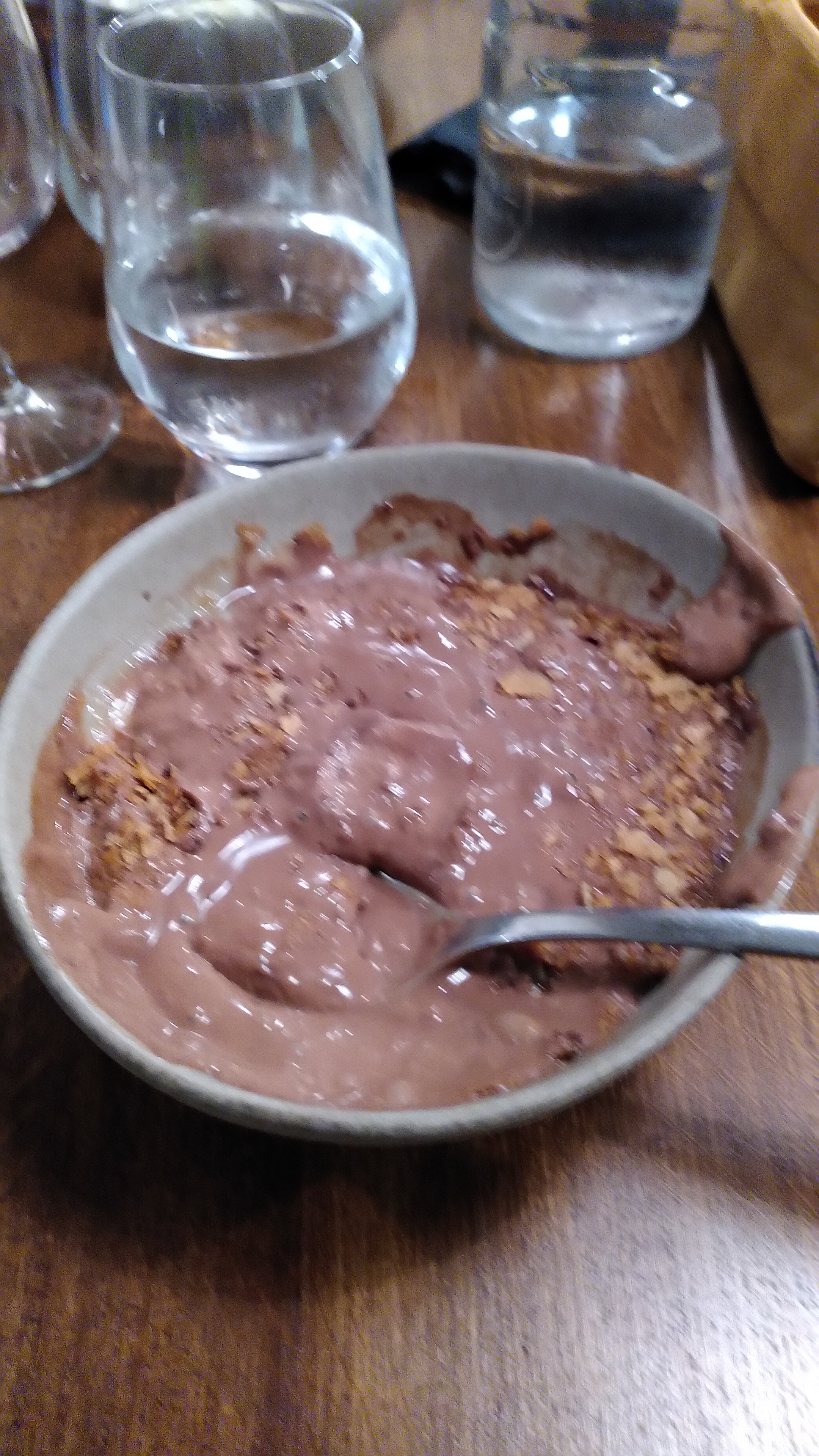 Quel dommage... j'étais prête à être compatissante, à chercher à comprendre pourquoi le service était aussi long, j'ai questionné le serveur...on a même plaisanté,ainsi qu'avec nos voisins de table, surpris eux aussi du temps entre 2 plats.... Puis est arrivée la mousse au chocolat...avachie, avec glace aux poires....fondue, j'ai eu la sensation d'être a l'HEPAD. Certes, on nous a offert le dessert...mais pourquoi aucune explication sur l'état de ce dessert informe ! Au lieu de cela, je me suis faite agressée par le responsable qui ne comprenait mon mécontentement. Plus un autre client qui, m'a conseillé d'aller voir en Afrique ce qu'on y mangeait...Quelle soirée !!!!!