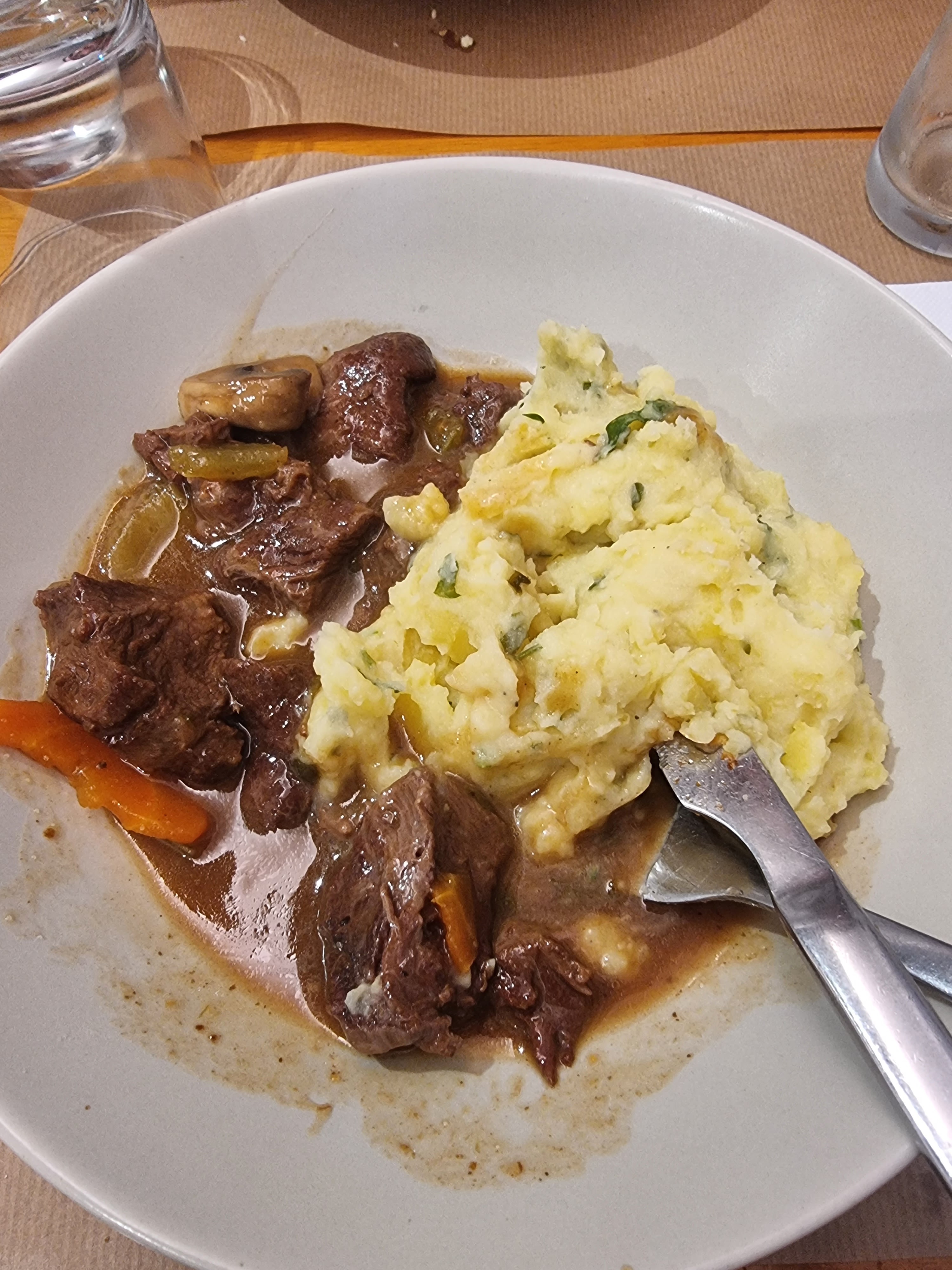 Accueil sympa. Mais repas basique, de peu de quantité et plein d'eau : pâtes non égouttées pourle plat, et au dessert un fraisier dont la génoise est spongieuse et décongelée, fade, très fade!