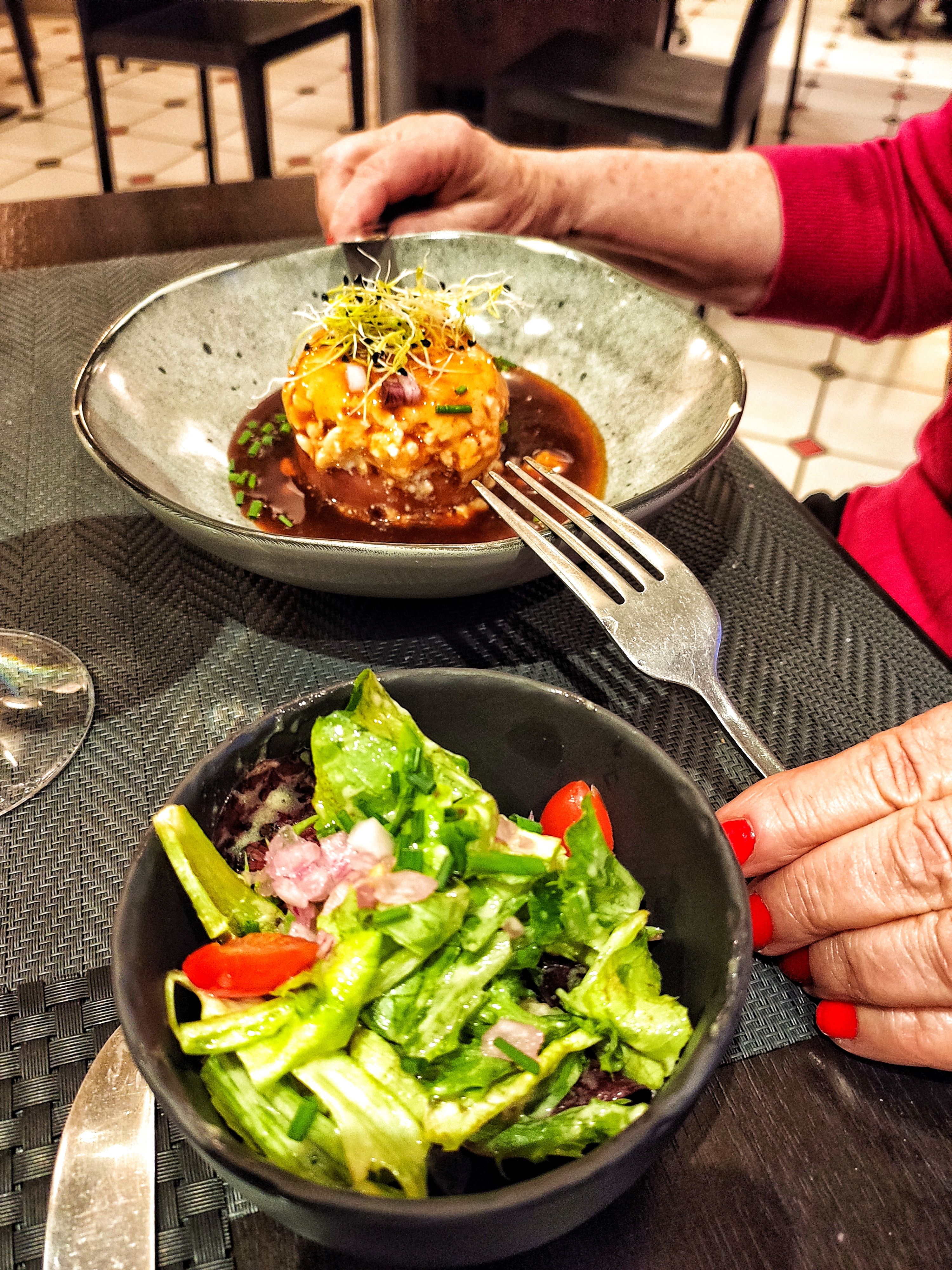Dans les plus du restaurant : Une belle carte avec des belle salades copieuses (même en petit format) et des jolies propositions de plats. Une terrasse. Une équipe très souvent souriante. Une facilité pour se garer Dans les moins : Des prix un peu élevés pour la région. un manque de chaleur dans la salle principale. Une vue pas au top de la terrasse. En bref, Une adresse très sympathique