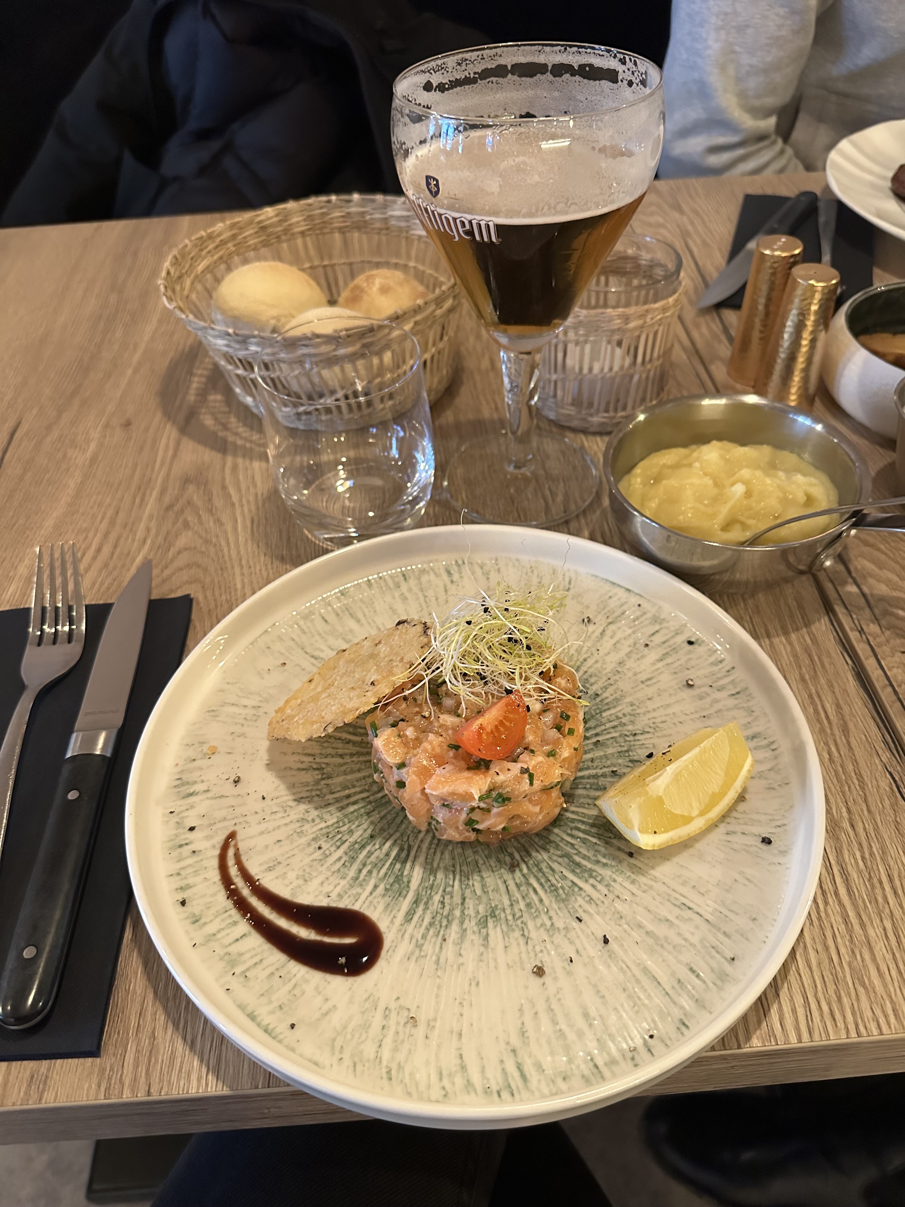 Expérience mitigée dans ce nouveau restaurant… les salades étaient tièdes alors que nous attendions du frais au vue des chaleurs extérieures. Assaisonnement très bon par contre. Tartare de saumon bon mais peu garni, rattes du touquet sèches. Concernant le service, attente très longue pour juste 3 salades et 1 tartare. Par contre mention spéciale pour le jeune serveur au top, qui s’investit corps & âme contrairement à la patronne qui semble préférer dicter quoi faire, sur un ton peu agréable, au beau milieu des clients… Pour les boissons, eau plate et pétillante dispo uniquement en 50cl, pas de grand format, peu recommandé dans un restaurant ! Cadre très agréable cela dit