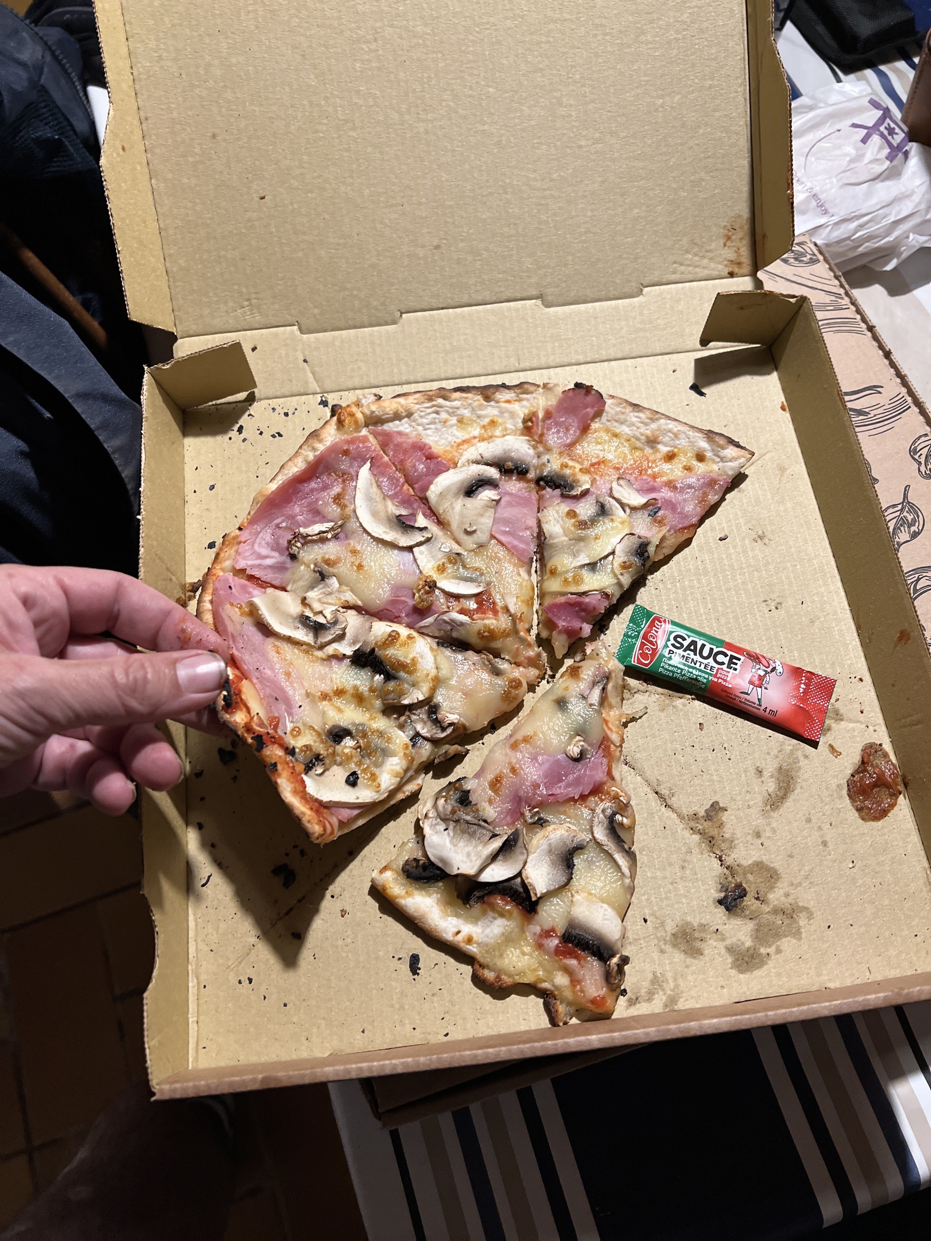 Parfait ! On commande nos pizzas à emporter... Il y a de l'attente (évidemment il y a du monde et ça chauffe en cuisine, c'est normal), on boit notre verre dans le secteur. Les pizzas sont prêtes et chaudes, prêtes à emporter. Un régal à la dégustation ! Merci