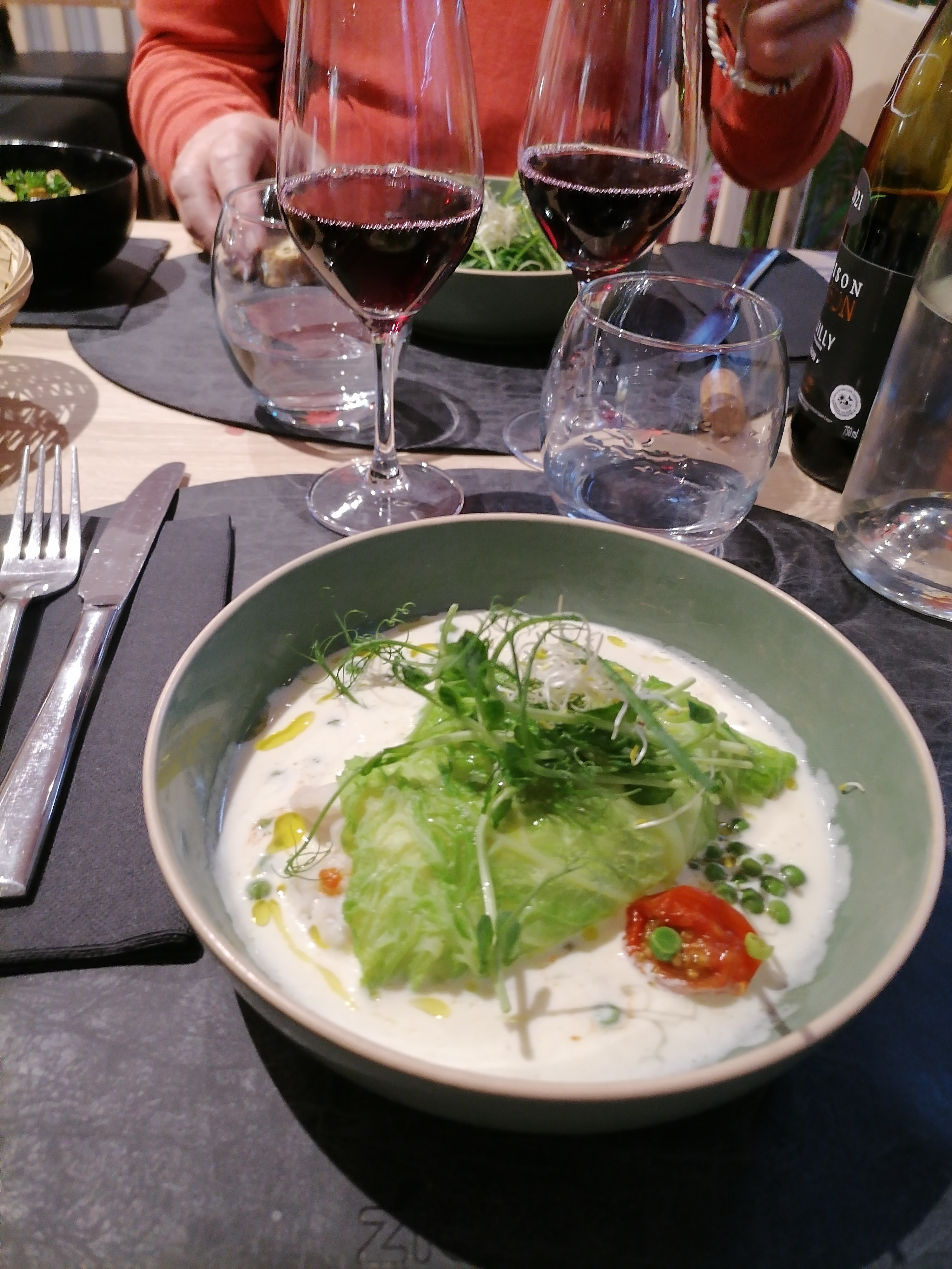 Nous avons été assez déçus d'apprendre que nous ne serions pas assis dans les grottes. peut-être devez-vous en faire la demande spéciale. Mon plat de thon 2 façons était délicieux et la multitude d'éléments dans l'assiette permettait d'essayer une douzaine de bouchées différentes. Cependant, les raviolis de ma femme n'étaient pas assez cuits et la sauce blanche était figée. Un plat exceptionnel et très terne. Le service était excellent et le concept de bouteille à emporter est très intéressant. Je préviens tous ceux qui souhaitent s'asseoir dans les grottes de le préciser sur leur réservation, car apparemment, faire une réservation 2 semaines à l'avance ne le garantit pas. J'ai demandé s'il était possible de s'asseoir là et on m'a répondu que ce n'était que pour les grands groupes. J'ai été très déçu de voir plusieurs 2 sommets ouverts lorsque je suis descendu là-bas pour voir les rouges disponibles dans la cave. Plus de chance la prochaine fois, je suppose.