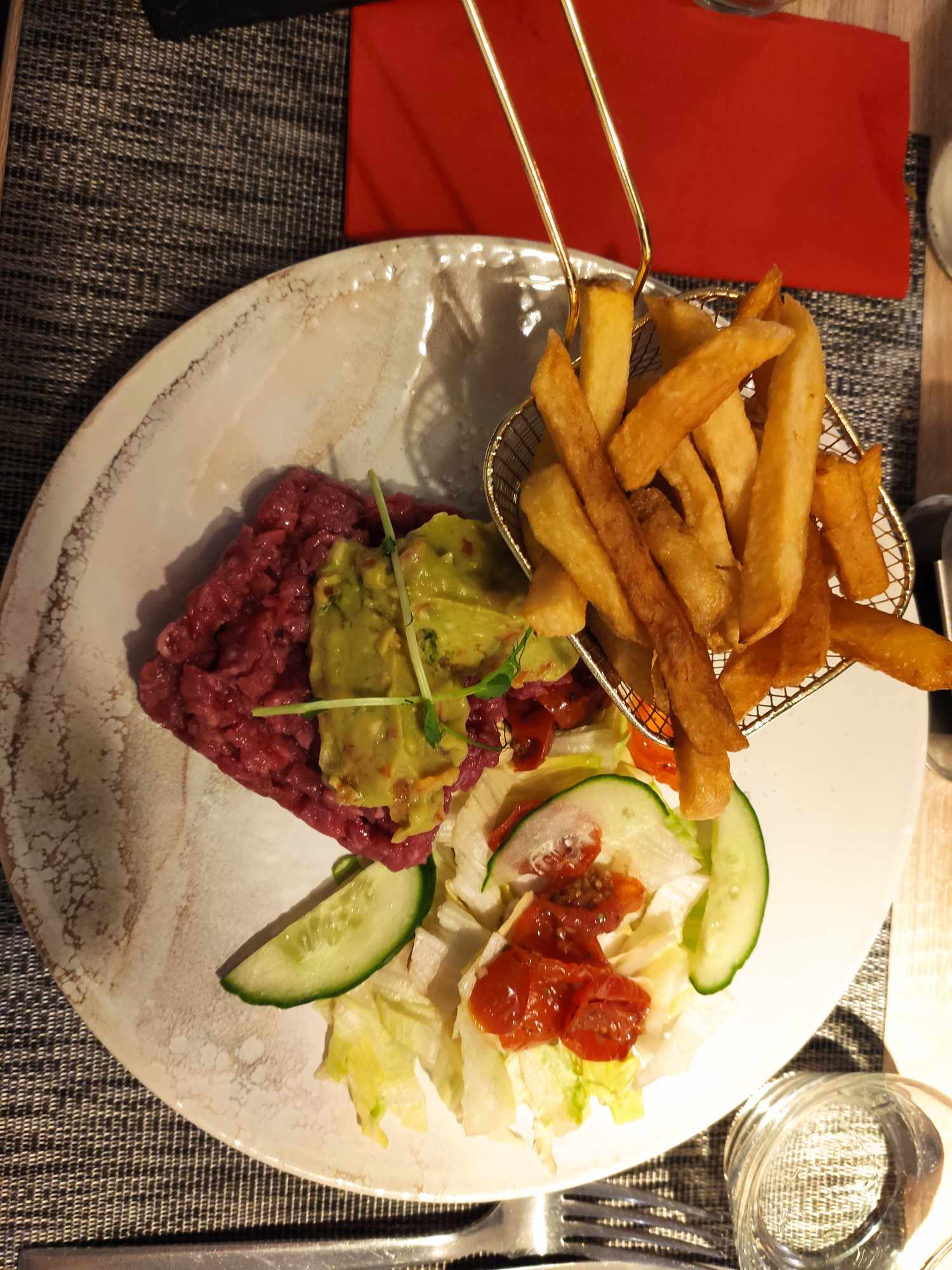 Accueil correct. Service très moyen, on ne nous a pas proposé les suggestions, pas proposé de vin ou de boissons pendant le repas, du coup on a pris que l apéritif (gratuit avec un bon de notre hotel et assez bon). Pour ce qui est du repas, les entrées étaient bien. Par contre les plats, c'est autre chose. Pas de demande du type de cuisson de l onglet de boeuf. Une personne sur 2 a aimé la cuisson (dommage la viande était bonne). Le burger, malheureusement rien n'indique sur la carte qu'il contient du fromage de chèvre? Et le tartare, peu appétissant et beaucoup trop de sauce dans la préparation, ce qui est très désagréable en bouche (peut-être que c est au goût d'autres personnes). En conclusion, peut-être un mauvais soir.