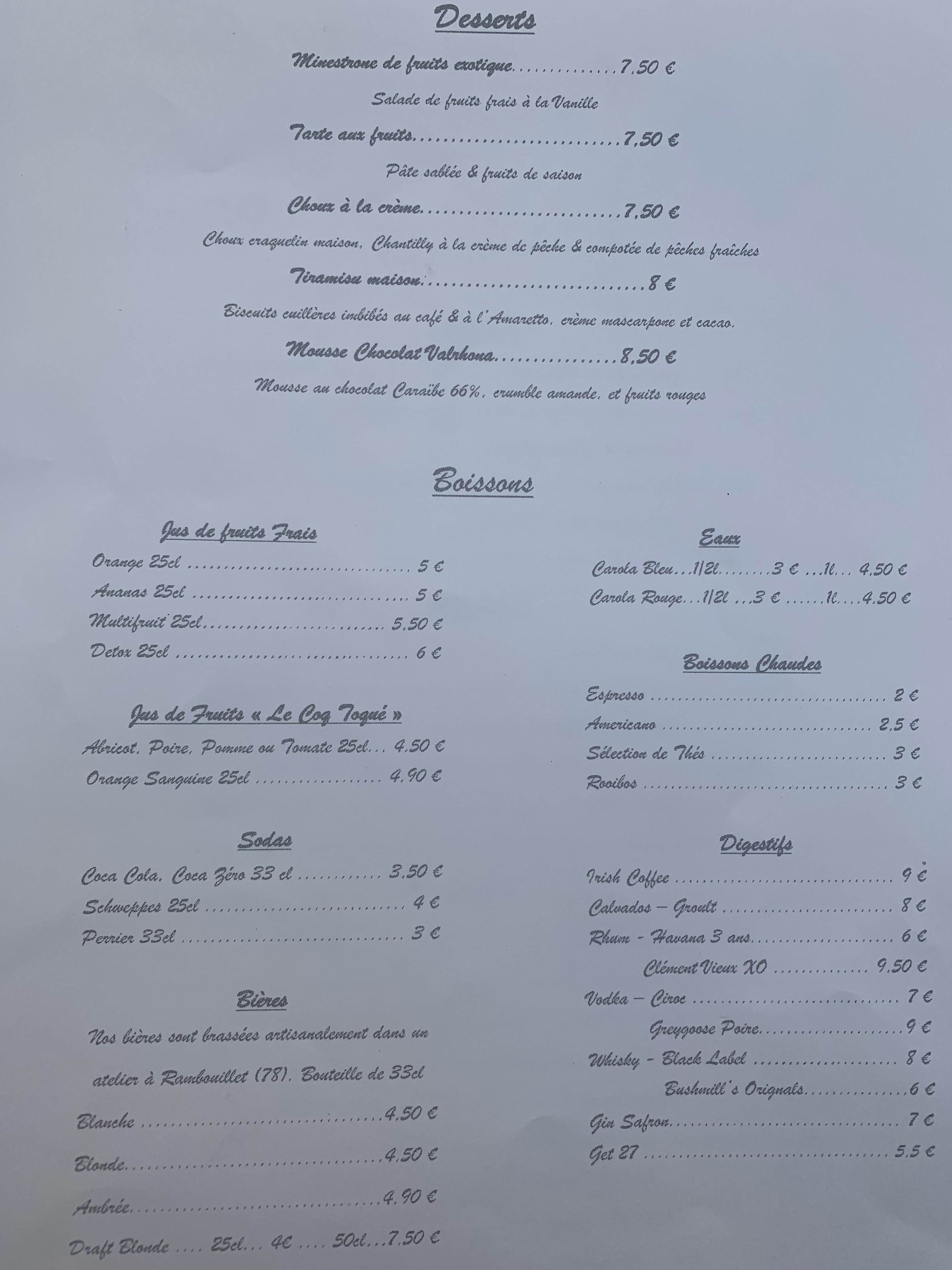 Super restaurant. Hôtes hyper sympas et professionnels. Pour notre premier dîner avec les nouveaux propriétaires : civet de sanglier cuisiné dans le respect du goût du gibier, plateau de fromages convivial, dessert riz au lait coulis de mangue et pour les amoureux de chocolat un croustillanttout choco...un régal pour finir le repas, et une carte des vins tout à fait honorable ainsi que des bières locales (Rambouillet).