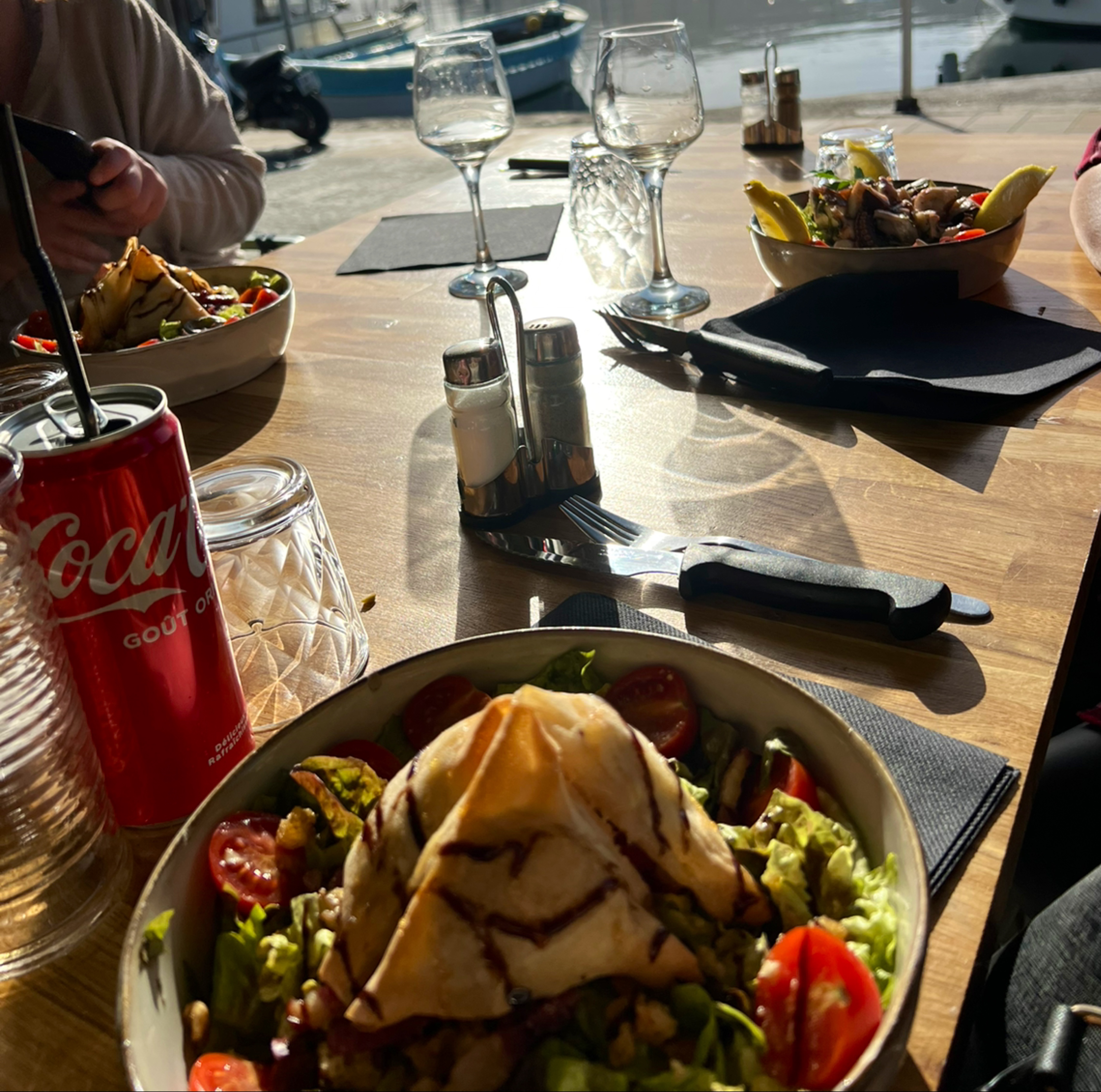 Bonne adresse au bout du port, excellent accueil, carte appétissante, mais qui mériterait quelques ajustements, par exemple les aumônières en entrées mériteraient d'être servies comme les beignets de fromage et pas en salade, ou la sauce pesto roquette des penne qui devient fade après quelques bouchées, dès que le palais s'est habitué au piquant.
