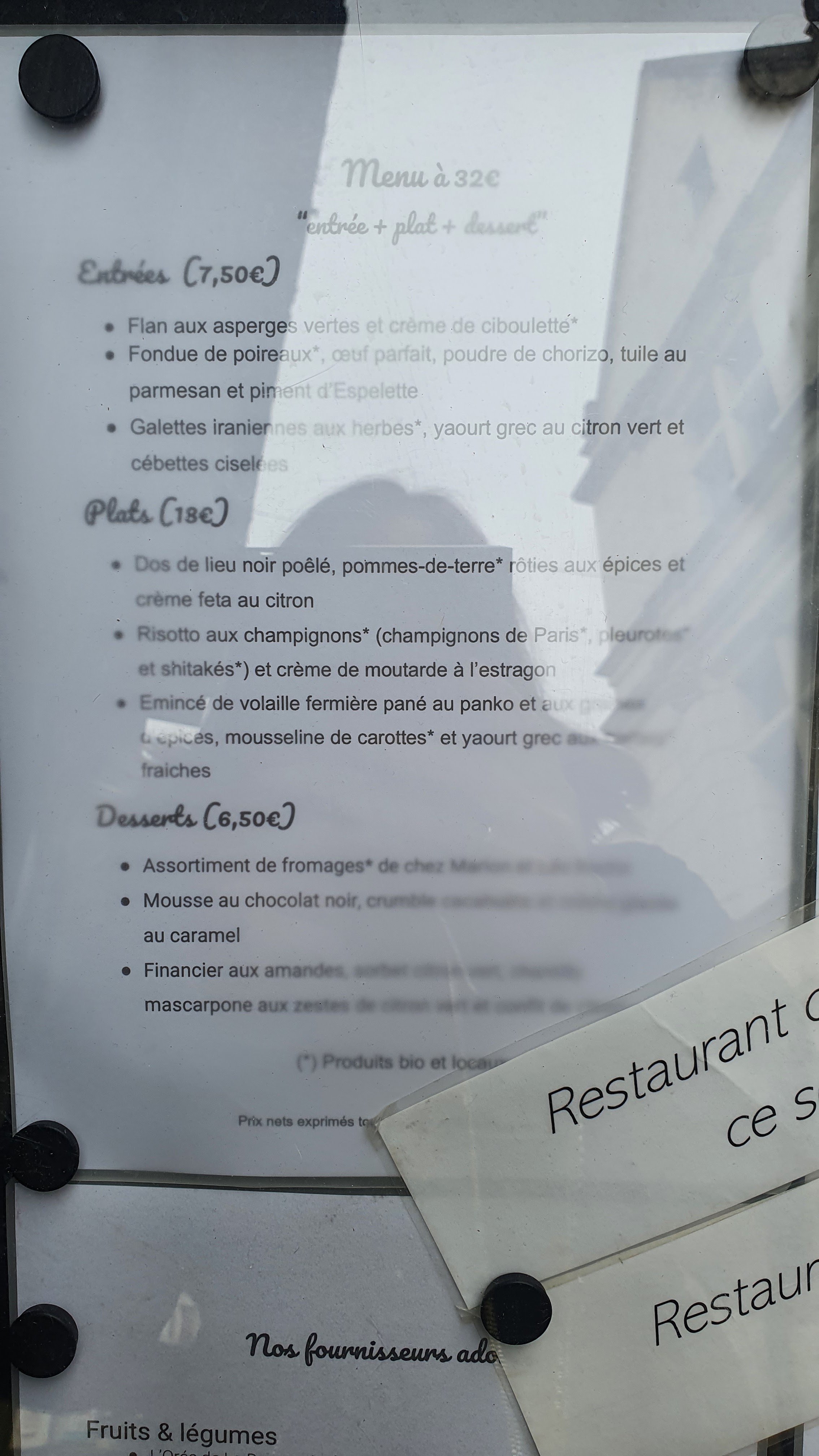 La carte de ce restaurant change régulièrement. Nos plats étaient délicieux de l'entrée au dessert. Service parfait et personnel fort sympathique. Allez-y les yeux fermés mais pensez à reserver !