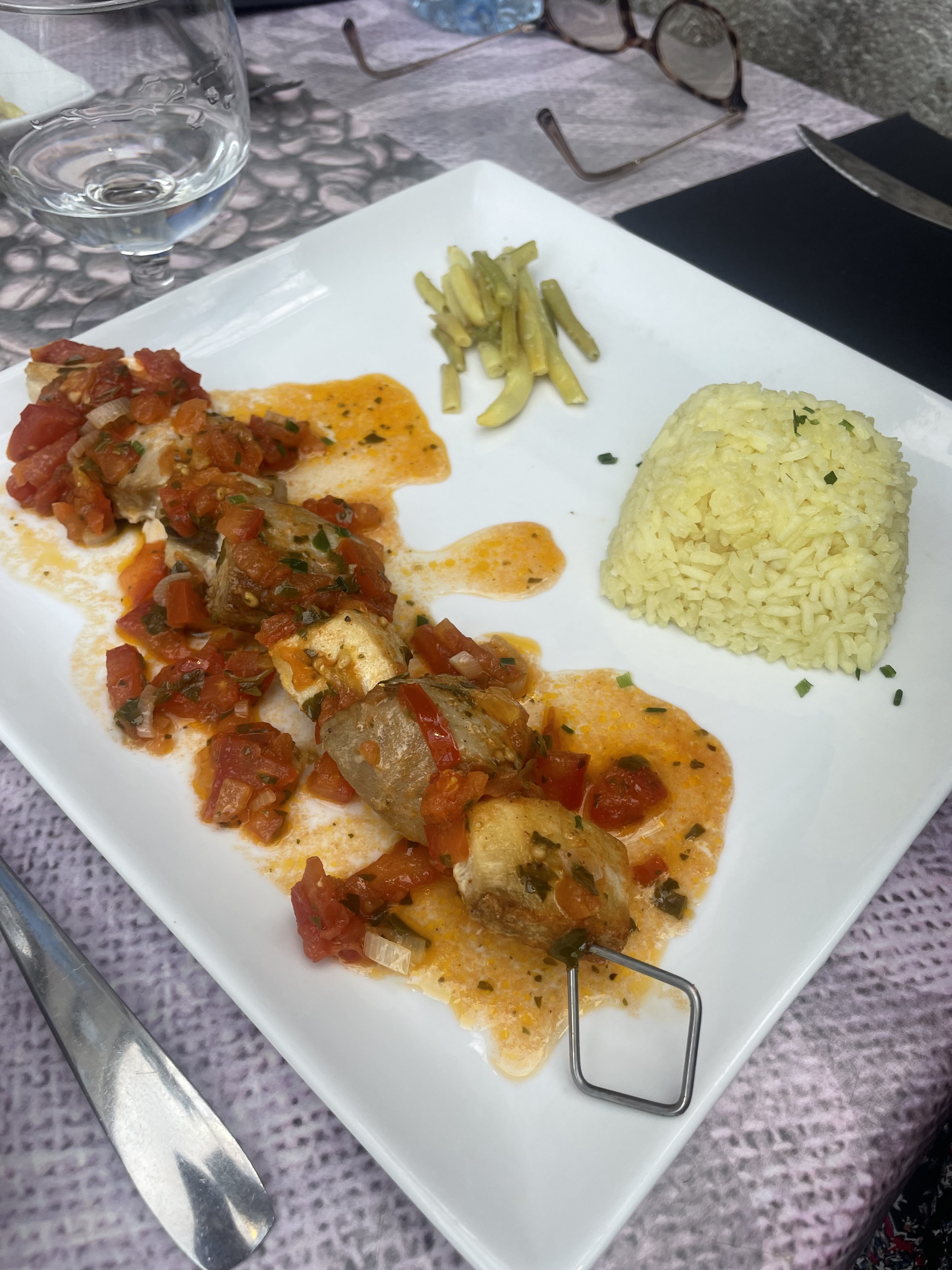 Menu du jour , salade de tomates a la bourrata indipide, maquereaux pas frais riz sans goût et dur, dessert tatin aux abricots tres quelconque nous sommes tres decus de cette étape ou les avis pourtant a 4,6 nous ont donné envie de nous arrêter. Nous déconseillons